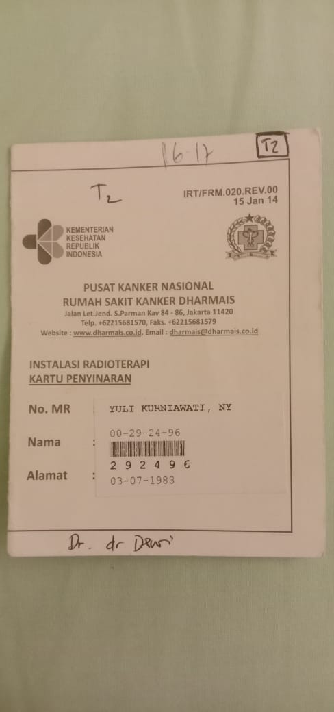 Ketika aku periksa ke dokter, katanya benjolan ini harus dibedah. Tapi aku nggak bisa langsung operasi karena nggak ada biayanya. 2 bulan kemudian aku baru bisa operasi di RSU Indramayu. Aku kaget melihat hasil lab yang menyatakan kalau ini tumor ganas. Jadi aku harus dirujuk ke RS Kanker Dharmais. Sekarang aku sedang menjalani pemulihan setelah operasi, dengan pengobatan sinar radiasi.