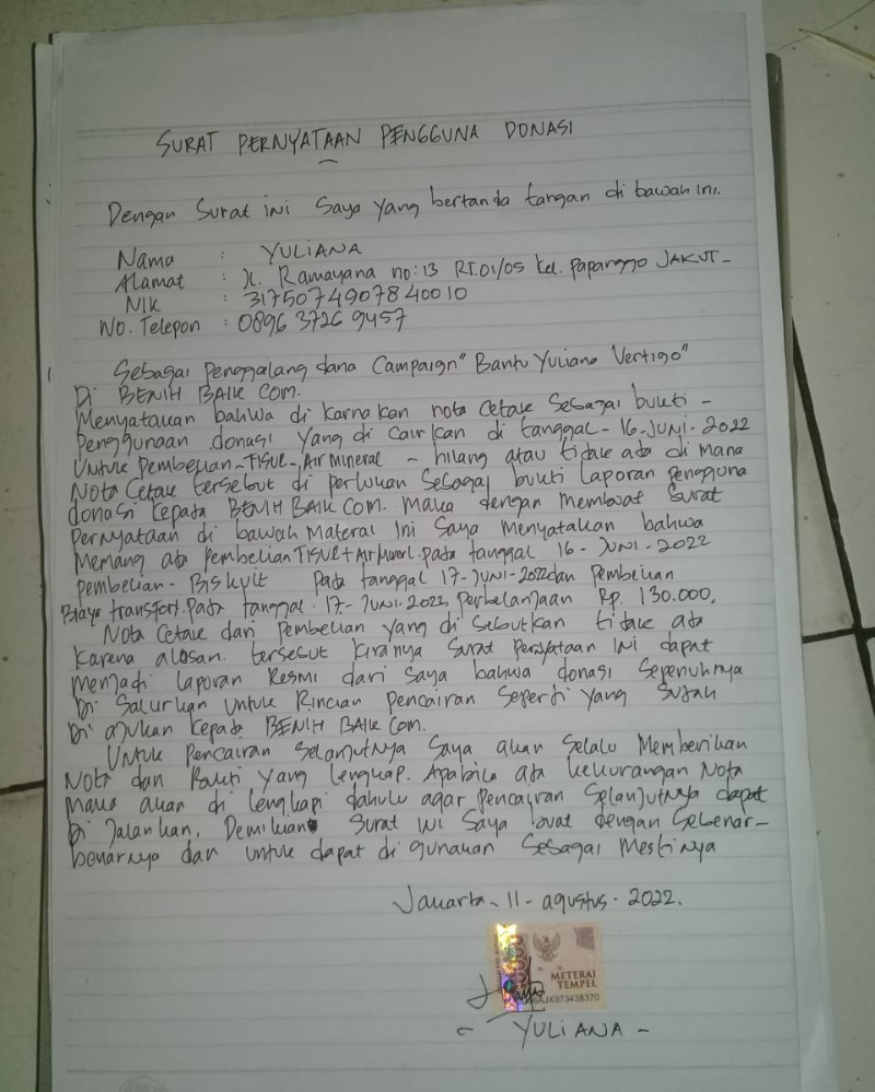 Donasi dari TemanBaik sudah digunakan dengan baik untuk keperluan Yuliana. Kondisinya kini masih sering sakit di bagian kepalanya. Mohon doanya ya TemanBaik semoga lekas diberi kesembuhan.