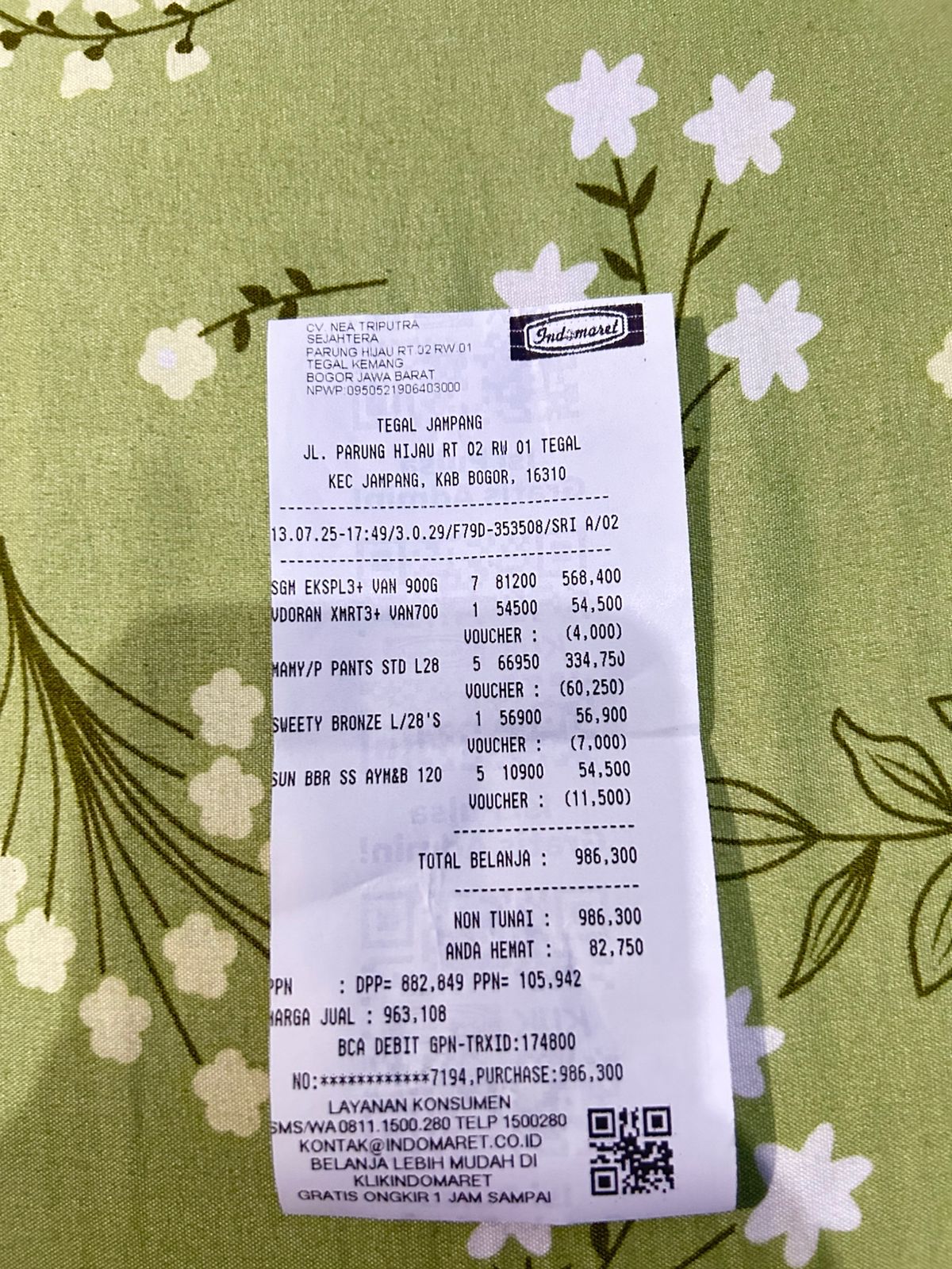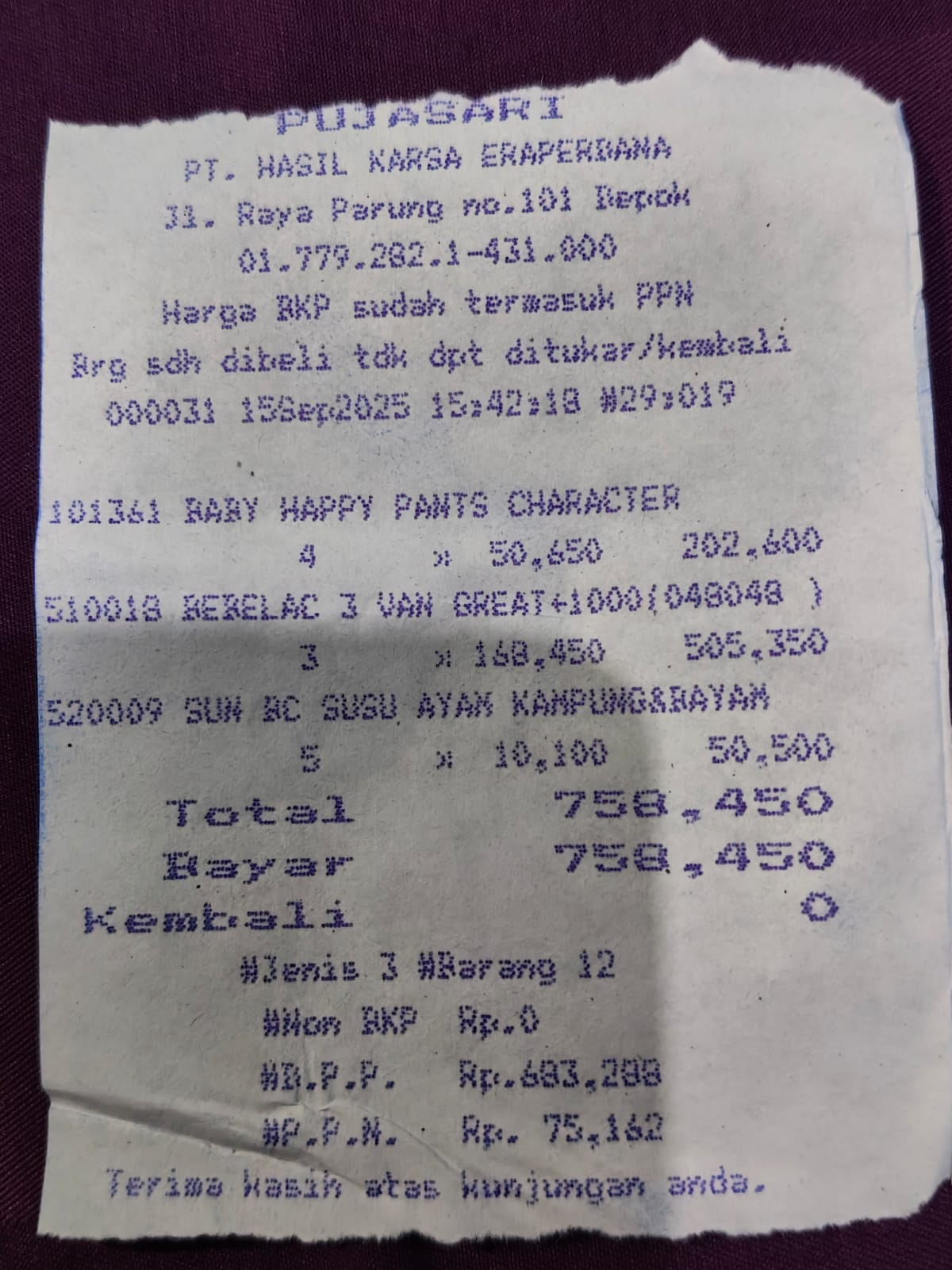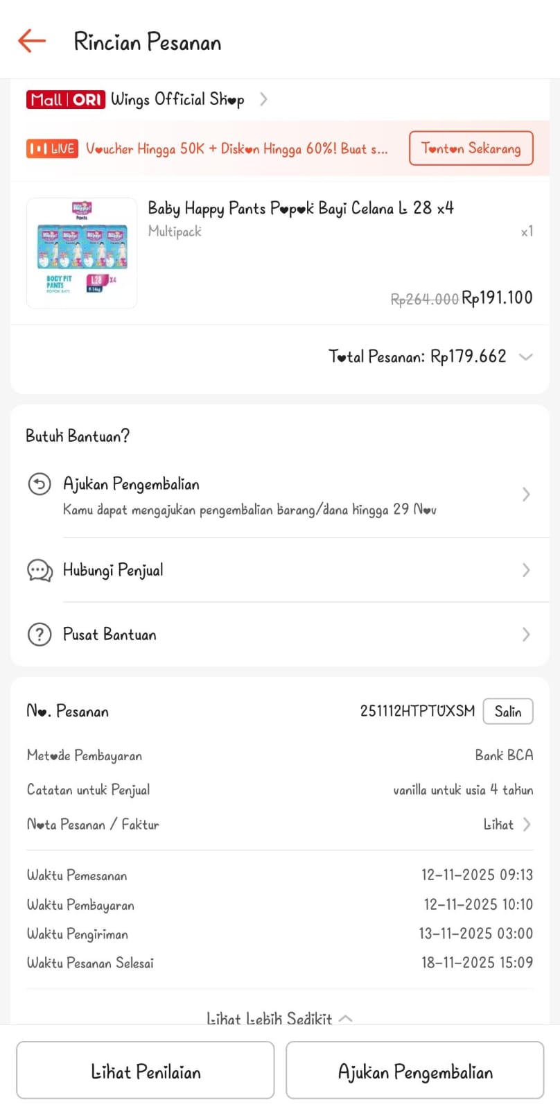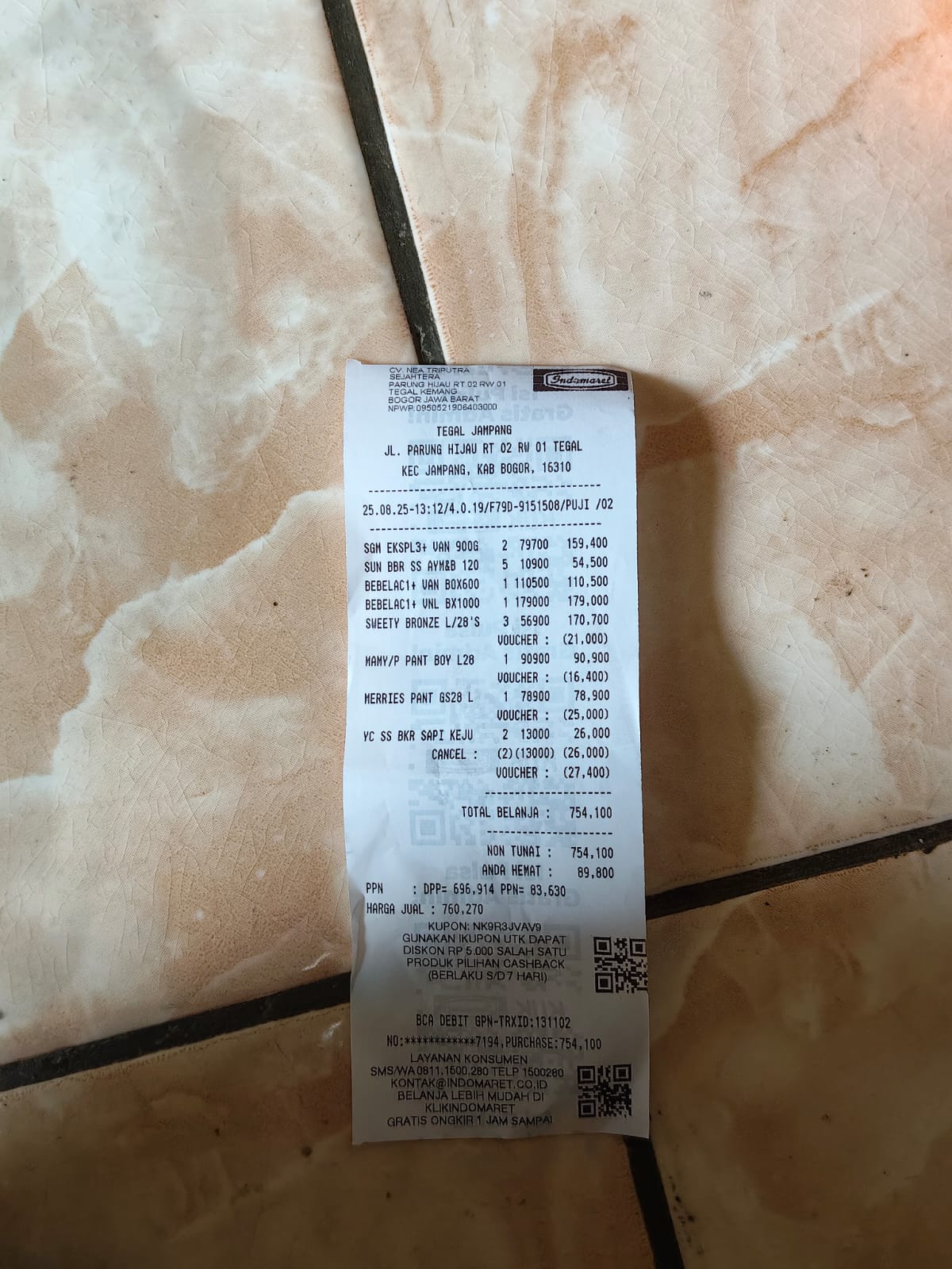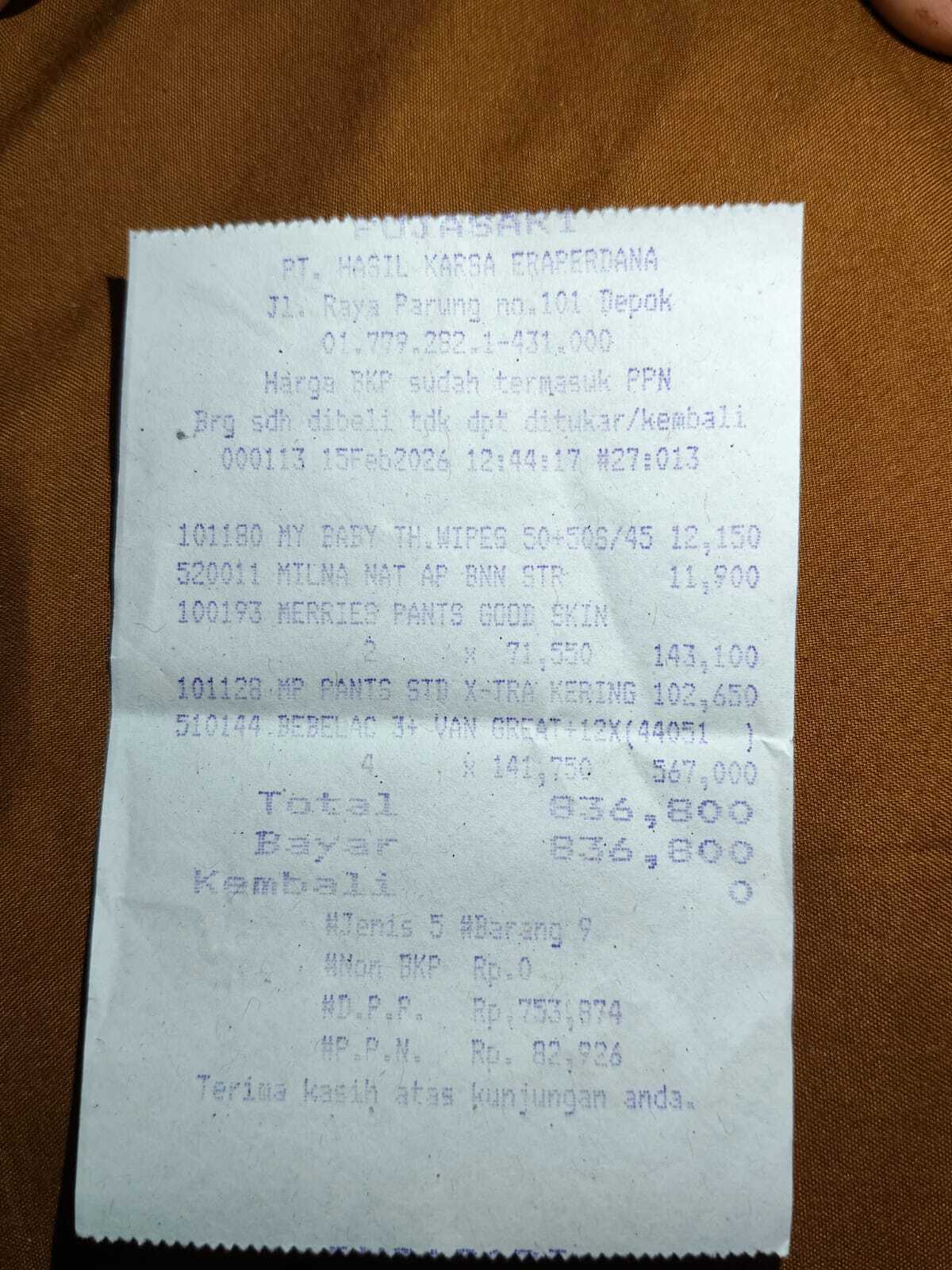 Dana digunakan untuk 1. Pampers baby happyL28 4 ball Rp179.369 2. Susu bebelac vanilla 3 dus Rp1.349.5312025-11-13 09:15:31
