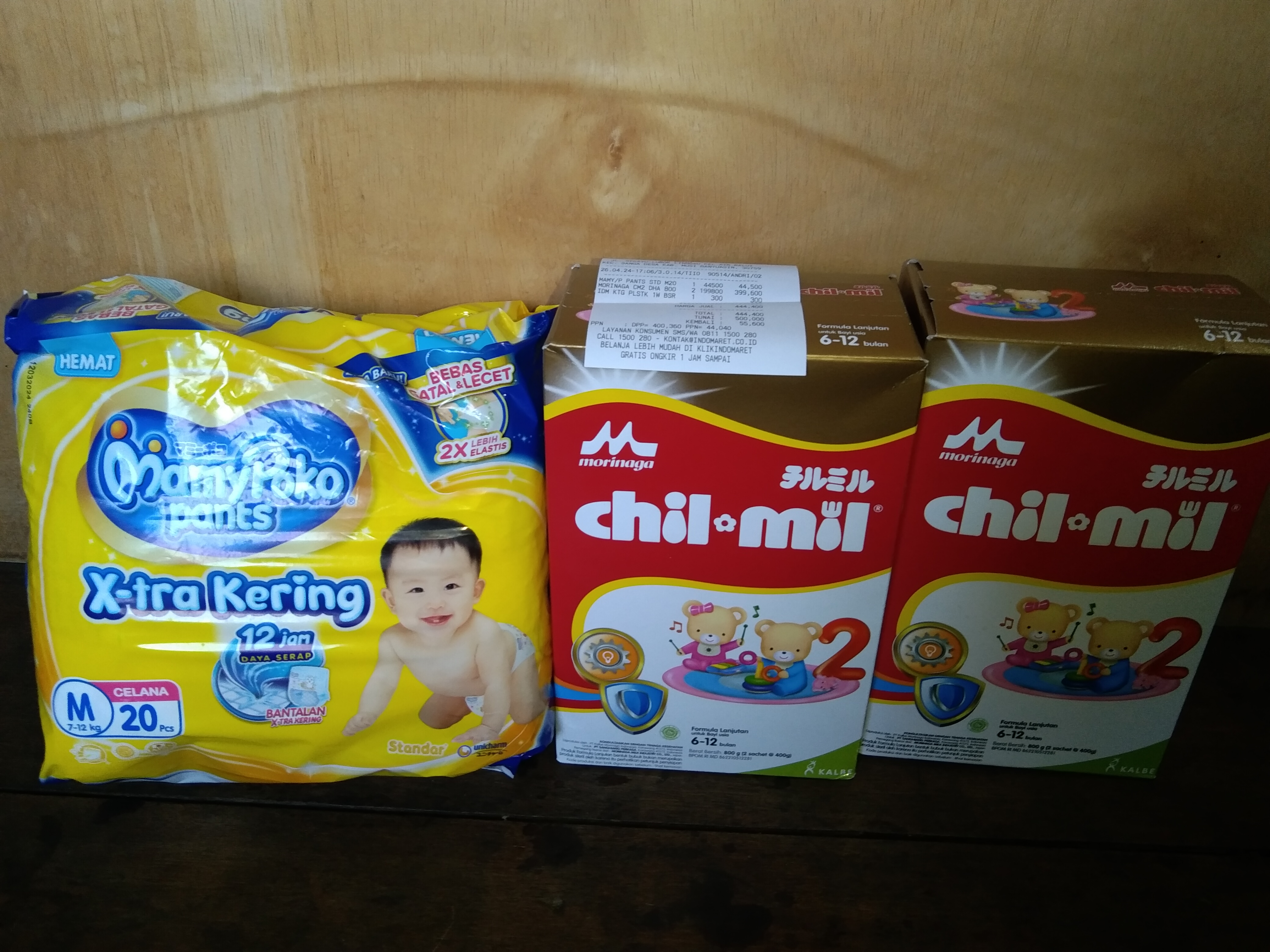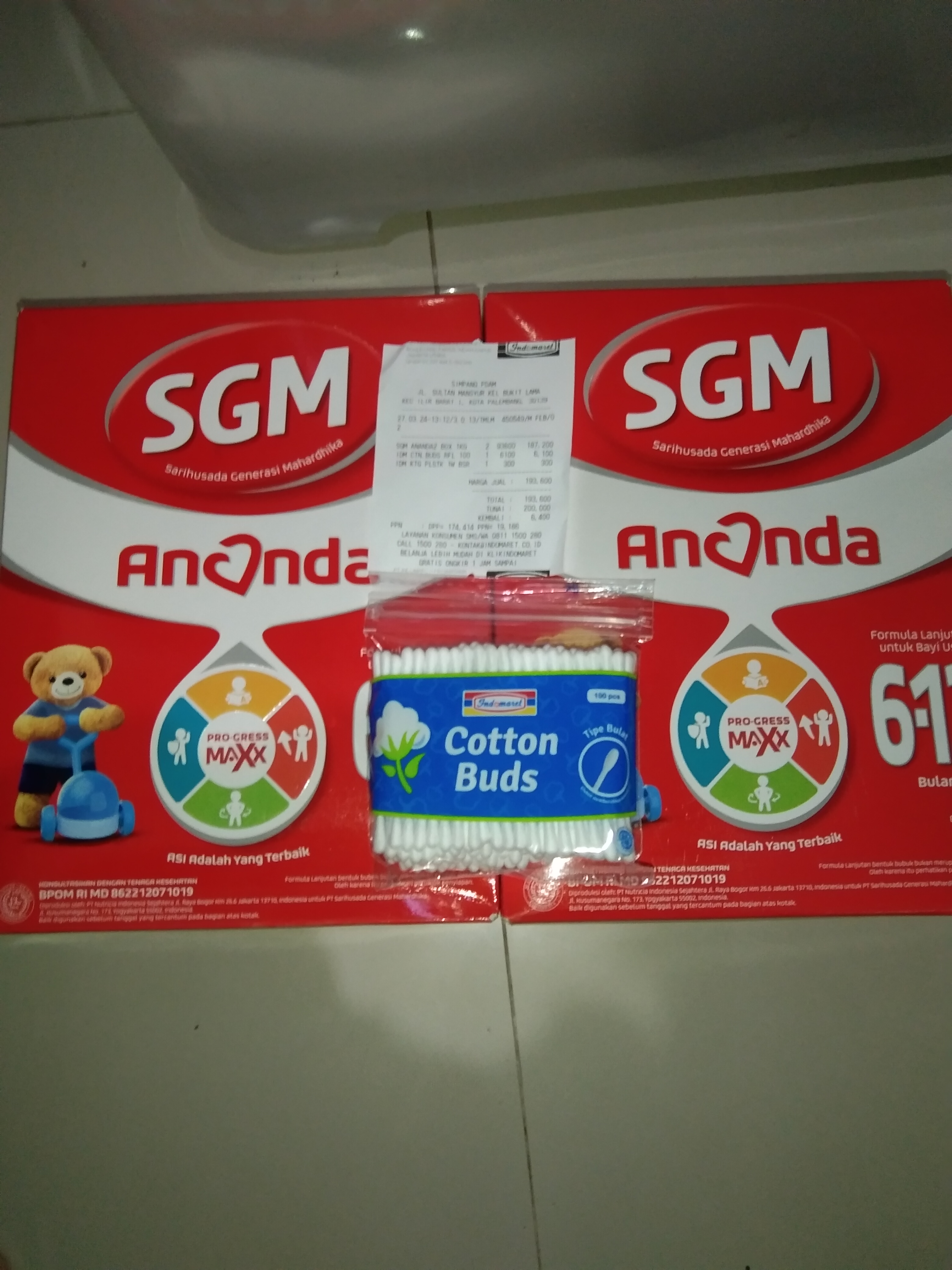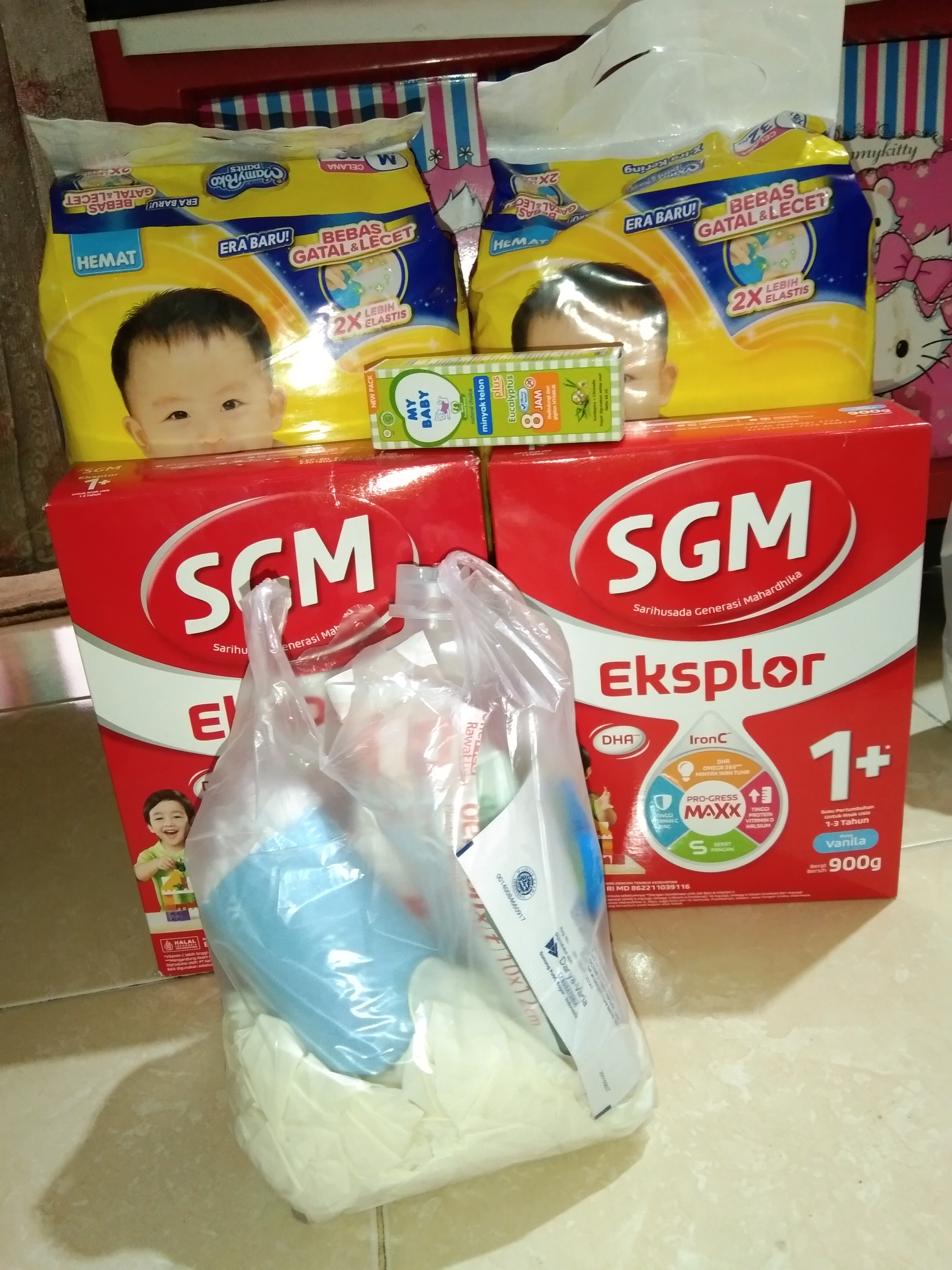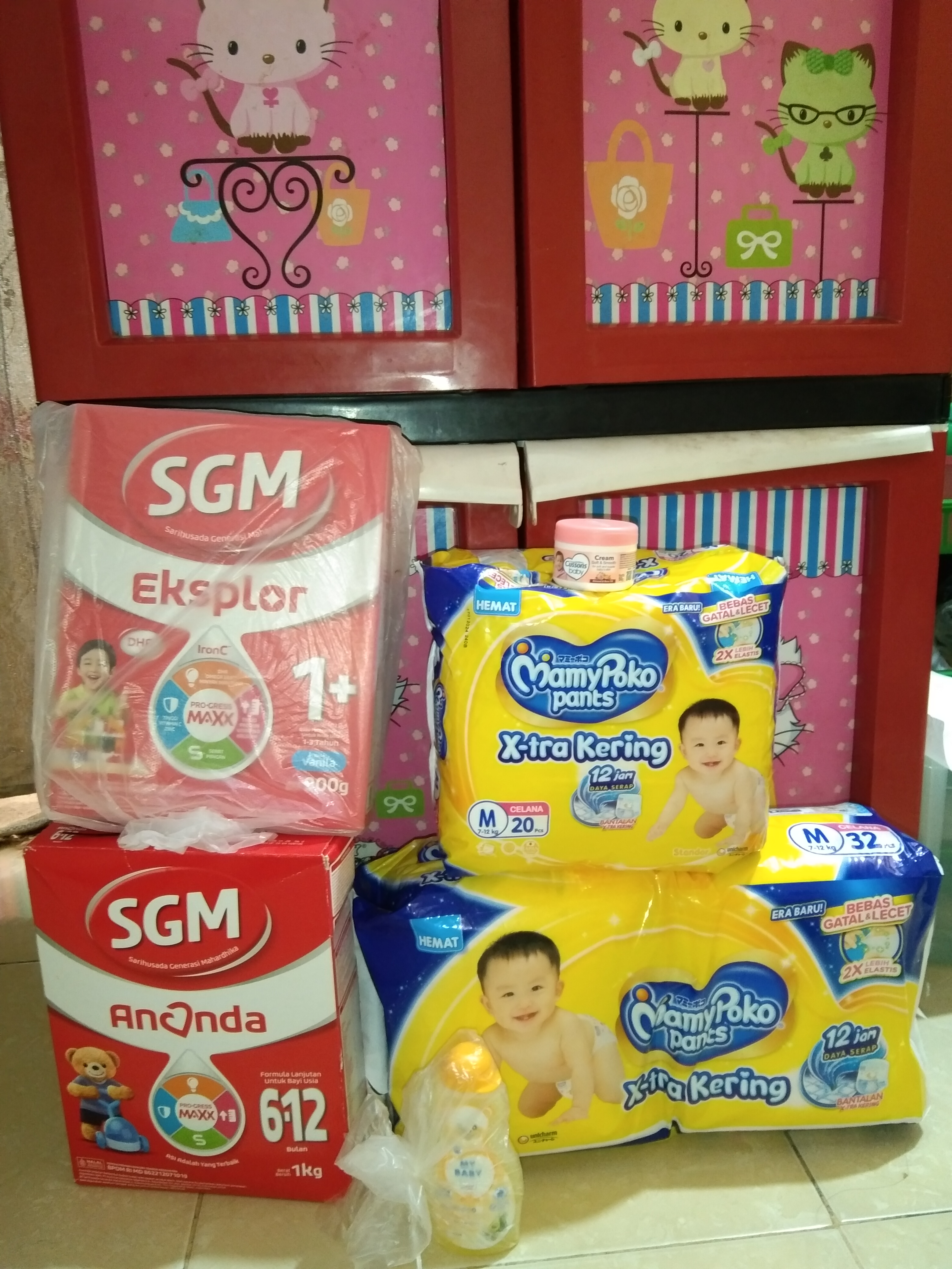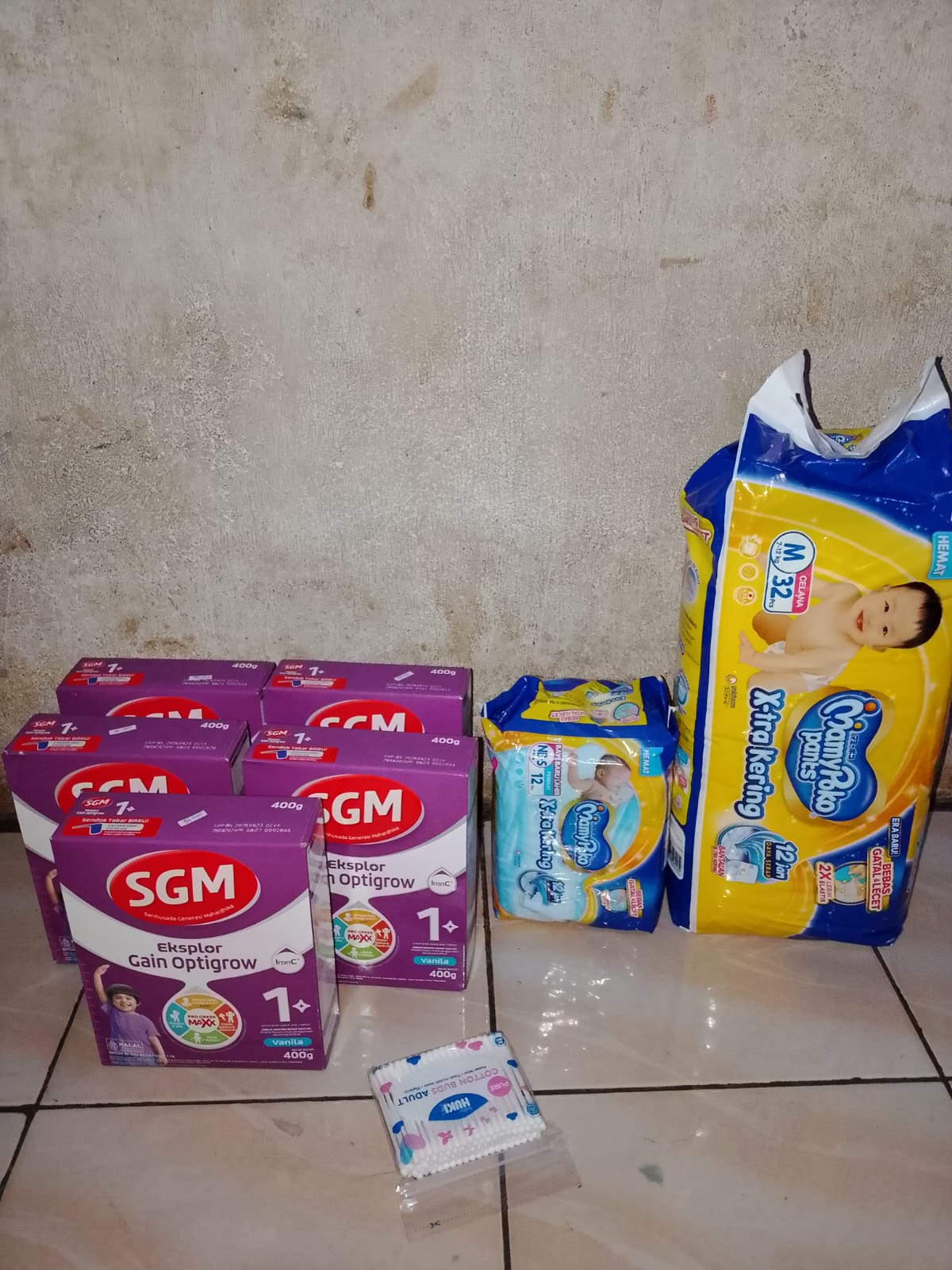 Dana digunakan untuk 1. Susu SGM Ananda Gain 100 400 gr 115.000 x 5 kotak= Rp557.000 2. Susu SGM Ananda 1000 gr 103.000 x 5 kotak= Rp515.000 3. Pampers Moko-moko ukuran M 54.000 x 5 ball= Rp270.000 4. Minyak telon plus 32.000 x 6= Rp188.000 5. Tisu basah kodomo 12.000 x 10= Rp120.000 6. Tisu kering nice 46.000 x 5= Rp230.000 7. Bubur Sun beras merah ukuran 120 gr 1 dus Rp175.000 8. Vitamin Prolacta bayi 70.000 x 2= Rp140.000 9. Sampo Zwitsal 21.000 x 5= Rp105.000 10. Bedak My baby2024-01-04 17:17:13