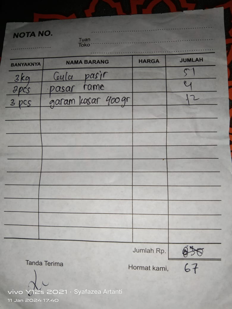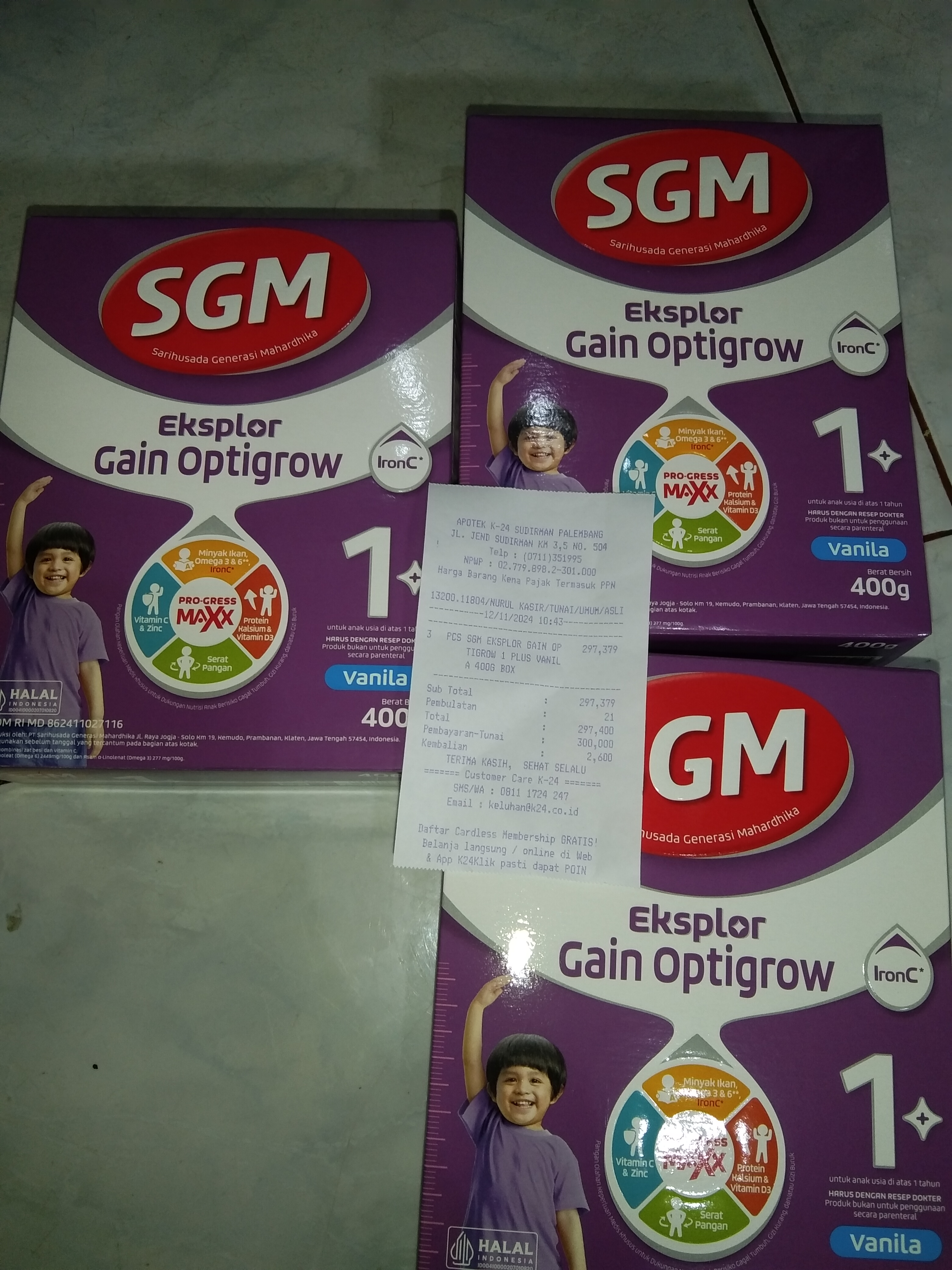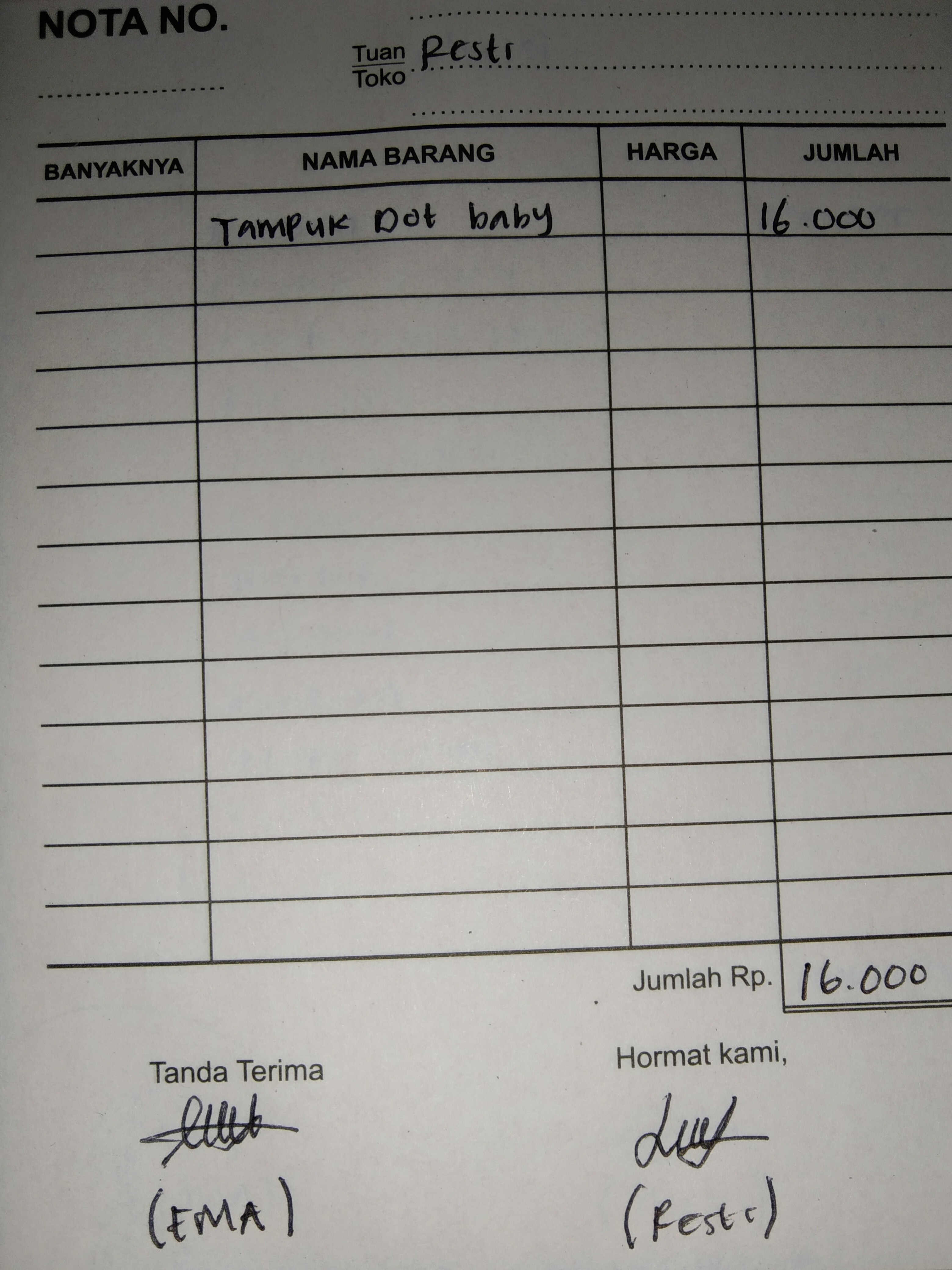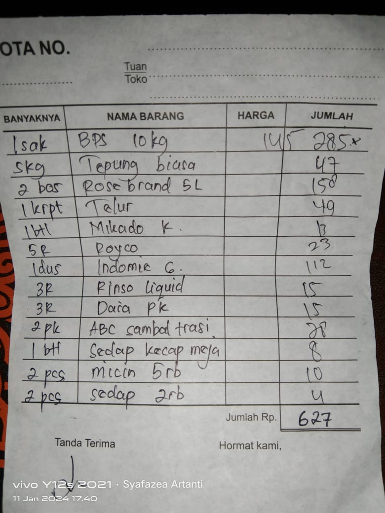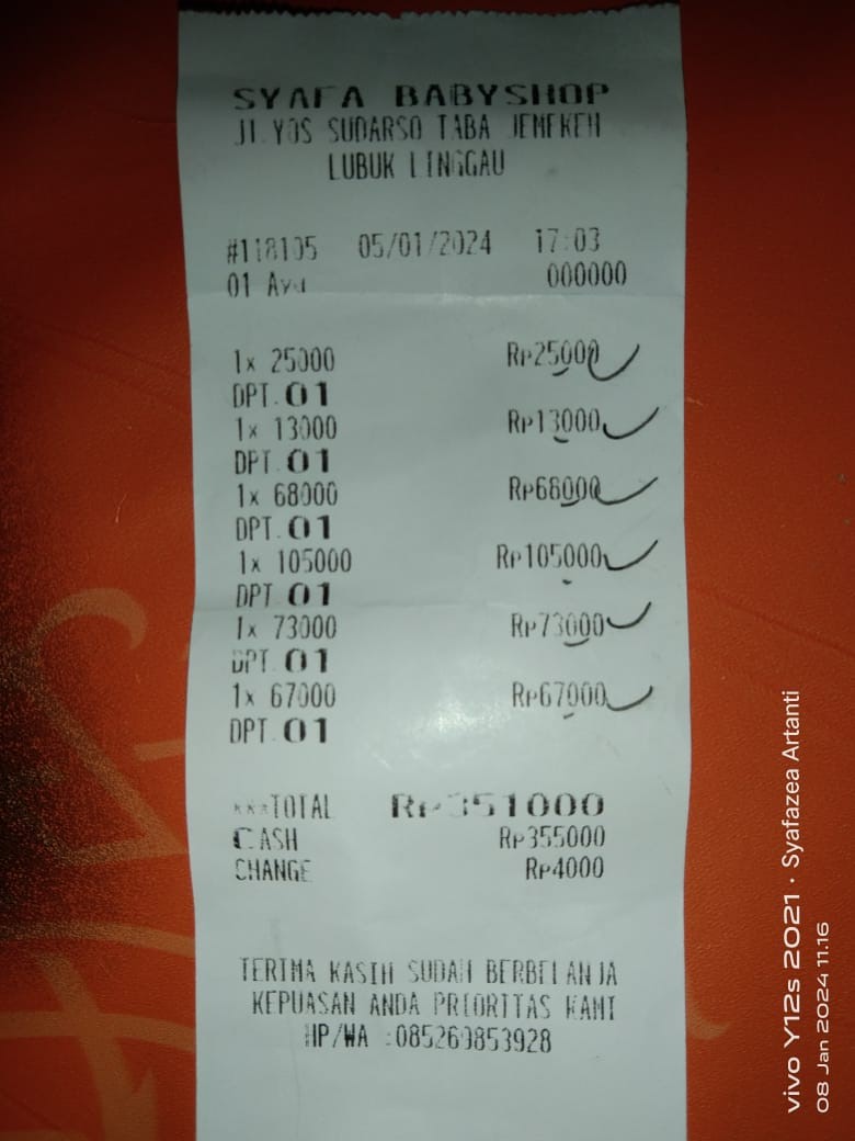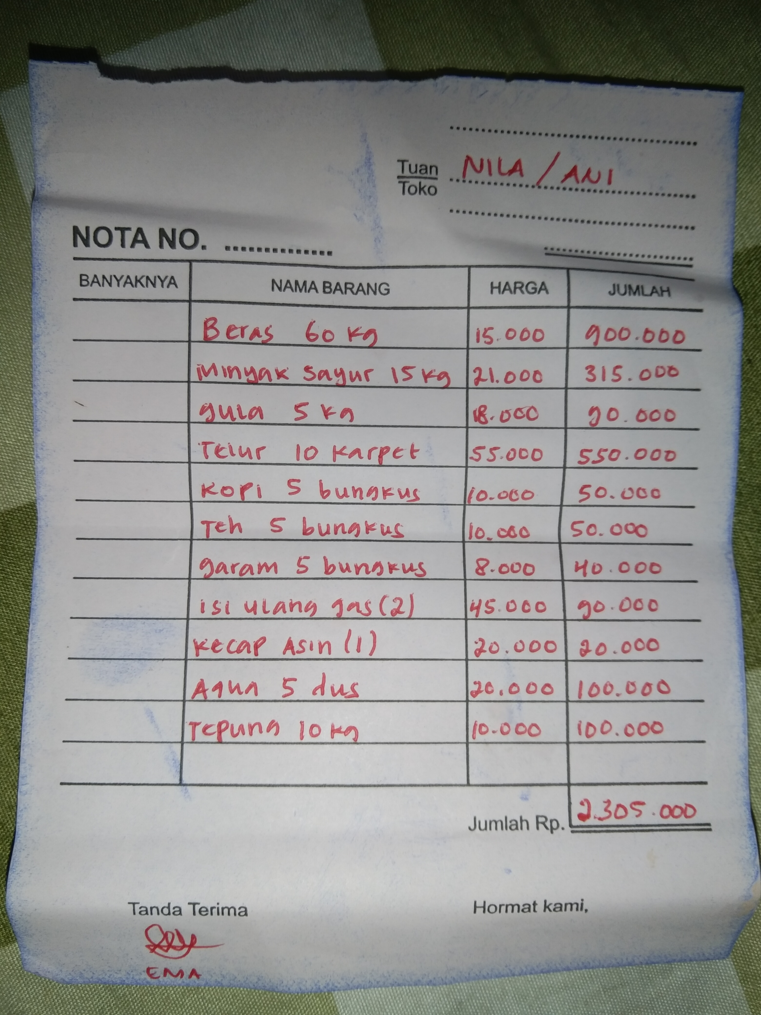 Dana digunakan untuk 1. Susu SGM Ananda Gain 100 400 gr 115.000 x 5 kotak= Rp557.000 2. Susu SGM Ananda 1000 gr 103.000 x 5 kotak= Rp515.000 3. Pampers Moko-moko ukuran M 54.000 x 5 ball= Rp270.000 4. Minyak telon plus 32.000 x 6= Rp188.000 5. Tisu basah kodomo 12.000 x 10= Rp120.000 6. Tisu kering nice 46.000 x 5= Rp230.000 7. Bubur Sun beras merah ukuran 120 gr 1 dus Rp175.000 8. Vitamin Prolacta bayi 70.000 x 2= Rp140.000 9. Sampo Zwitsal 21.000 x 5= Rp105.000 10. Bedak My baby2024-01-04 17:17:13