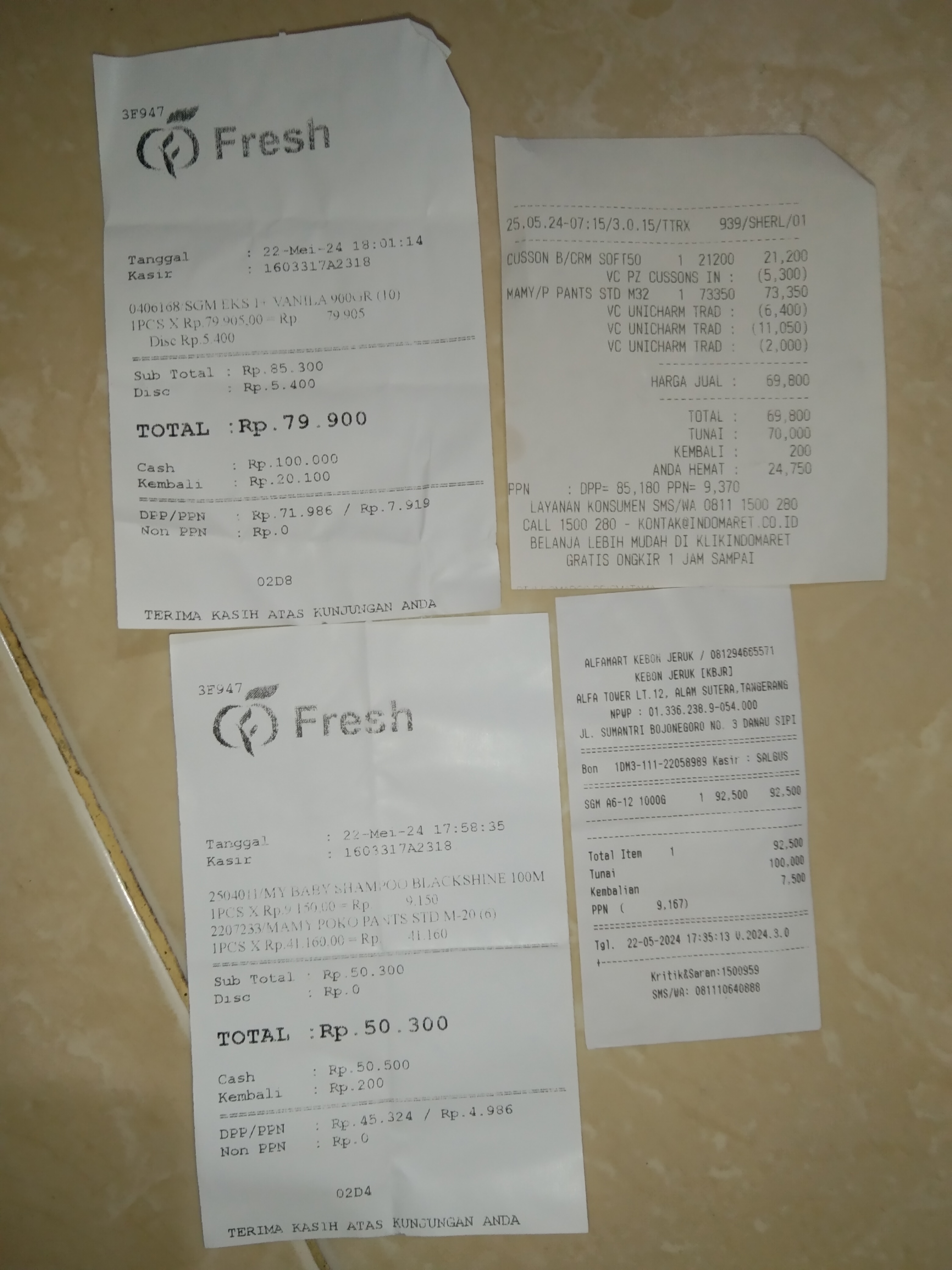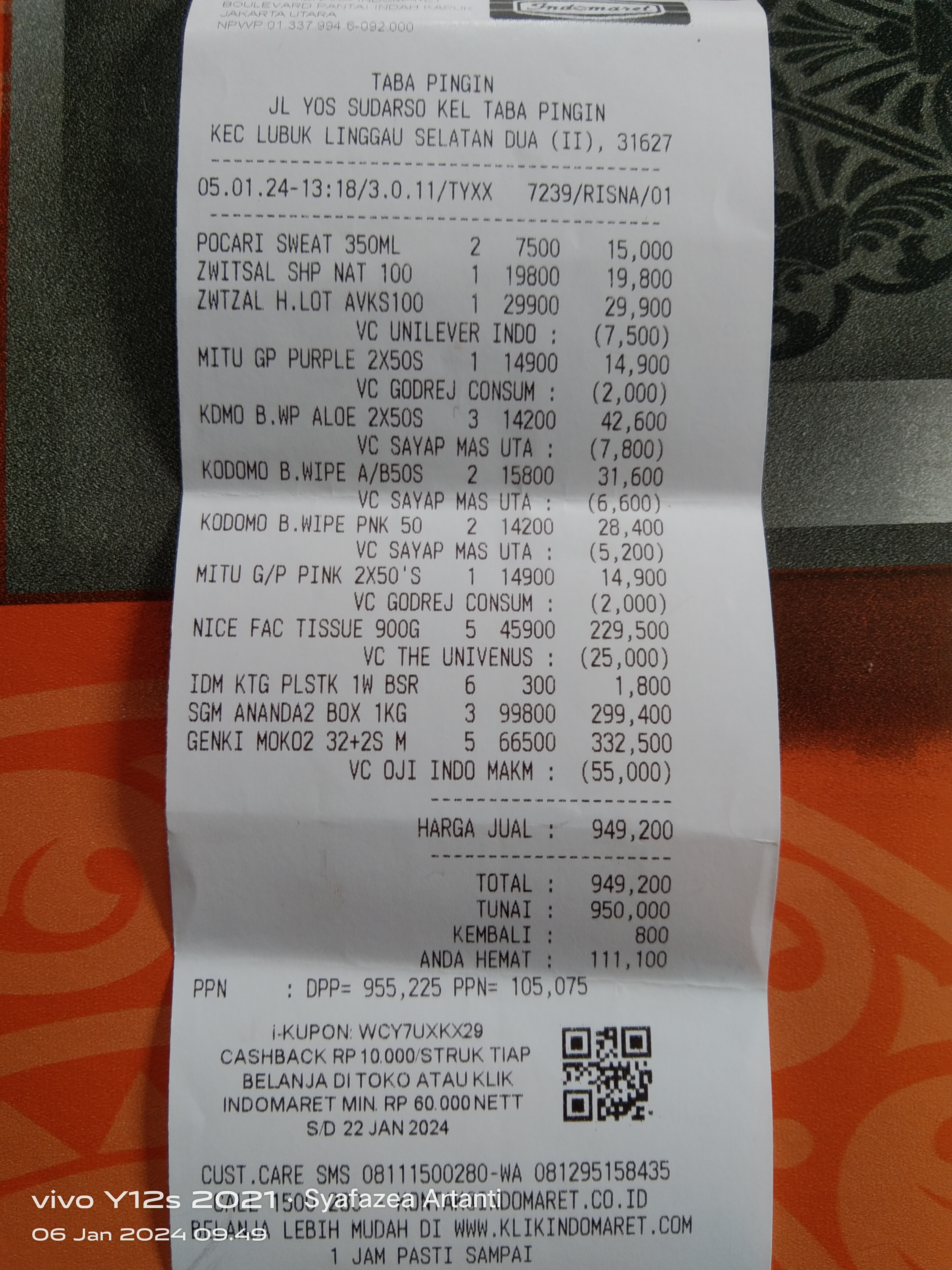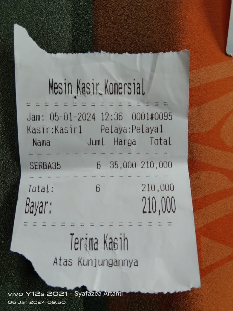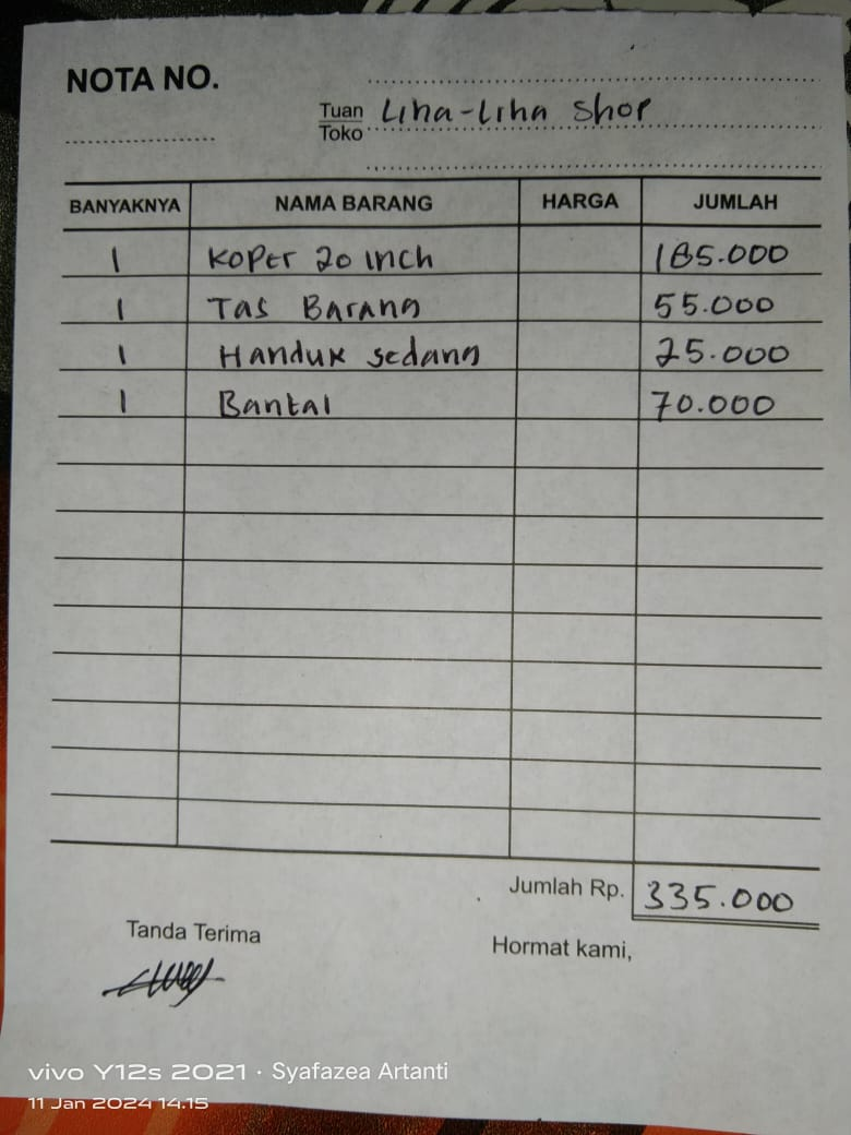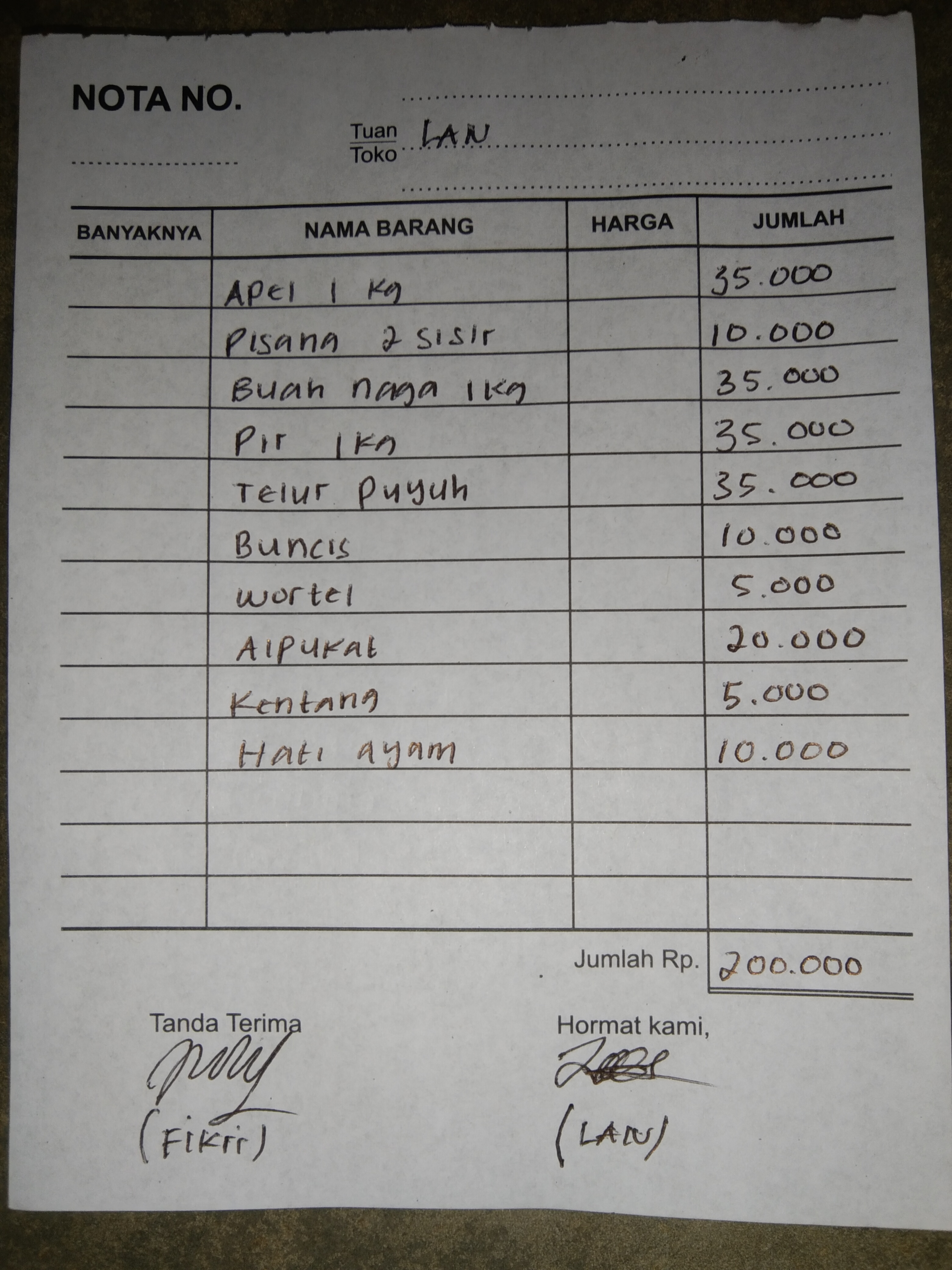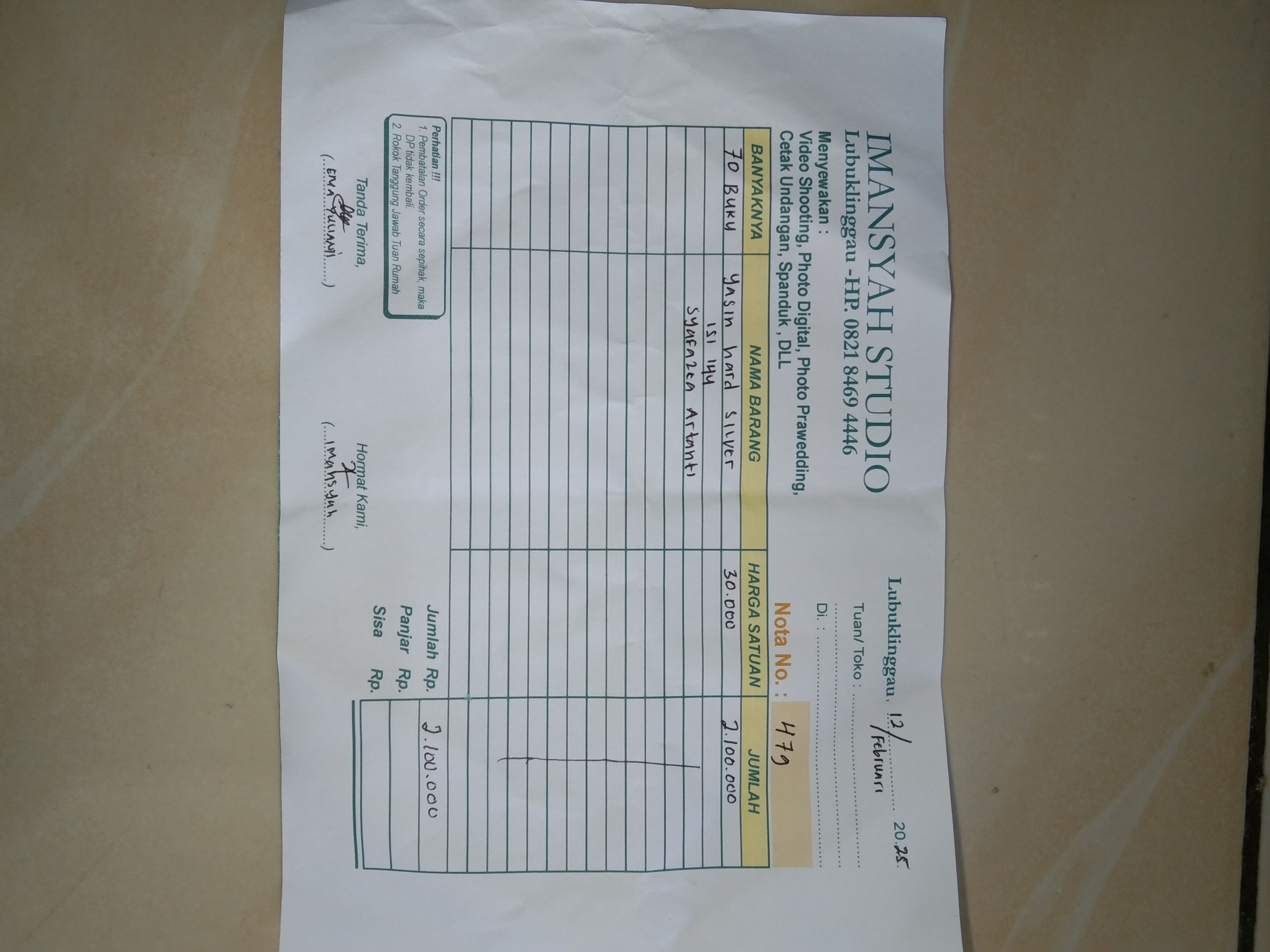 Dana digunakan untuk 1. Susu SGM Ananda Gain 100 400 gr 115.000 x 5 kotak= Rp557.000 2. Susu SGM Ananda 1000 gr 103.000 x 5 kotak= Rp515.000 3. Pampers Moko-moko ukuran M 54.000 x 5 ball= Rp270.000 4. Minyak telon plus 32.000 x 6= Rp188.000 5. Tisu basah kodomo 12.000 x 10= Rp120.000 6. Tisu kering nice 46.000 x 5= Rp230.000 7. Bubur Sun beras merah ukuran 120 gr 1 dus Rp175.000 8. Vitamin Prolacta bayi 70.000 x 2= Rp140.000 9. Sampo Zwitsal 21.000 x 5= Rp105.000 10. Bedak My baby2024-01-04 17:17:13