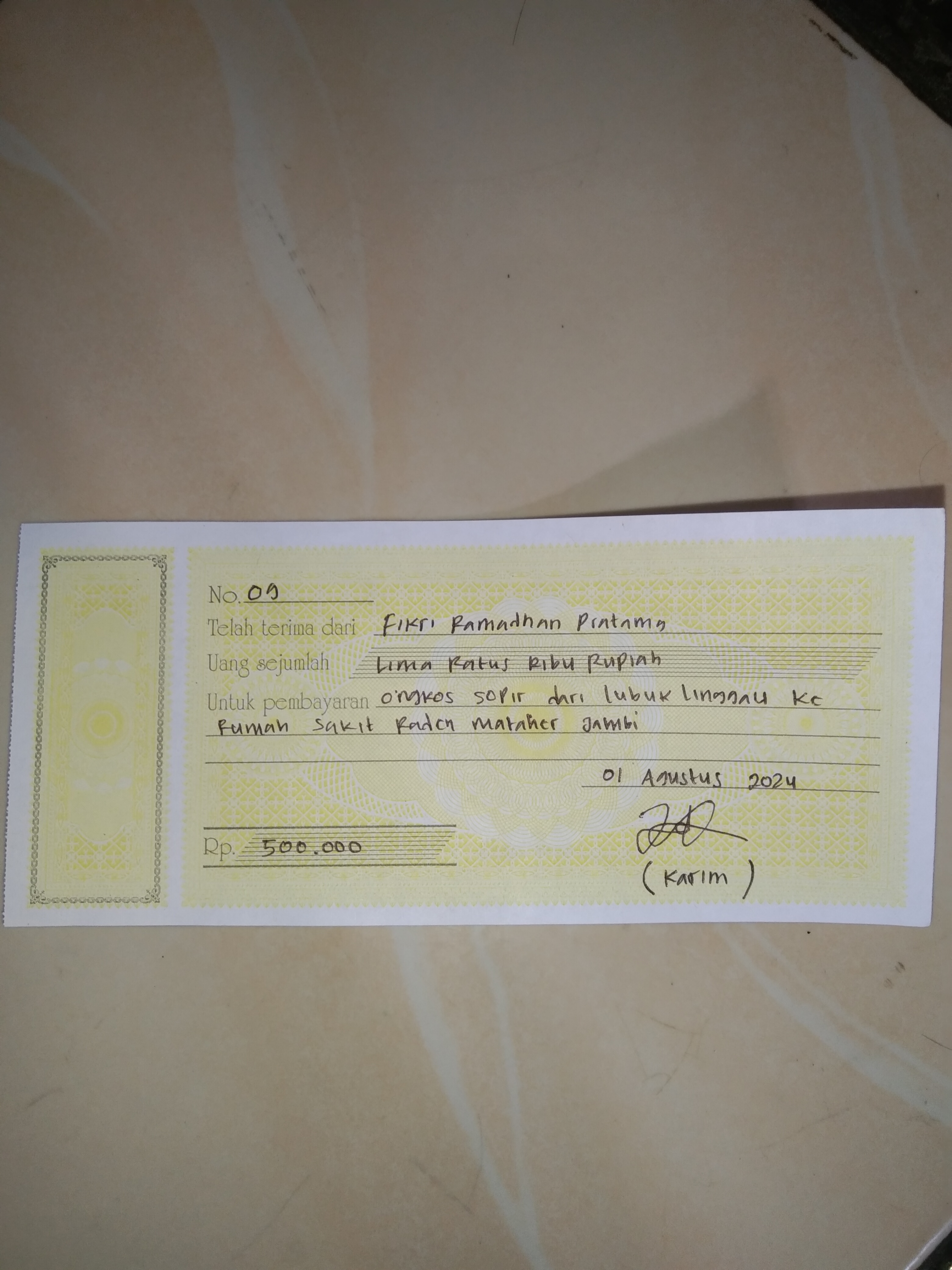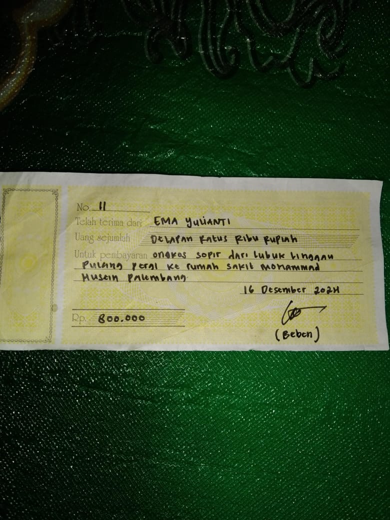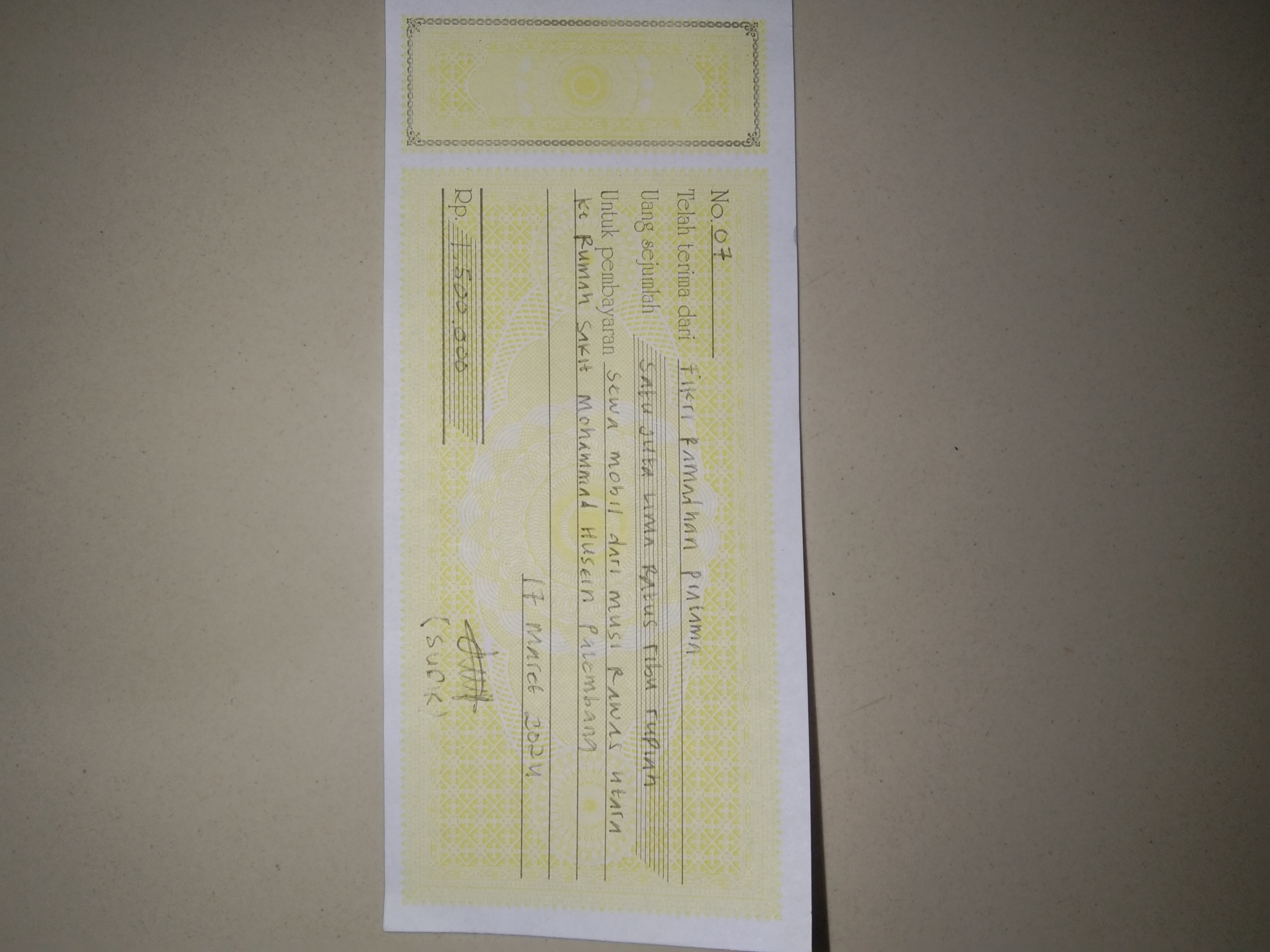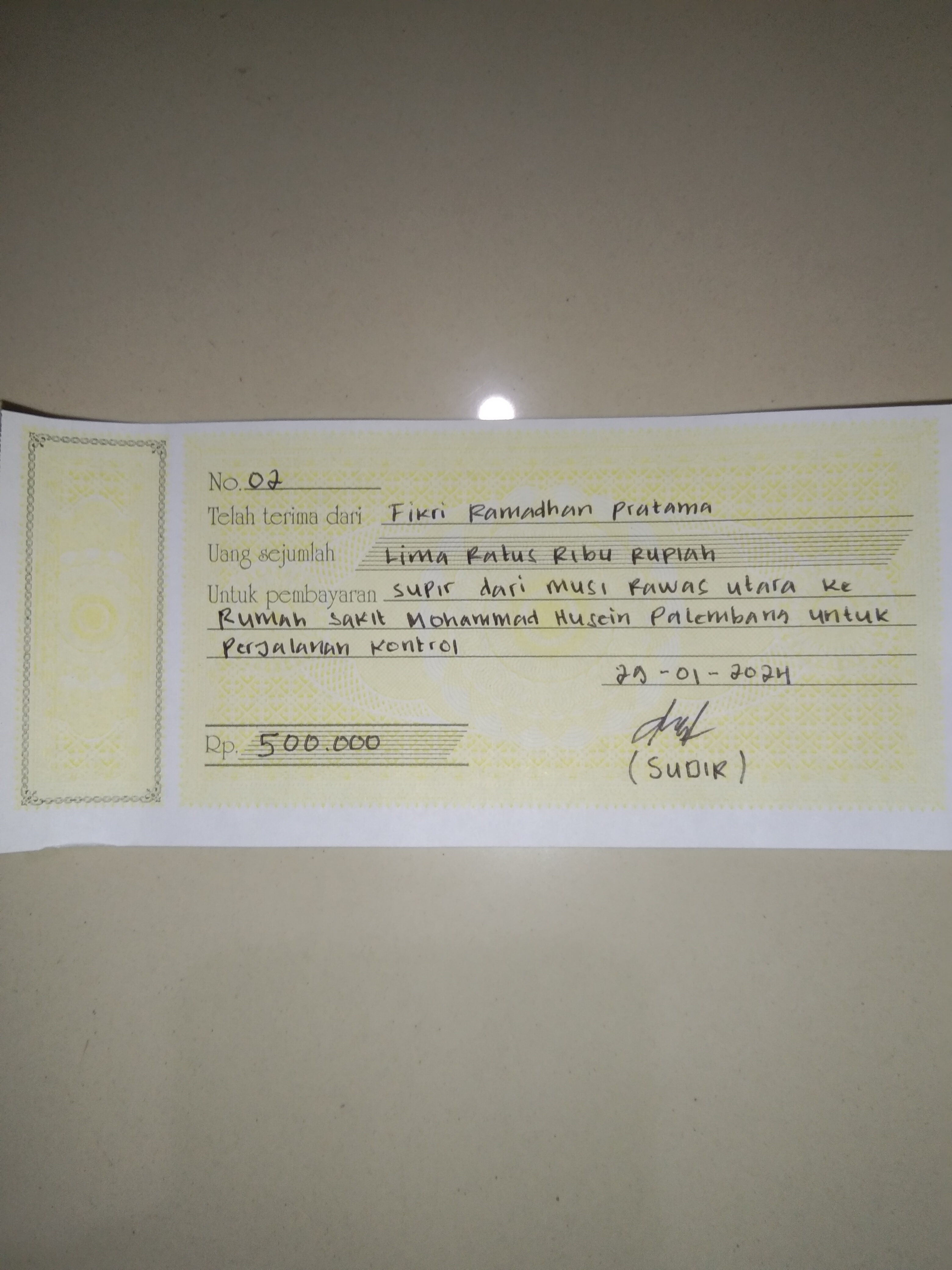 1. Uang sewa mobil untuk kontrol dari Musi Rawas Utara ke rumah sakit Mohammad Husein Rp1.500.000