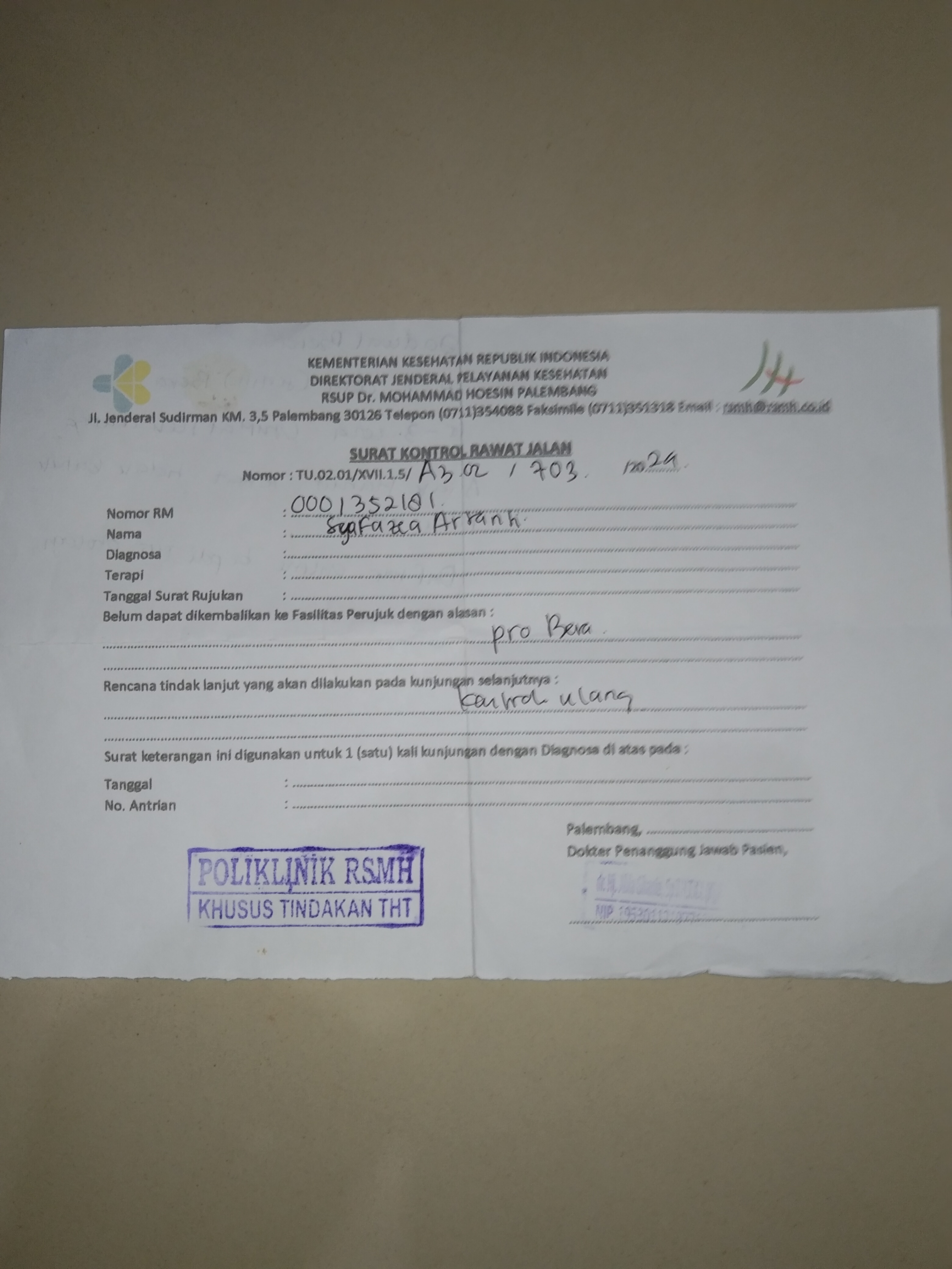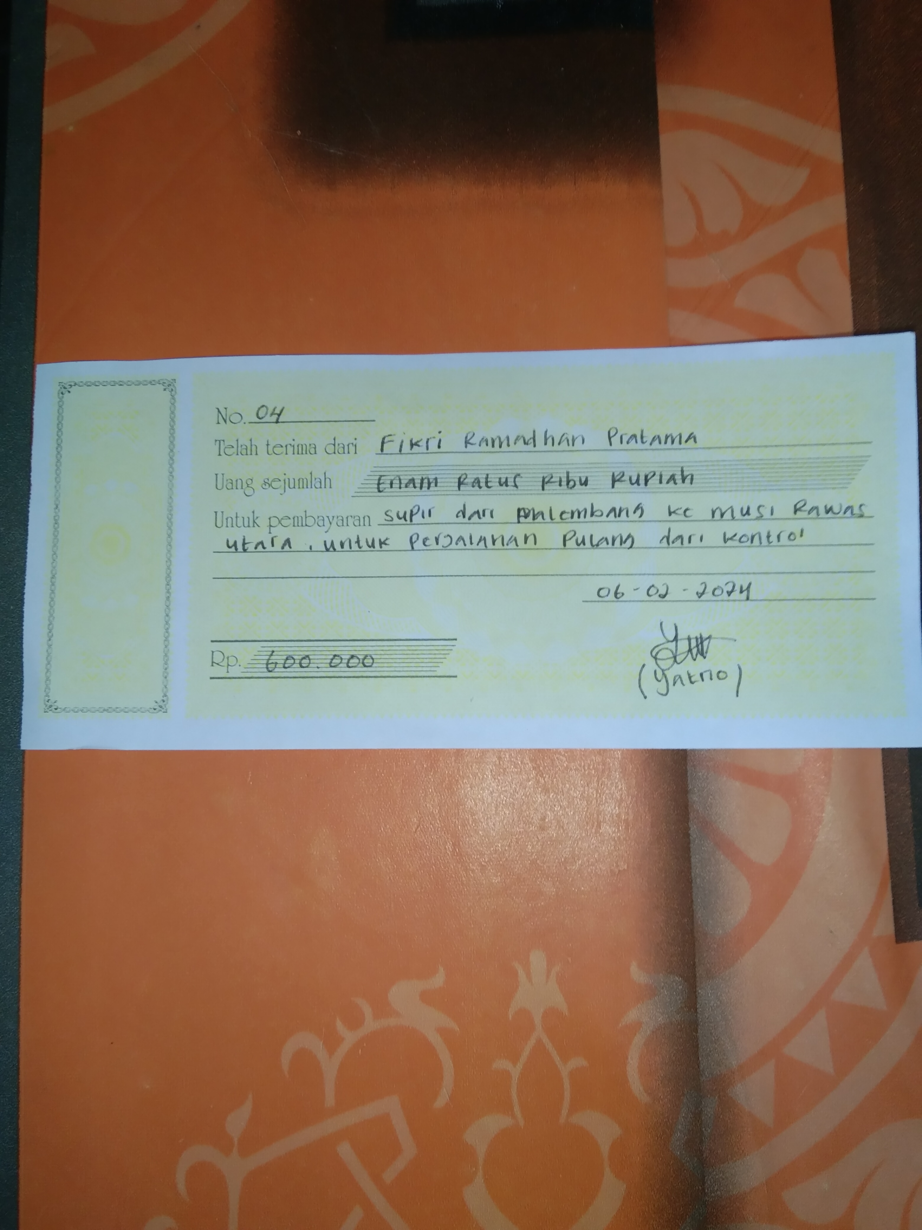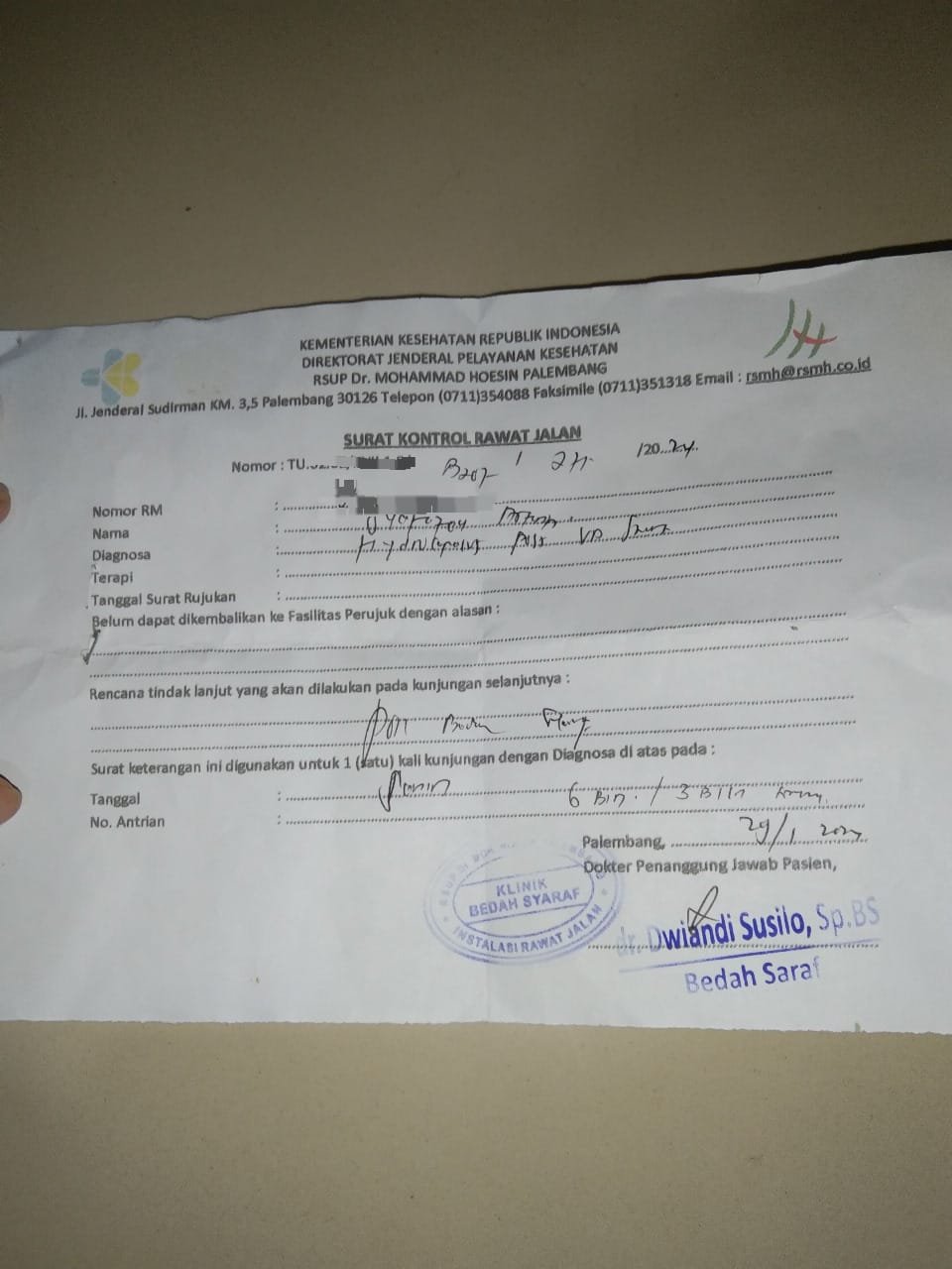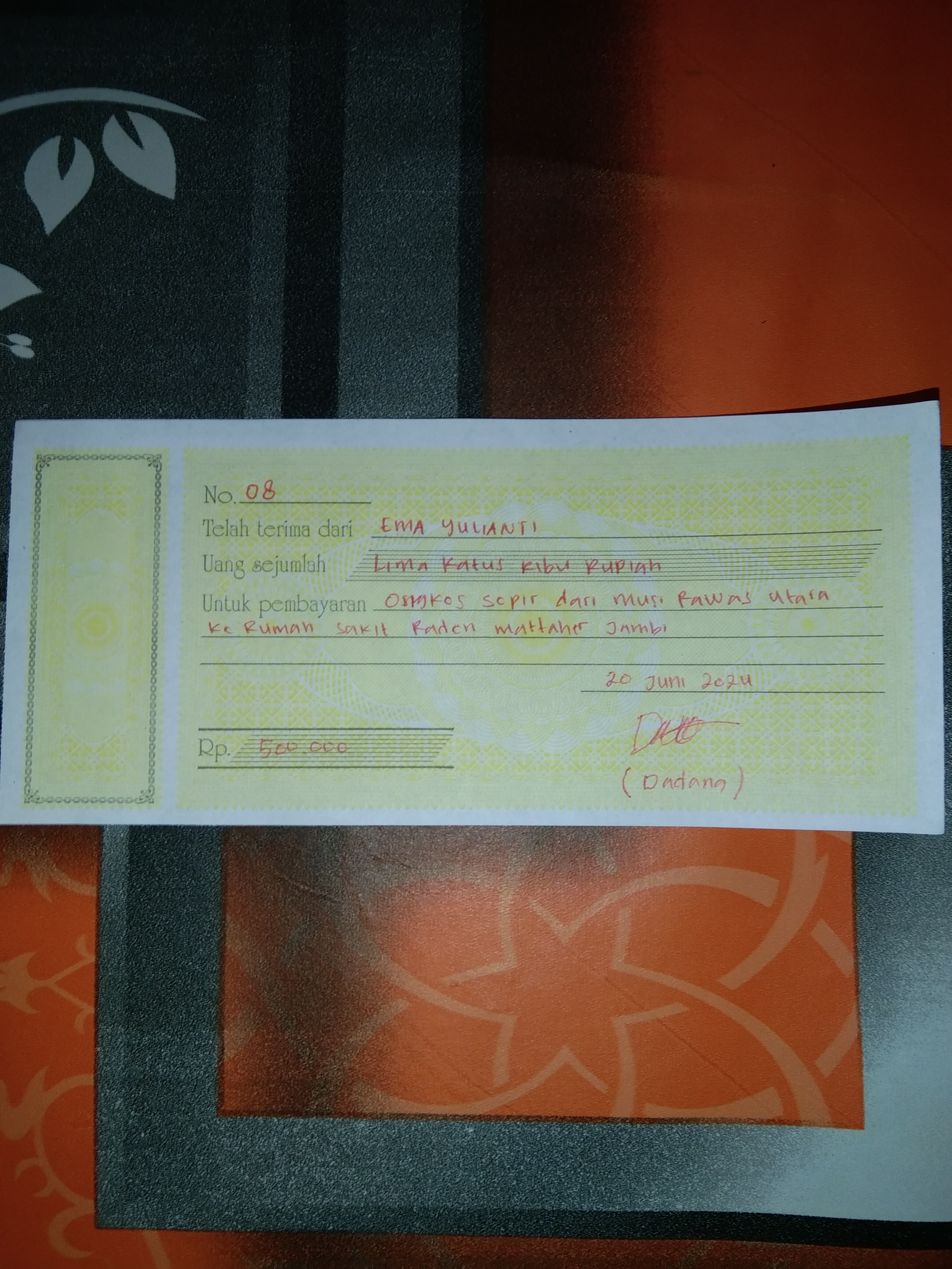1. Uang sewa mobil untuk kontrol dari Musi Rawas Utara ke rumah sakit Mohammad Husein Rp1.500.000