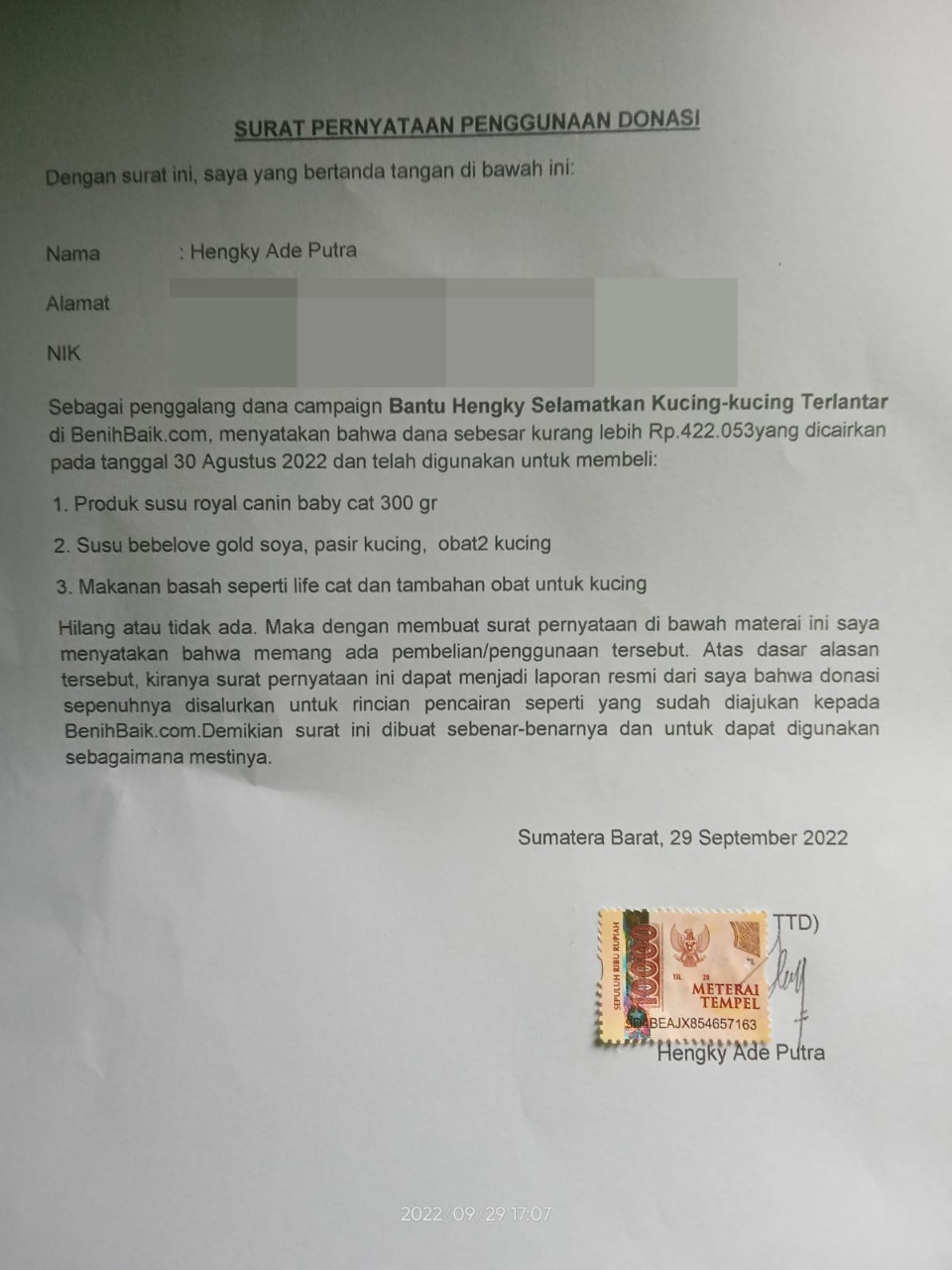 Seluruh bantuan dari TemanBaik, sudah dipakai untuk biaya pembelian pakan kucing.