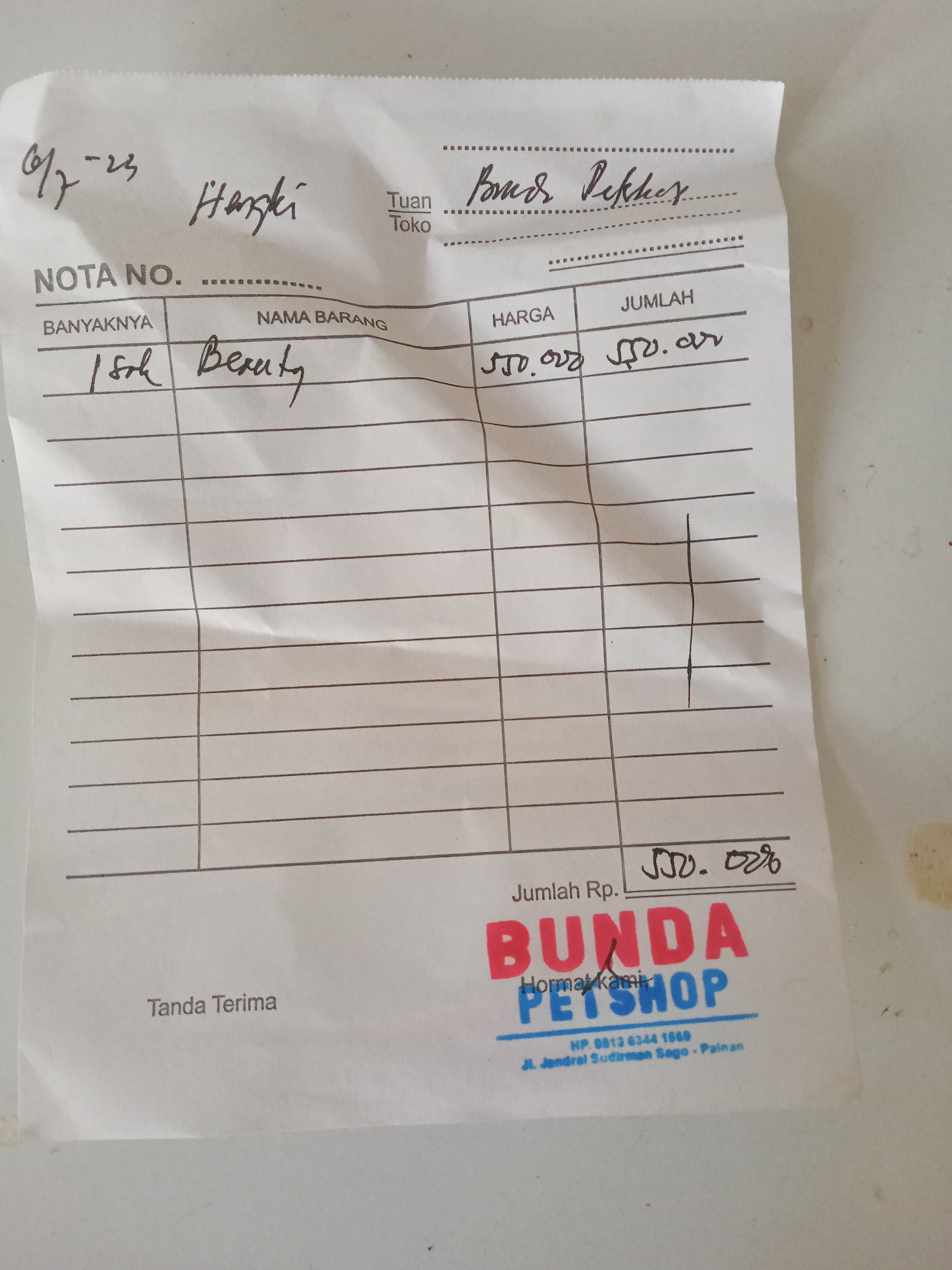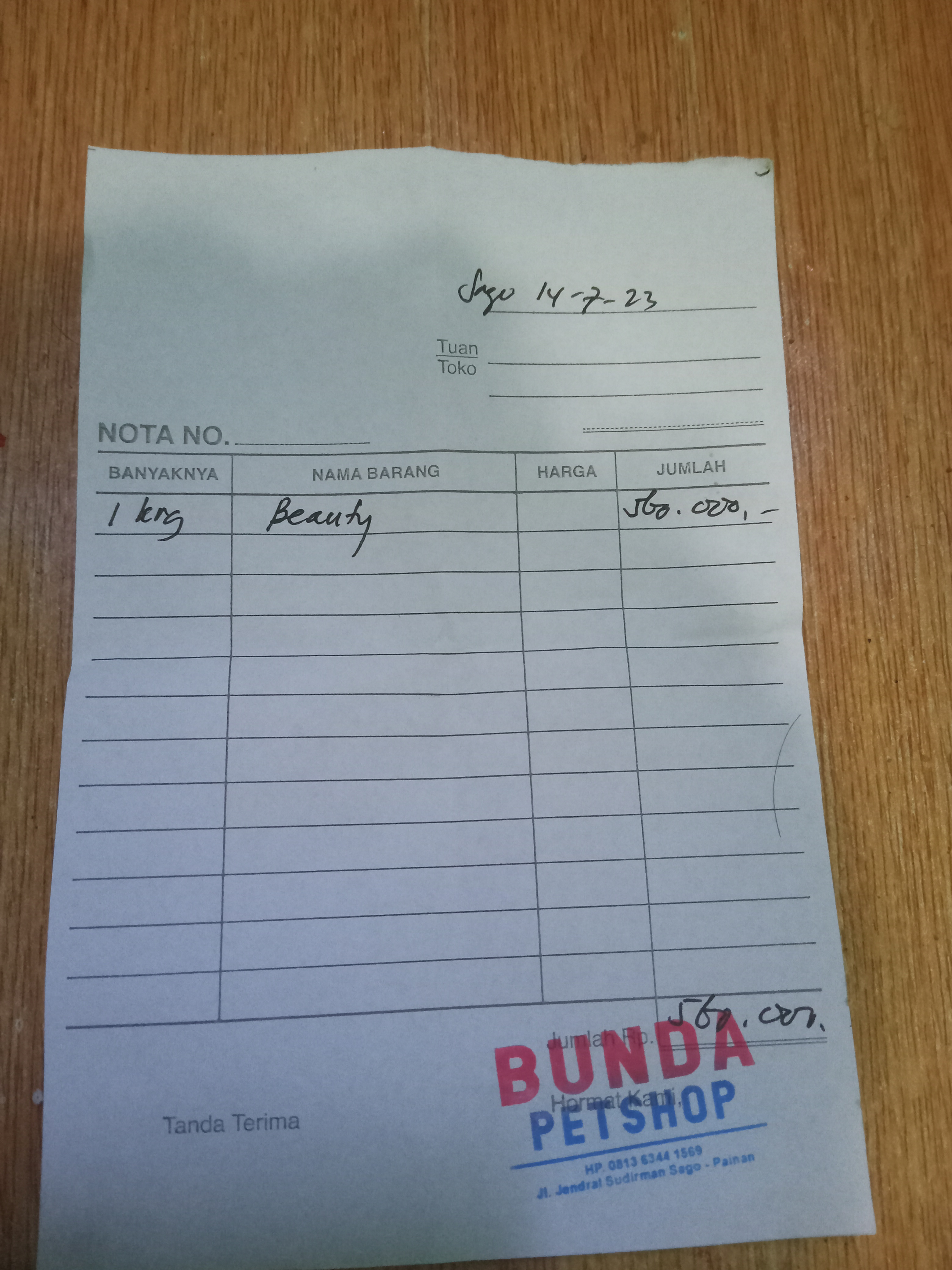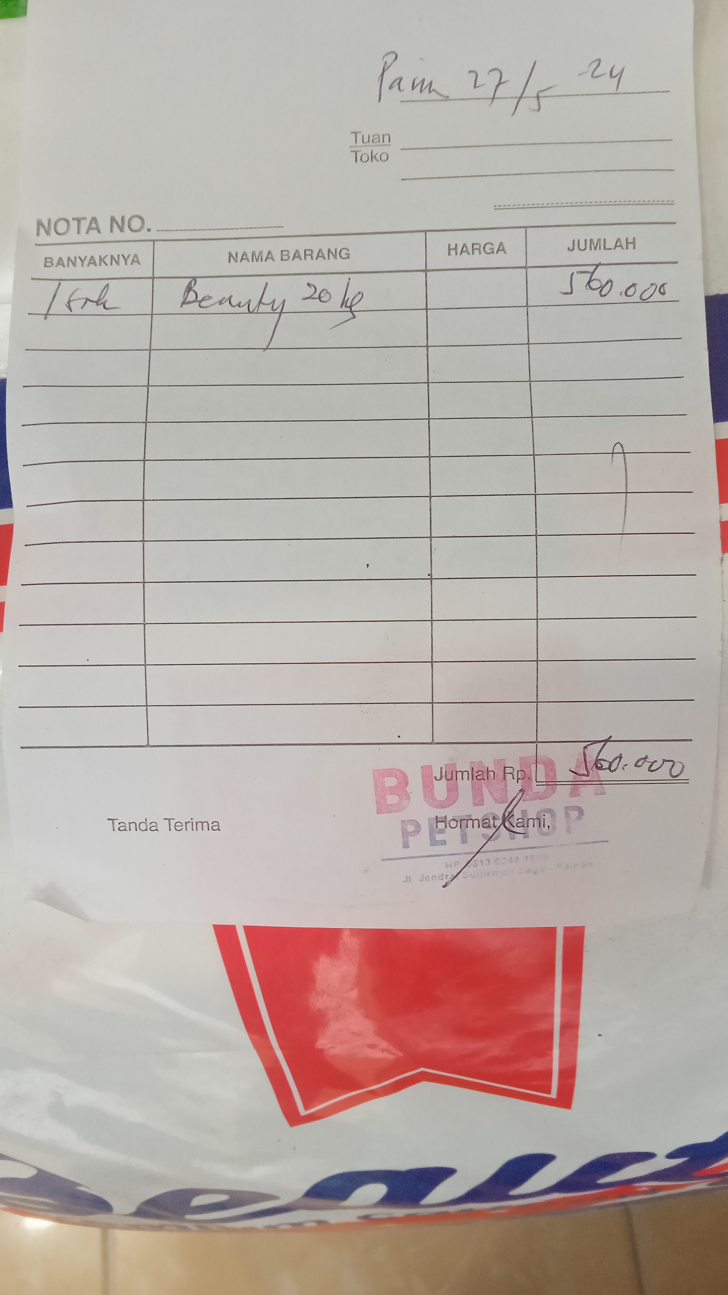 Dana digunakan untuk membeli dry food beauty Rp28.000 x 20Kg = Rp 560.000