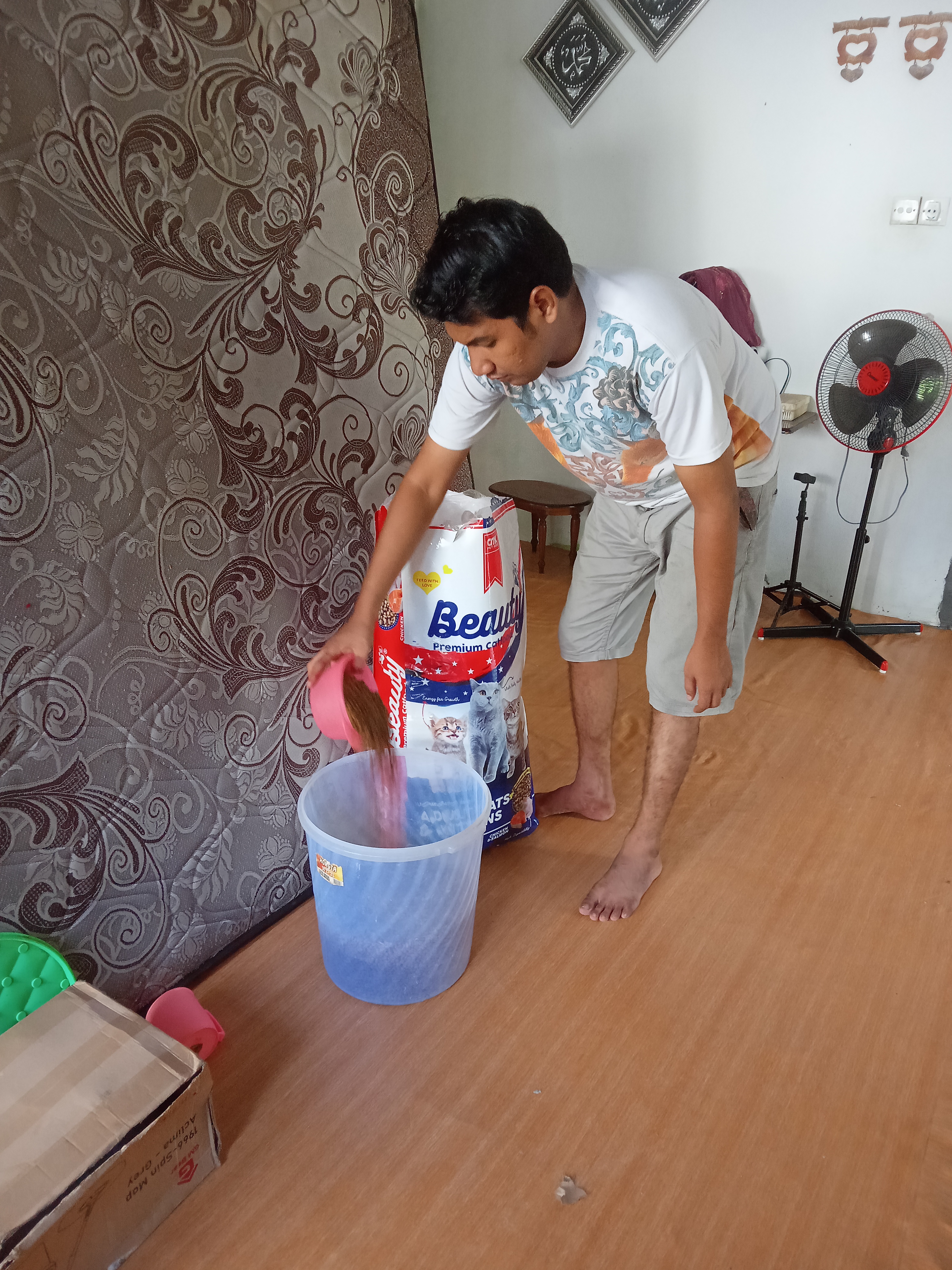 Kegiatan saya selain memberi makan kucing dengan makanan yang layak, saya juga memberikan makanan berupa nasi dicampur ikan dan tempe. Saya berharap kondisi kucing ke depannya selalu sehat seperti sekarang ini.