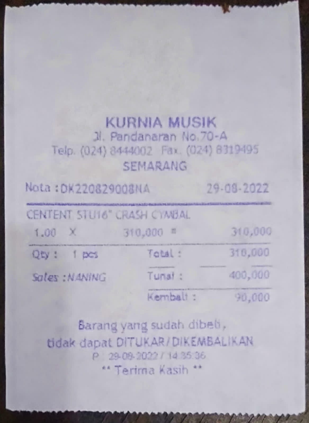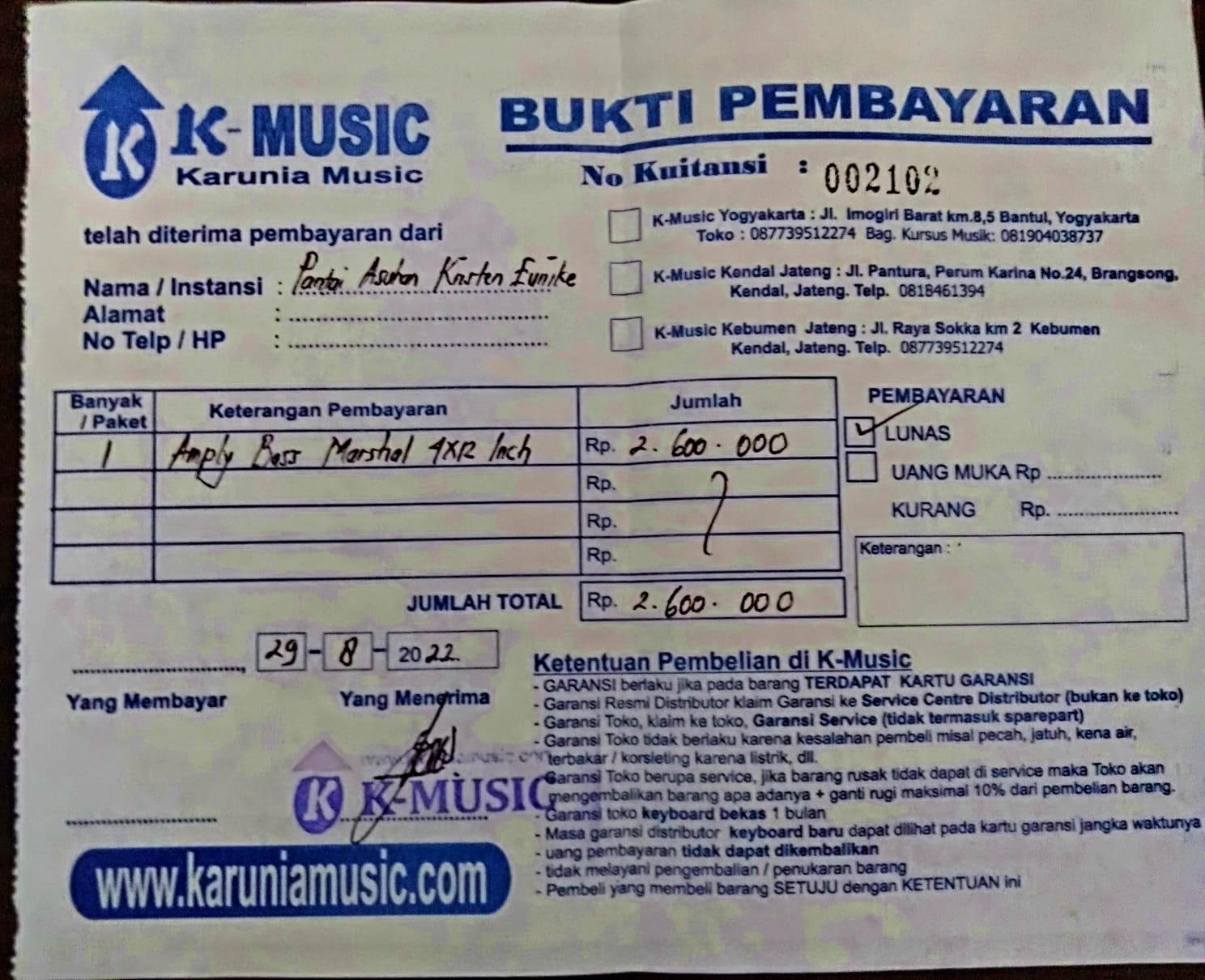 Dana digunakan untuk pembelian alat-alat penunjang fasilitas ibadah dan pembelajaran alat musik di panti: 1. Crash Cymbal 16" Drum 600.000 2. Stand Crash Cymbal Drum 500.000 3. Amplifier Monitor Bass 2.700.000 4. Stand Mic 200.000 5. Digital player pemutar musik 300.0002022-08-24 17:14:51