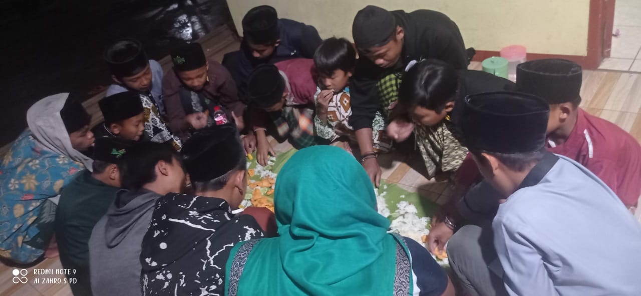 Para santri putra dan putri terlihat tengah menikmati makan malam di pondok pesantren.