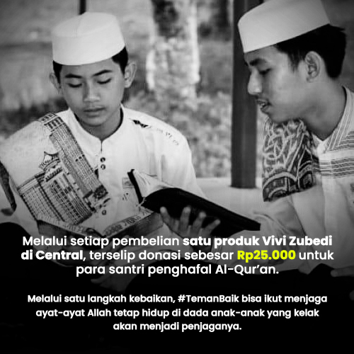 Melalui setiap pembelian satu produk Vivi Zubedi di Central, terselip donasi sebesar Rp25.000 untuk para santri penghafal Al-Qur’an. Melalui satu langkah kebaikan, #TemanBaik bisa ikut menjaga ayat-ayat Allah tetap hidup di dada anak-anak yang kelak akan menjadi penjaganya.