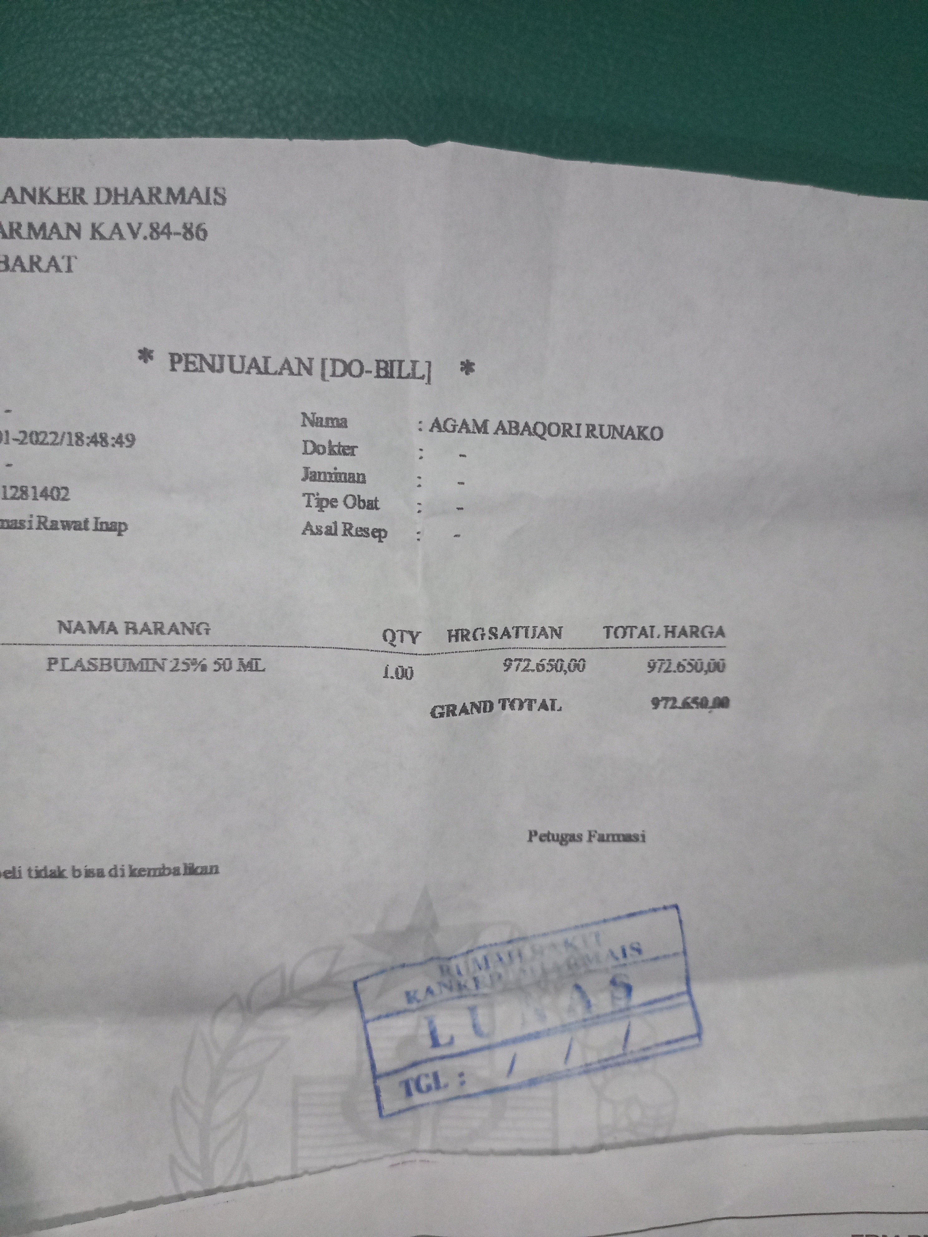 Kami kembali dirujuk ke RSK Dharmais dengan syarat menunggu kondisi Agam stabil. Dengan perasaan yang campur aduk, kami ke RSK Dharmais, Agam diperiksa seluruh badannya, seperti USG Thorax, BMP, dan biopsi. Ternyata hasilnya Agam menderita kanker dan sudah stadium 4, serta harus menjalani kemoterapi.