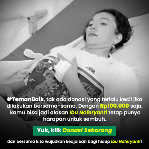 #TemanBaik, tak ada donasi yang terlalu kecil jika dilakukan bersama-sama. Dengan Rp100.000 saja, kita bisa jadi alasan Ibu Noferyanti tetap punya harapan untuk sembuh. Yuk, klik Donasi Sekarang dan bersama kita wujudkan keajaiban bagi hidup Ibu Noferyanti!