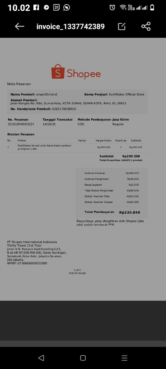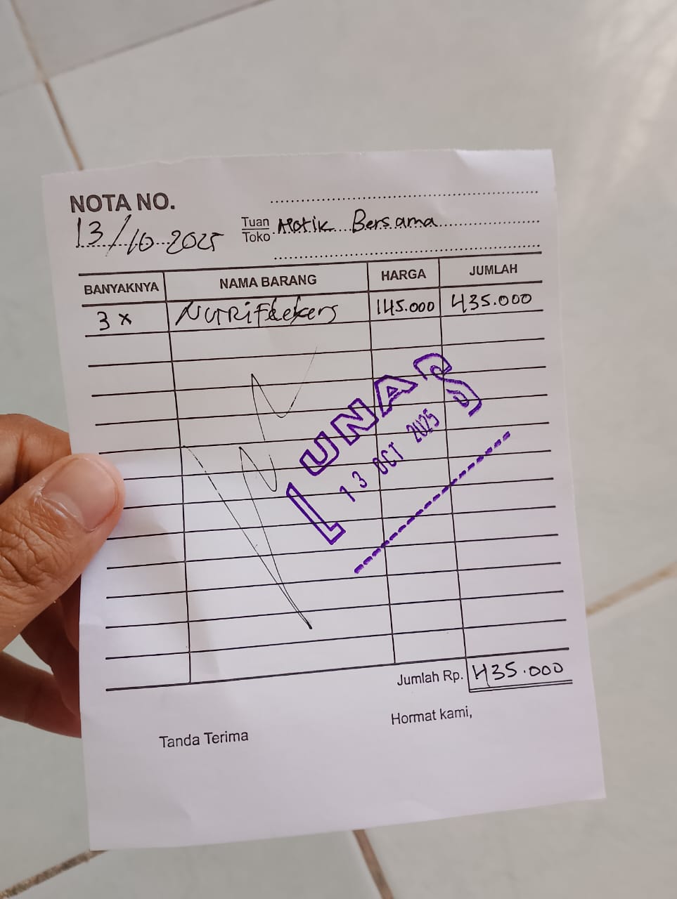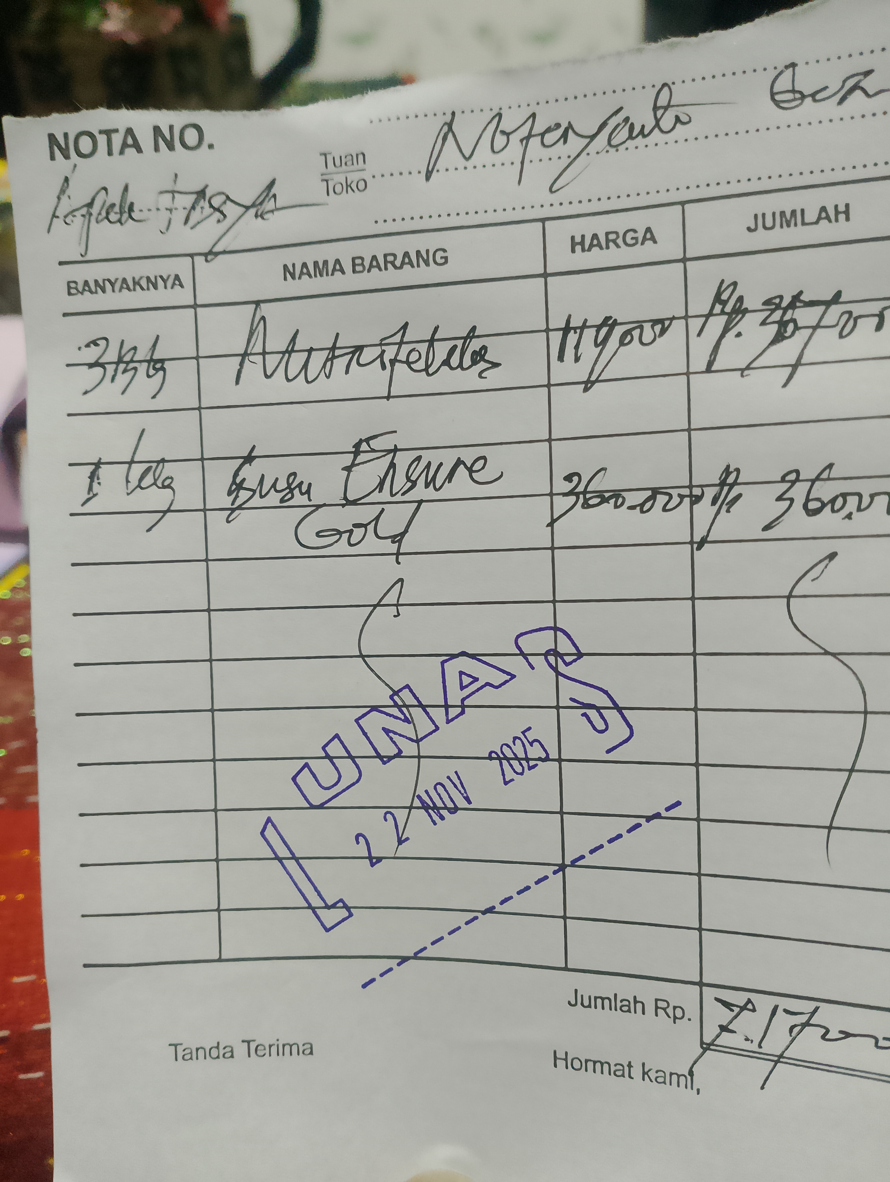 Dana digunakan untuk 1. Susu ensure gold Rp360.000 2. Nutriflakes Rp119.000 x 3 = Rp357.0002025-11-21 10:01:23