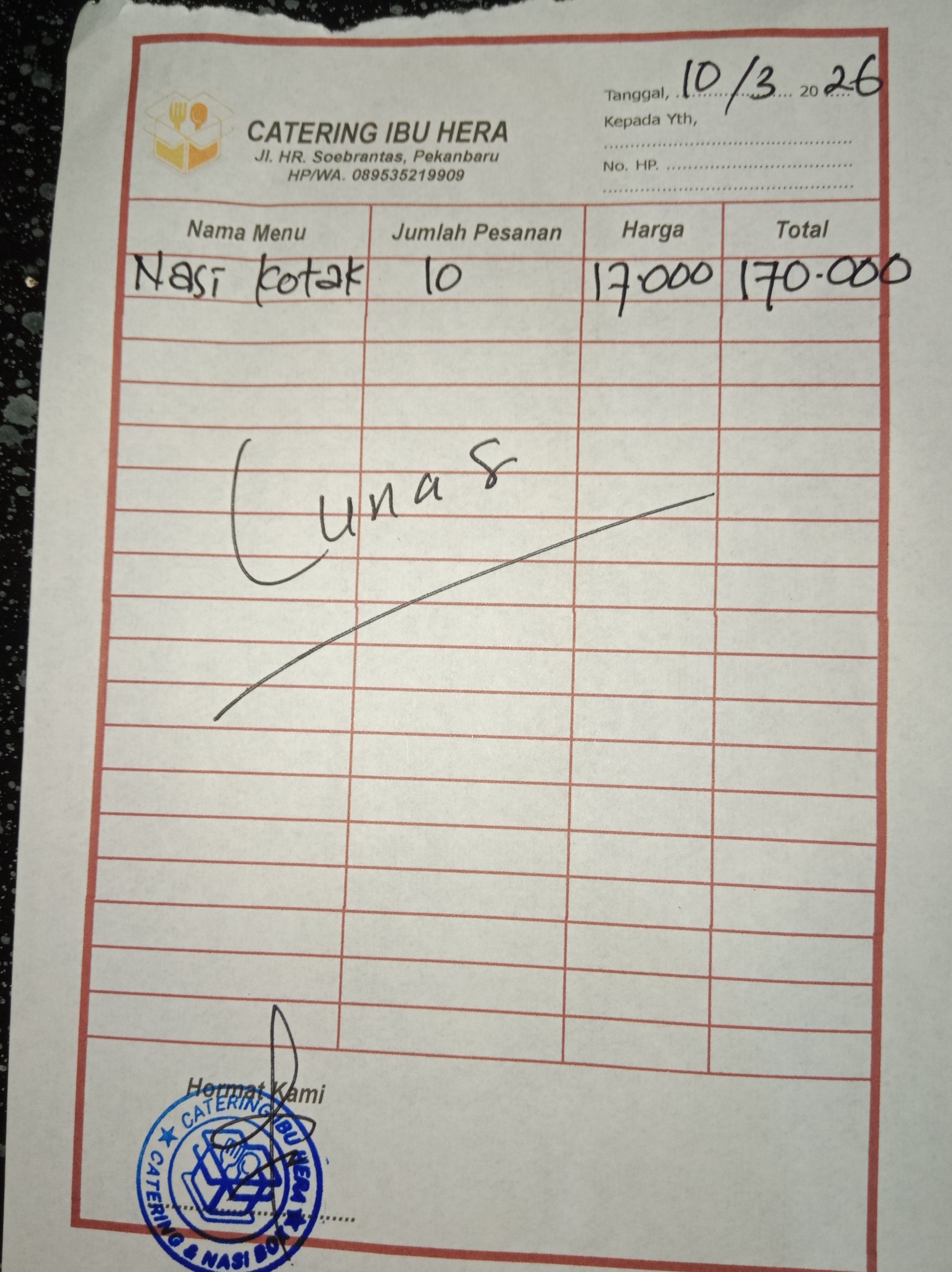 Dana digunakan untuk nasi kotak untuk 10 Dhuafa berbuka puasa Rp17.000 x 10 kotak = Rp170.0002026-03-06 09:49:25