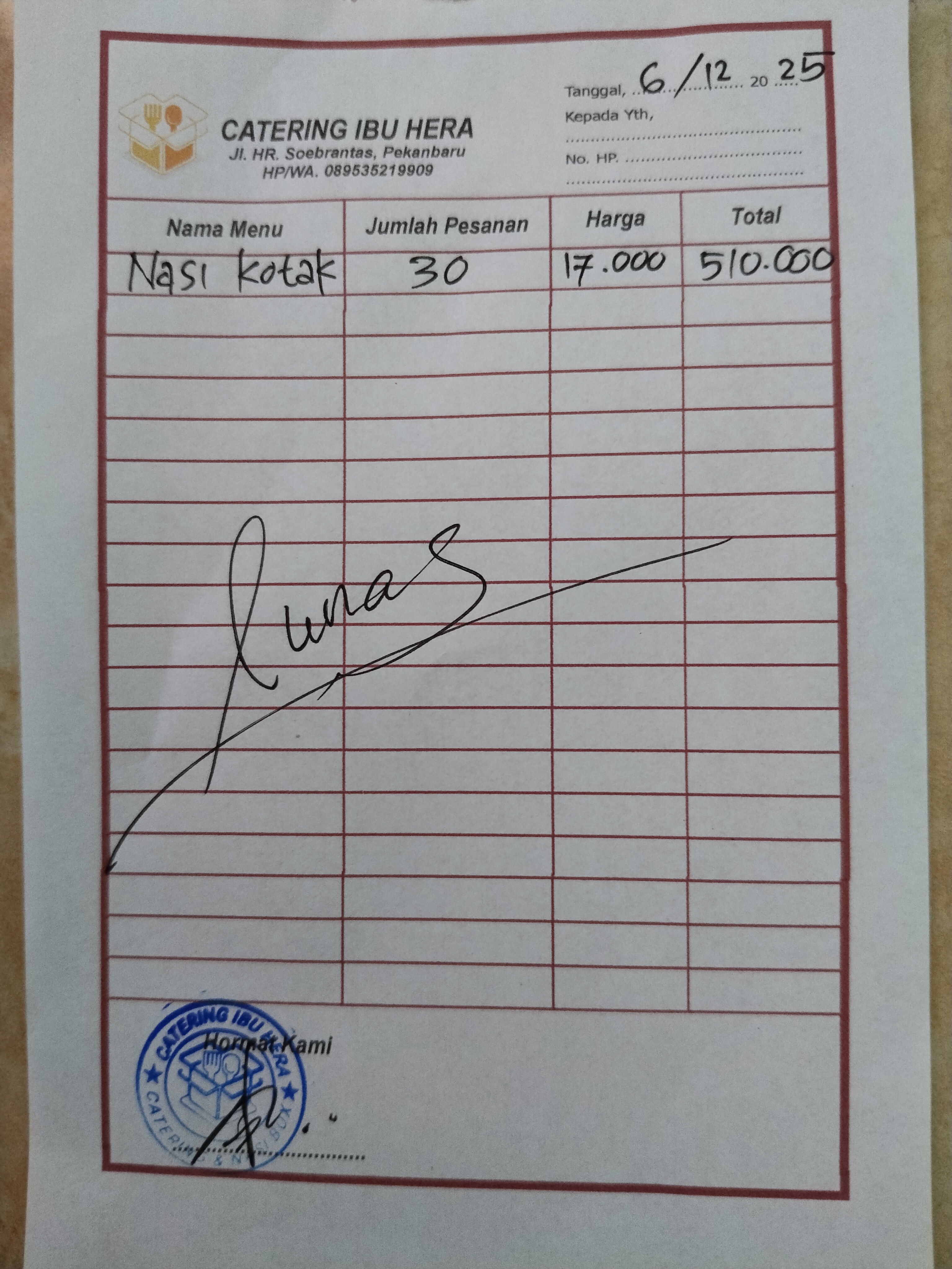 Dana akan digunakan untuk nasi kotak Rp17.000 x 30 kotak = Rp510.0002025-12-04 14:13:56