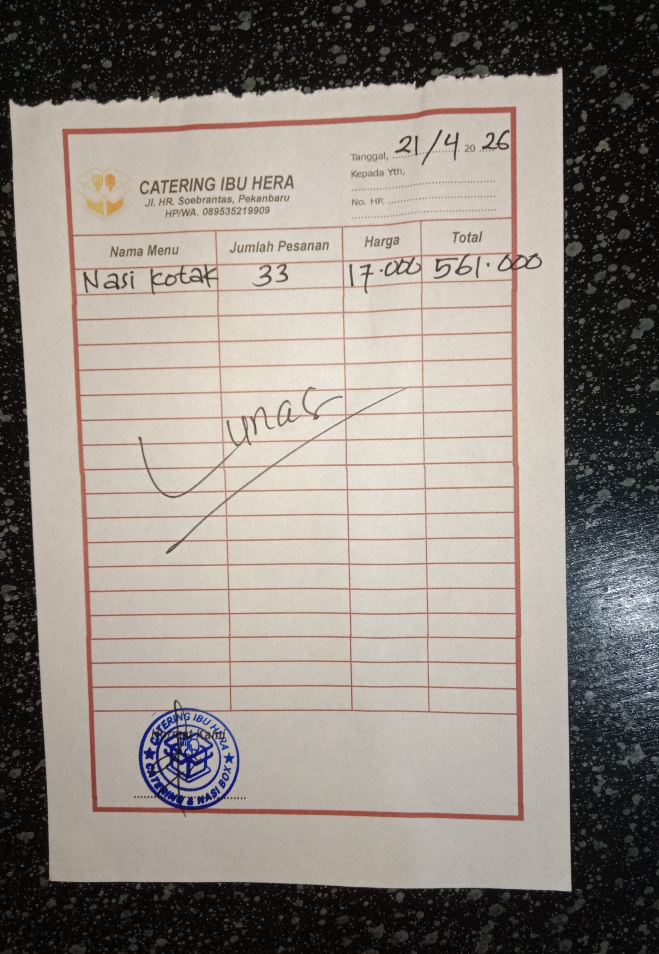 Dana digunakan untuk nasi kotak Rp17.000 x 33 kotak = Rp561.0002026-04-21 11:31:12