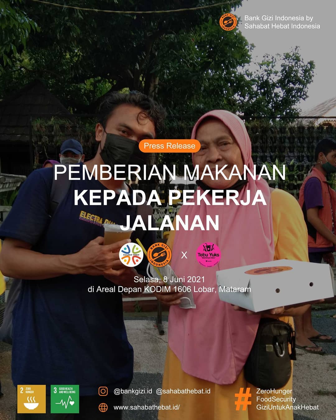 Telah terlaksana Pembagian Makanan Kepada Pekerjaan Jalanan pada hari selasa 8 Juni 2021. Lokasi pembagian tepat di areal depan KODIM 1606 LOBAR, Mataram. Gerakan bagi makanan kali ini memiliki hal yang cukup berbeda dikarenakan terdapat kolaborasi dari TNI untuk pembagian Masker sebagai langkah pencegahan Covid-19 di NTB. Terdapat juga kerjasama dari Tebu Yuks untuk minuman yang dibagikan ke pekerja jalanan di Mataram.
