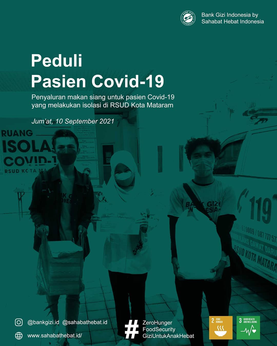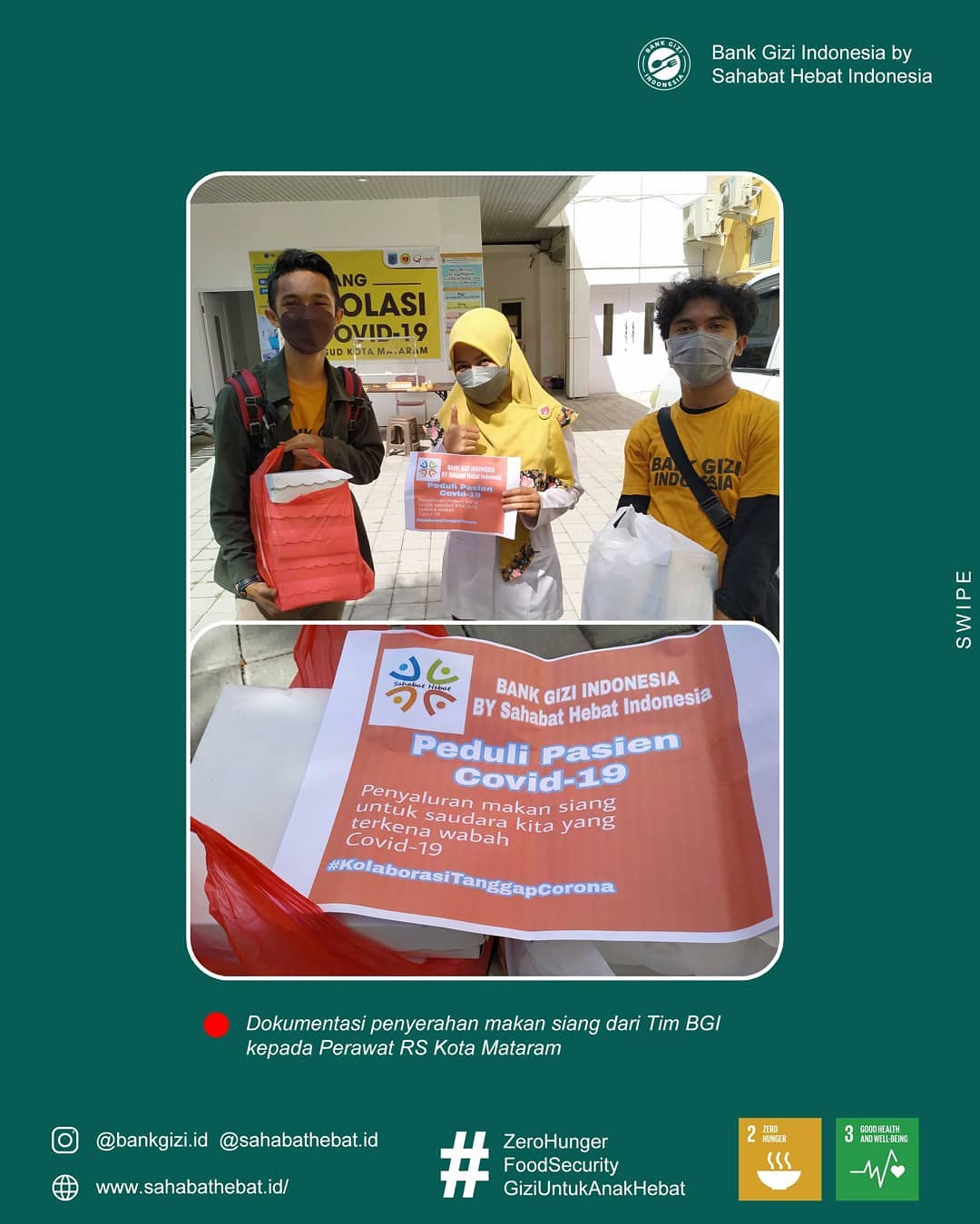 Alhmdulillah telah dilaksanakan agenda kegiatan "Peduli Pasien Covid-19" pada Hari Jum'at, 10 September 2021 di Rumah Sakit Kota Mataram. Kegiatan ini dilakukan dengan penyaluran makan siang untuk pasien Covid-19 yang melakukan isolasi di RS Kota Mataram. Penyaluran makan siang tersebut, diserahkan langsung oleh Tim BGI kepada Perawat RS Kota Mataram.