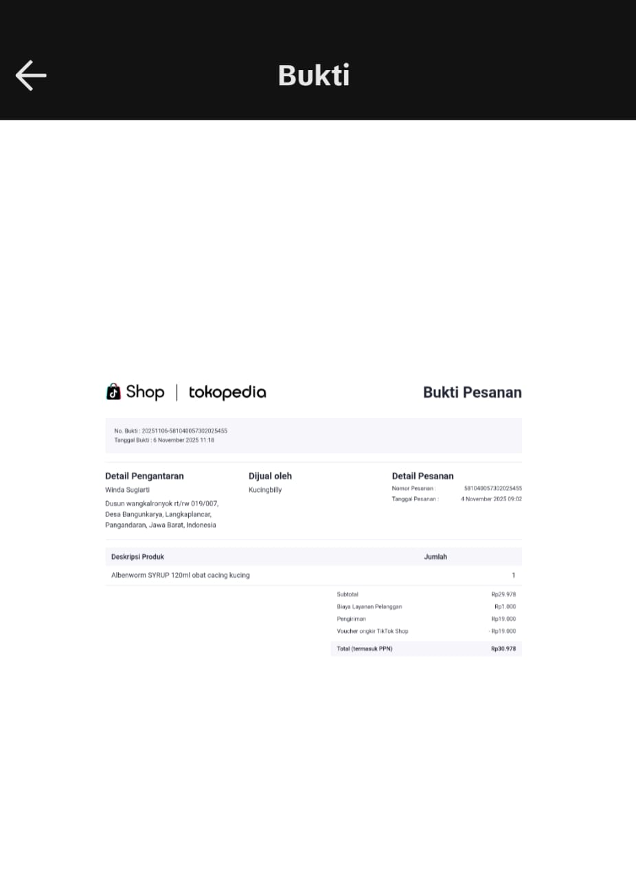 Dana digunakan untuk 1. Meo kitten kaleng Rp19.000 x 2 = Rp38.000 2. Pasir zeolit Rp35.0002025-10-13 09:13:03