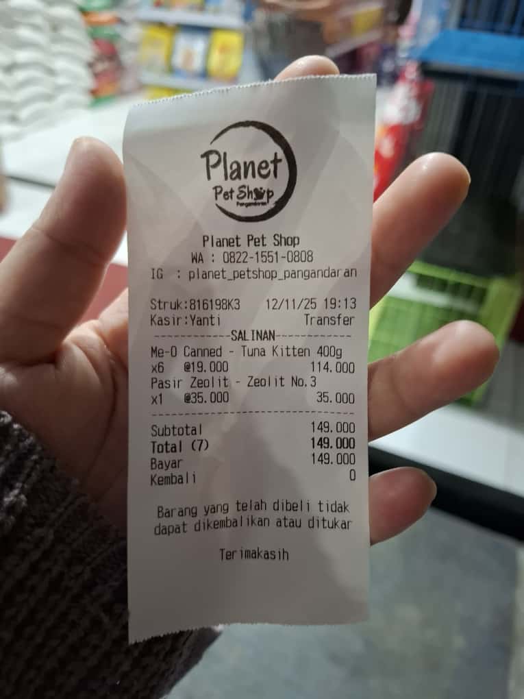 Alhamdulillah, dana yang telah #TemanBaik donasikan sudah saya gunakan dengan sebaik-baiknya. Uang tersebut telah dibelikan dua kaleng Meo Kitten untuk makanan kucing kecil, serta pasir zeolit untuk menjaga kebersihan mereka. Kedua hal ini sangat penting bagi keseharian para kitten, makanan bergizi untuk tumbuh kembang mereka, dan pasir yang bersih untuk menjaga kesehatan serta kenyamanan.
