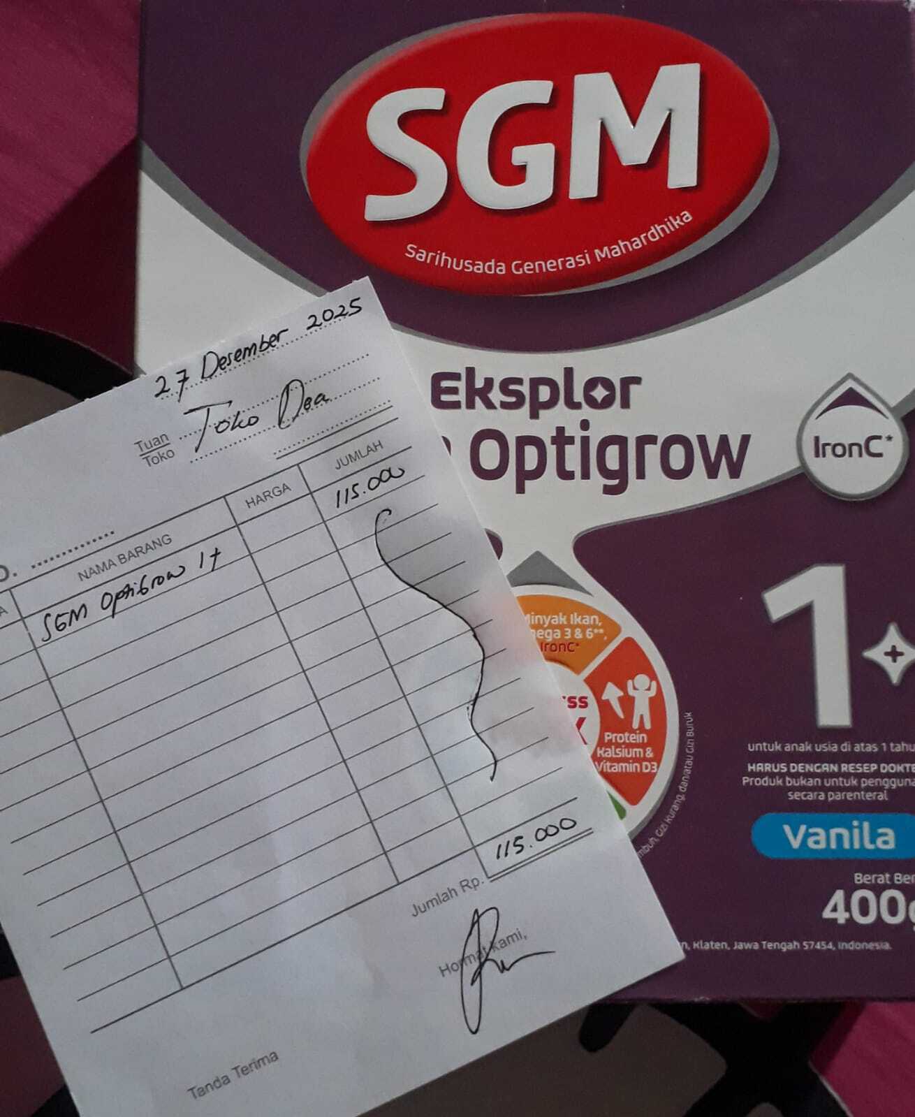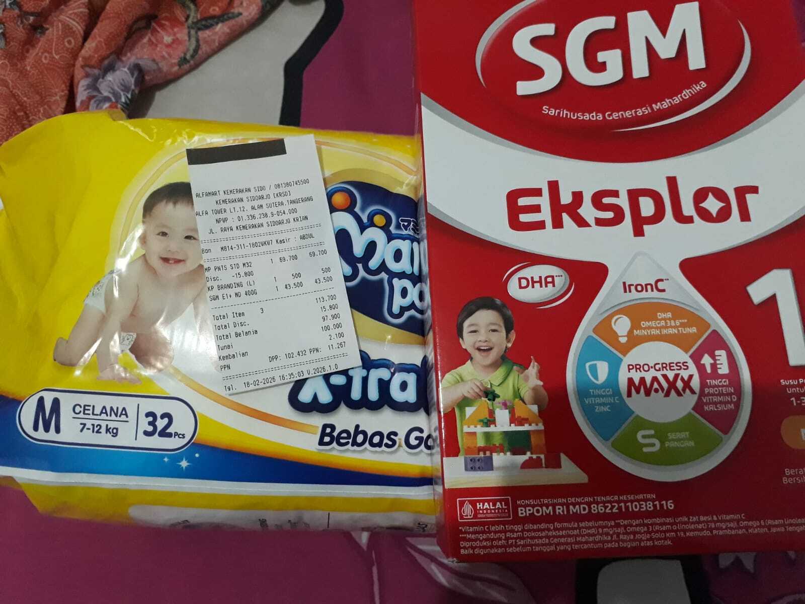 Dana digunakan untuk 1. Transportasi kontrol PP ke soetomo Rp100.000 x 2 = Rp200.000 2. Pampers 3 Ball Rp60.000×3 = Rp180.000 3. Susu SGM OptiGrow 1+ Rp115.000 × 4dus = Rp460.0002026-01-19 15:18:52