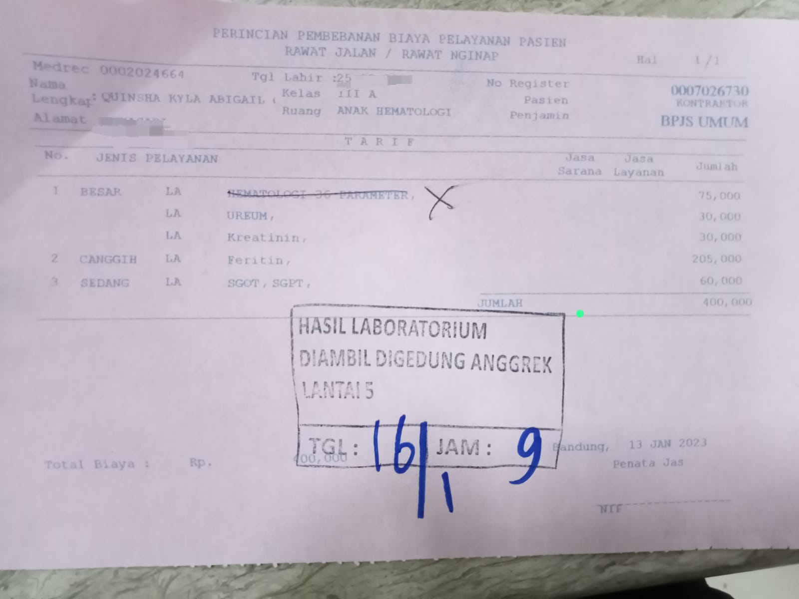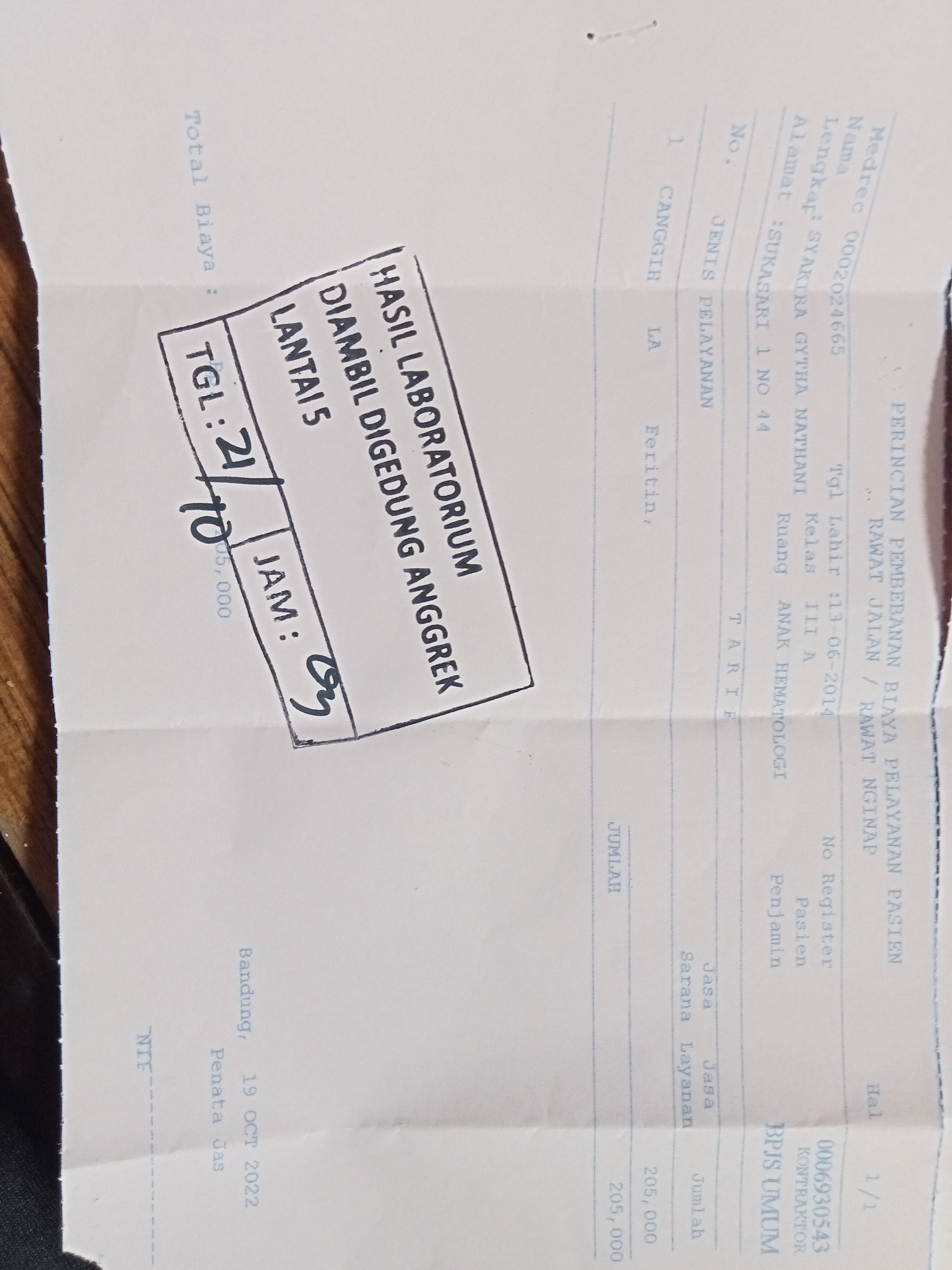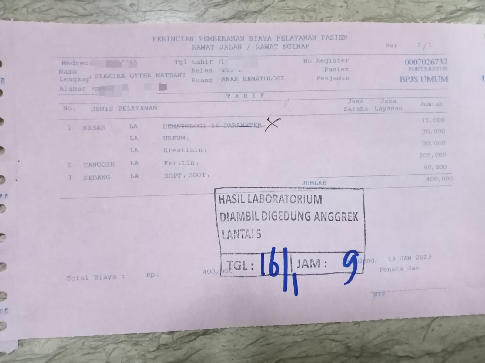 Hari ini, anakku sudah menjalani observasi laboratorium dan hasilnya hemoglobin di bawah angka normal. Kemungkinan, hari Rabu nanti akan menjalani transfusi darah rutin.