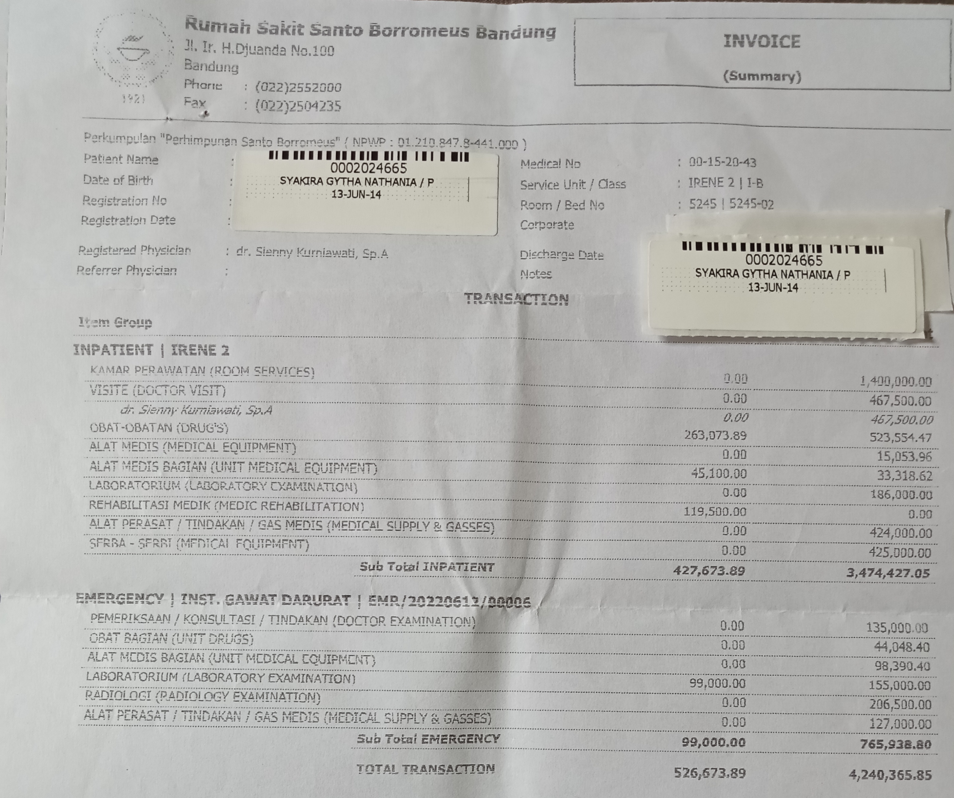 Permohonan biaya rawat inap anak Syakira Gytha. Dengan rincian sbb 1. Biaya RS Rp. 4.240.365 2. Biaya fisioterapi Rp. 526.673 3. Biaya Reimbus klinik mata Rp. 587. 584 4. Biaya Makan 3 hari di RS Rp 300.000 Nota Terlampir