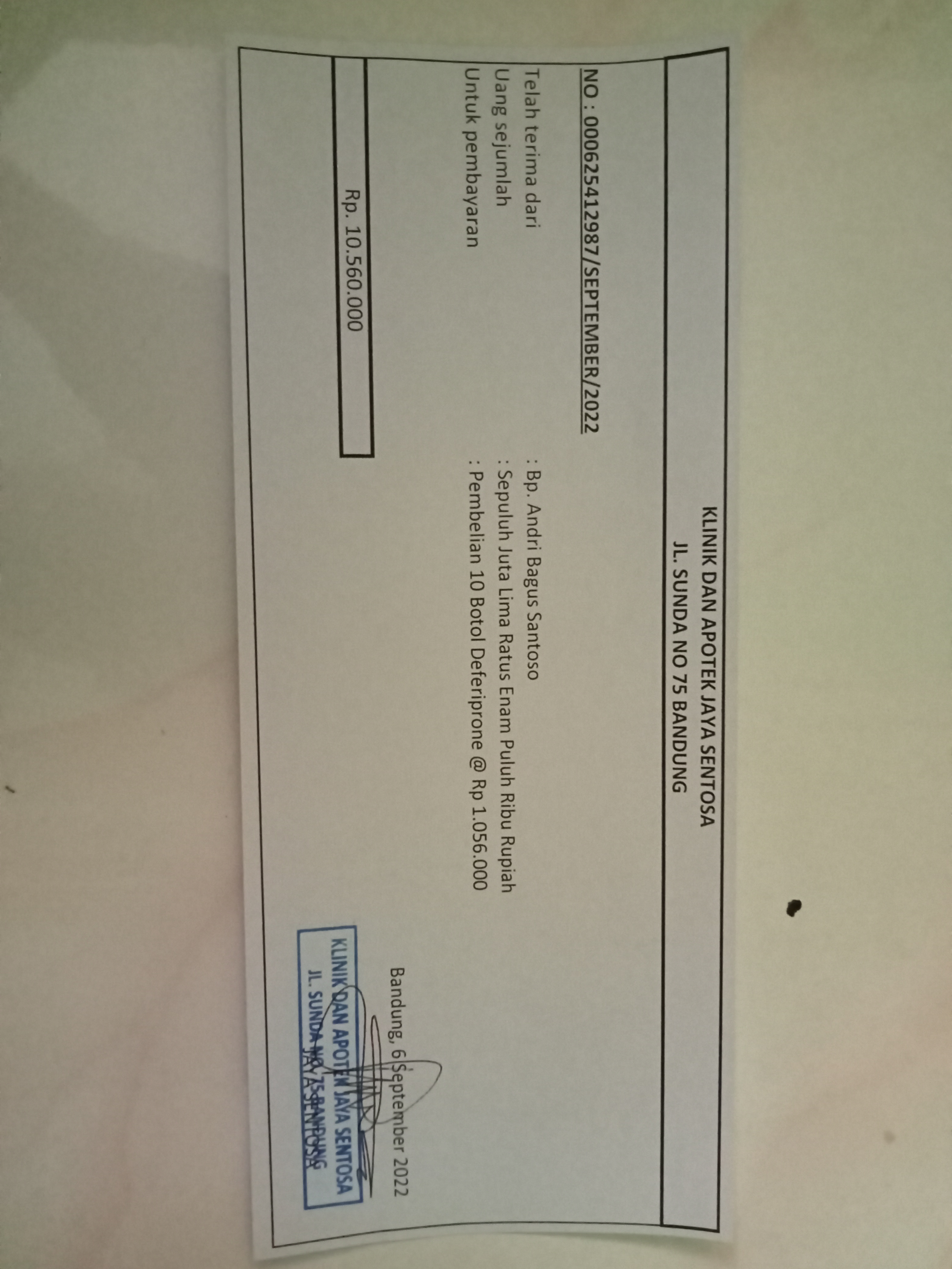 Alhamdulillah saya ucapkan beribu-ribu terima kasih atas bantuannya kepada para donatur sehingga obat untuk peluntur zat besi sudah saya belikan untuk kedua anak saya... Semoga Allah mengganti rezeki apa yang telah diberikan oleh para donatur kepada keluarga saya... Insyaallah dana selanjutnya akan saya pergunakan untuk laboratorium dan pembayaran BPJS