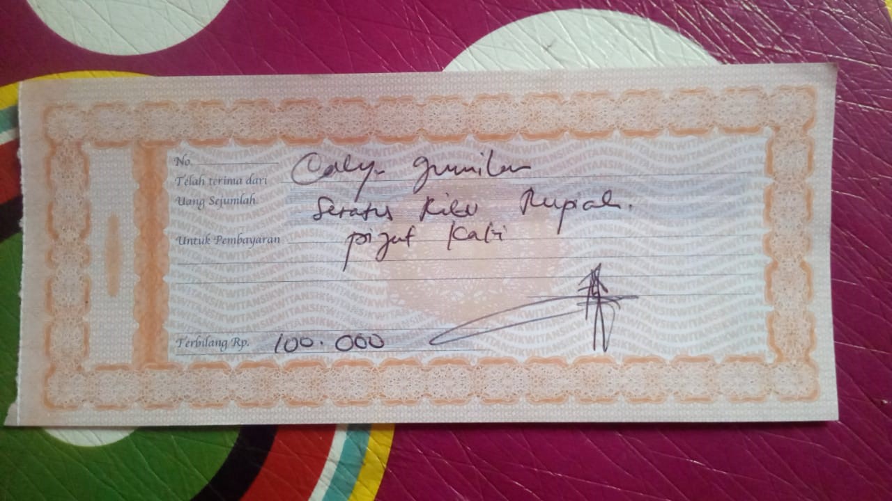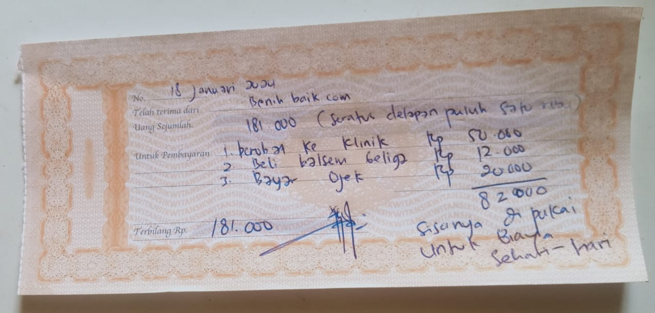 Dana digunakan untuk 1. Biaya terapi pijat Rp130.000 2. Balsam Rp20.000 3. Sisanya untuk kebutuhan sehari-hari Rp294.000.2023-07-28 16:57:21