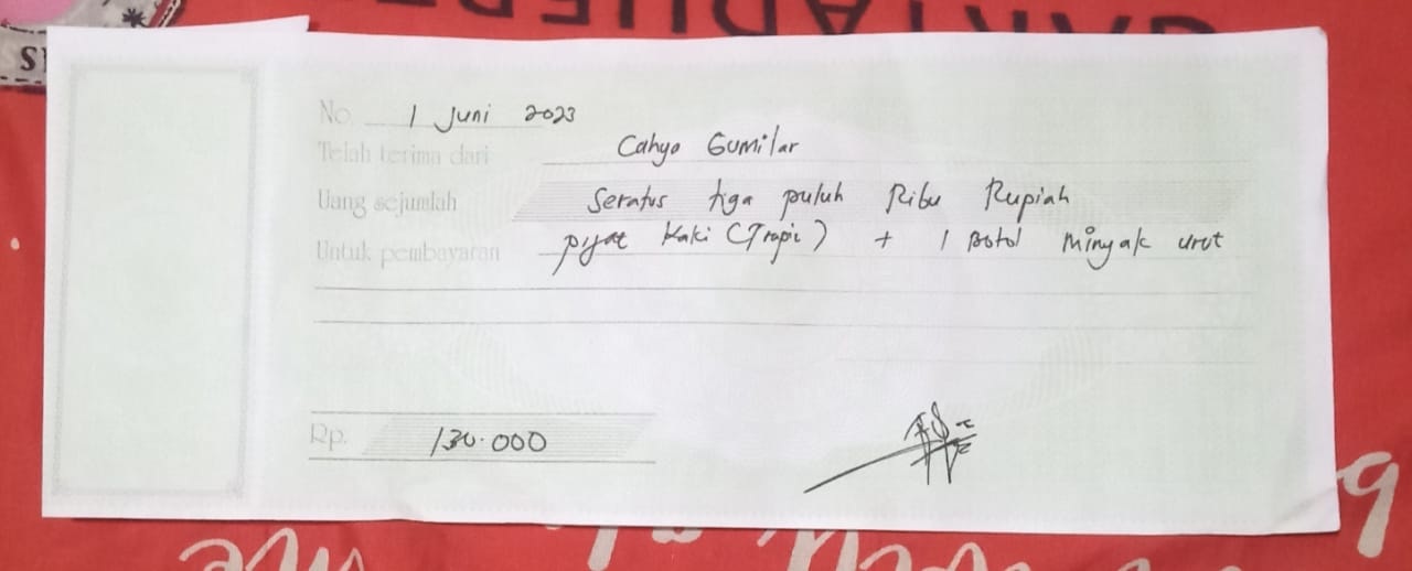 Dana digunakan untuk 1. Biaya terapi urut kaki Rp100.000 2. Minyak urut Rp30.000.2023-05-31 16:25:44