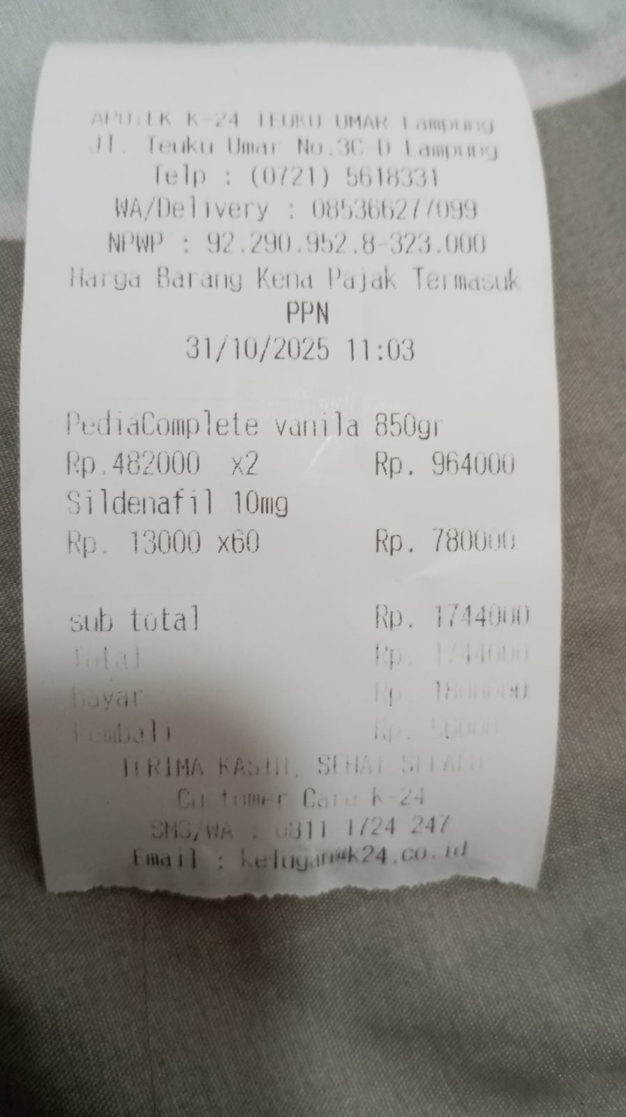 Dana digunakan untuk 1.Susu Pediasure Complete 2 Kaleng x 482.000 = Rp964.000 2.Obat sildenafil 10 mg 60 bungkus Rp780.0002025-10-29 10:41:04