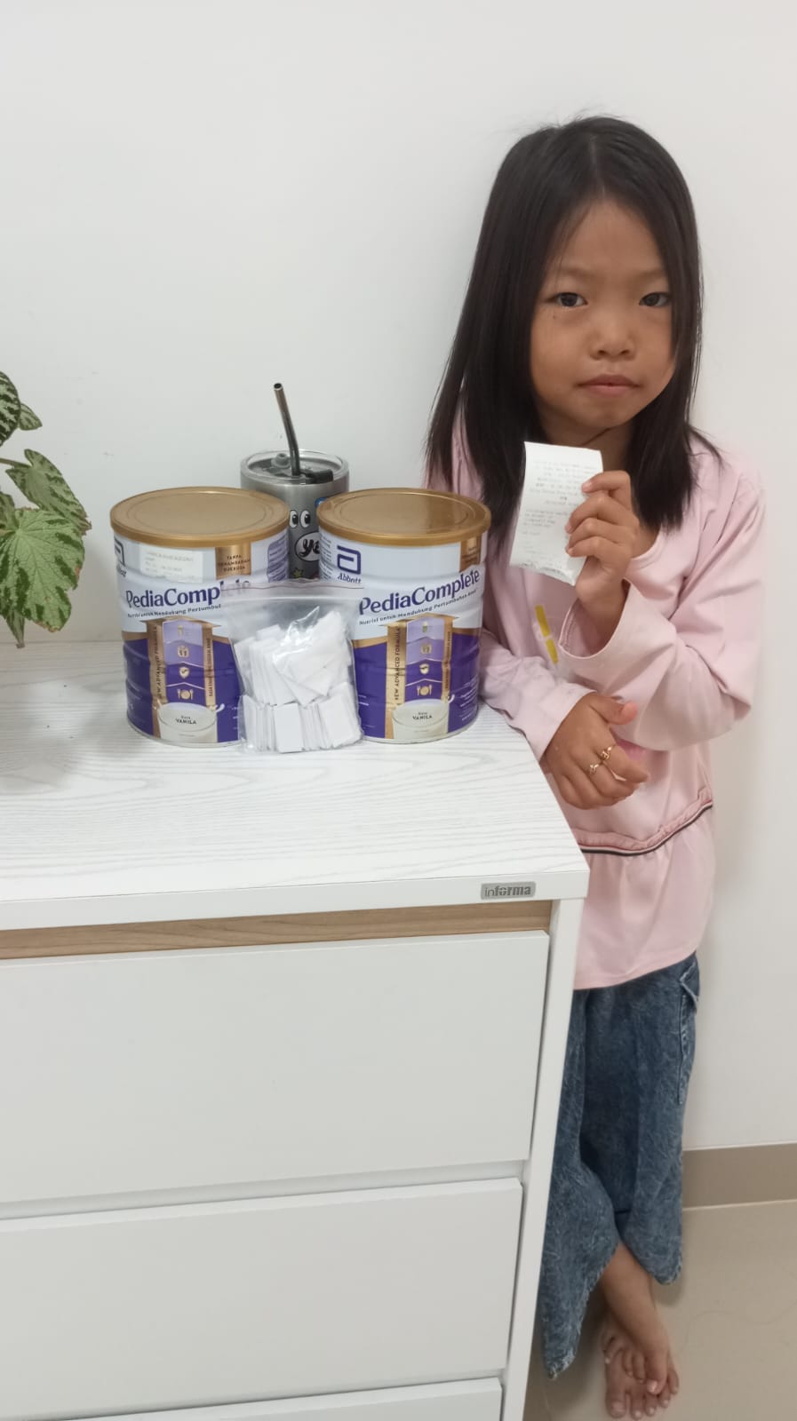 Alhamdulillah, dana sebesar Rp960.000 yang telah dicairkan digunakan untuk kebutuhan bulanan Kamila, yaitu membeli 2 kaleng susu Pediasure Complete ukuran 850g seharga Rp810.000 dan 2 botol vitamin Curvit ukuran 175ml seharga Rp150.000.