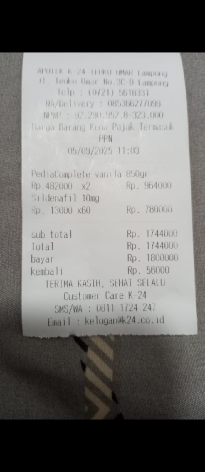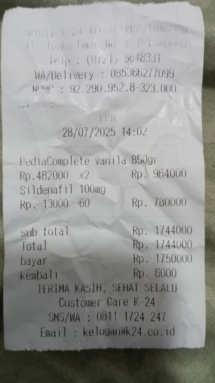 Dana digunakan untuk 1. Susu pediasure complete 2 kaleng Rp964.000 2. Obat sildenafil 10 mg 60 bungkus Rp780.0002025-12-09 08:25:52