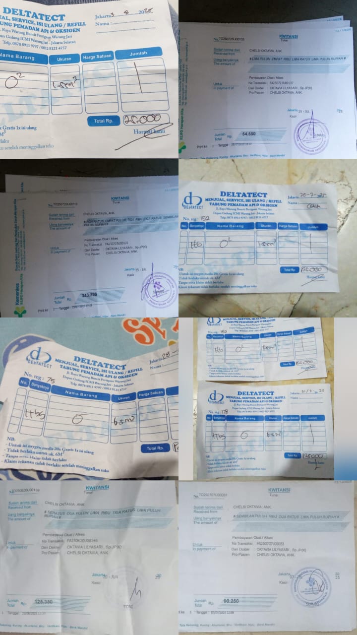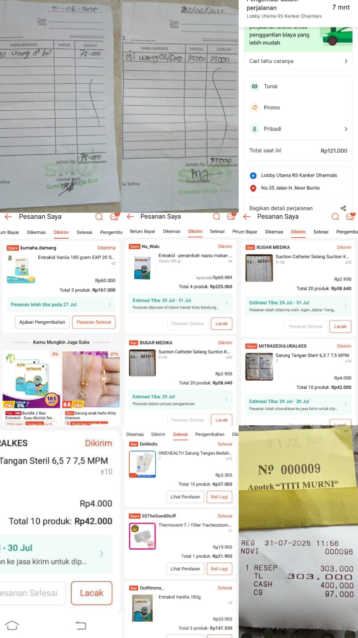 Dana digunakan untuk 1. Susu Entrakid Rp60.000 X 15 Dus = Rp 900.000 2. Pampers mami Pokok Rp150.000 X 2 Ball = Rp300.000 3. Suction Cather Rp55.000 X 15pcs = Rp825.000 4. Pengisian Oksigen Rp75.000 X 8 hari= Rp600.0002025-06-23 10:02:56