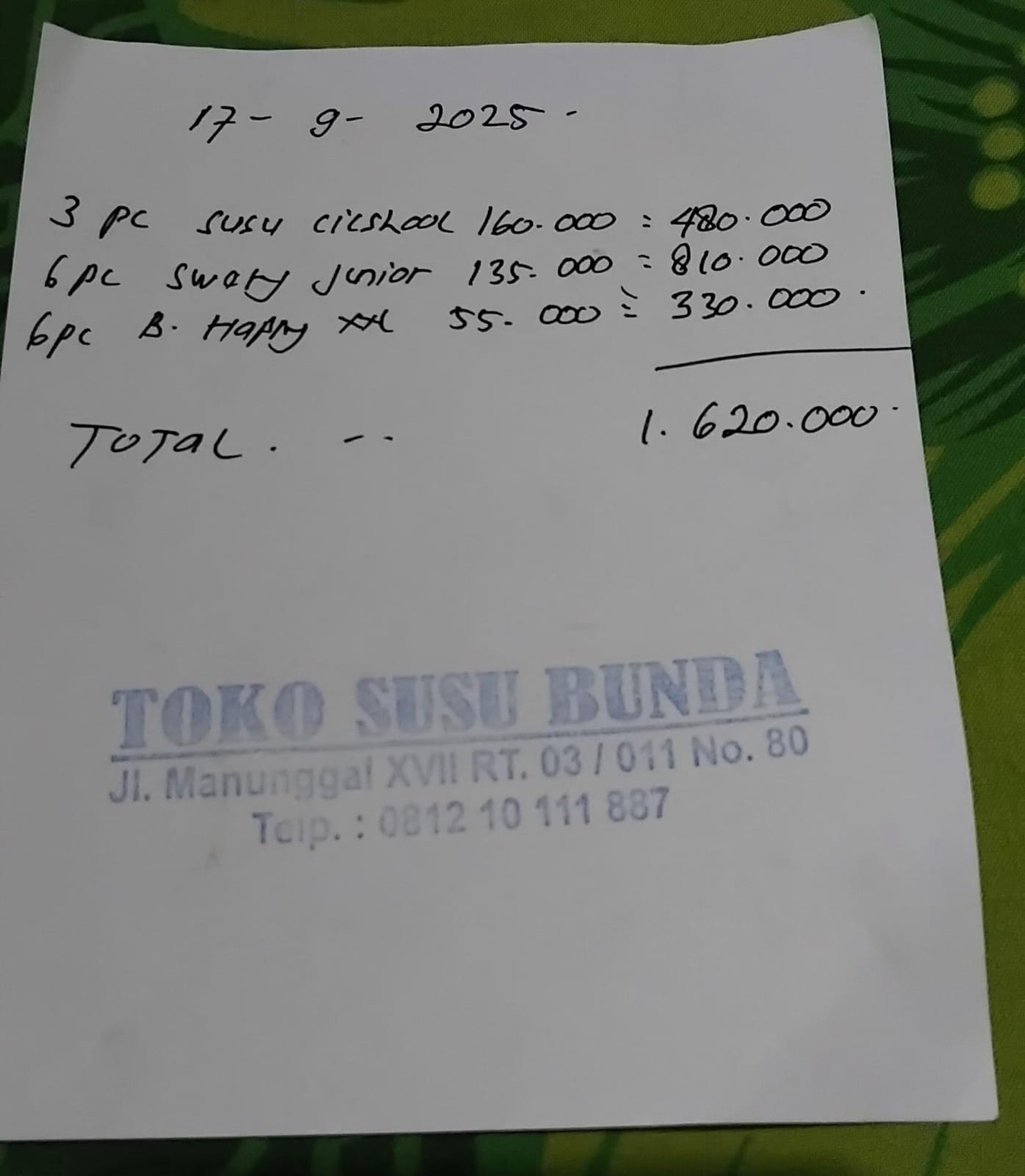 Dana digunakan untuk 1. Susu Pediasure Complate Rp390.000 x 2 kaleng =Rp. 780.000 2. Susu Dancow Fortigro Rp108.000 x kardus =Rp 216.000 3. Mamy Poko Junior Rp158.000 x 3 ball= Rp. 474.000 4. Tissue Kering Rp16.000 x 3 pack = Rp48.000 5. Tissue Basah Rp18.000 x 4 pack = Rp. 73.304 6. Minyak Telon Rp42.000 x 2 botol =Rp. 84.000 7. Terapi Rp75.000 x 5 pertemuan = Rp. 375.0002025-09-17 13:49:11