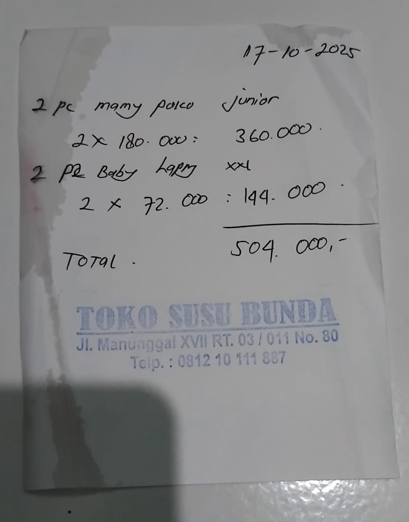 Dana digunakan untuk 1. Pampers MamyPoko UK XXXL Rp.210.000 2. Susu Dancow Rp135.000 x 3 kotak = Rp 405.000 3. Minyak Telon Rp. 58.2652025-03-11 08:59:34