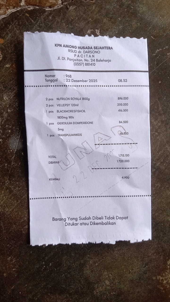 Dana digunakan untuk 1. Vitamin nutrimax kidz Rp255.600 2. Susu nutrilon Rp448.000 3. Vellepsy Syrup Rp250.0002025-09-17 13:49:28