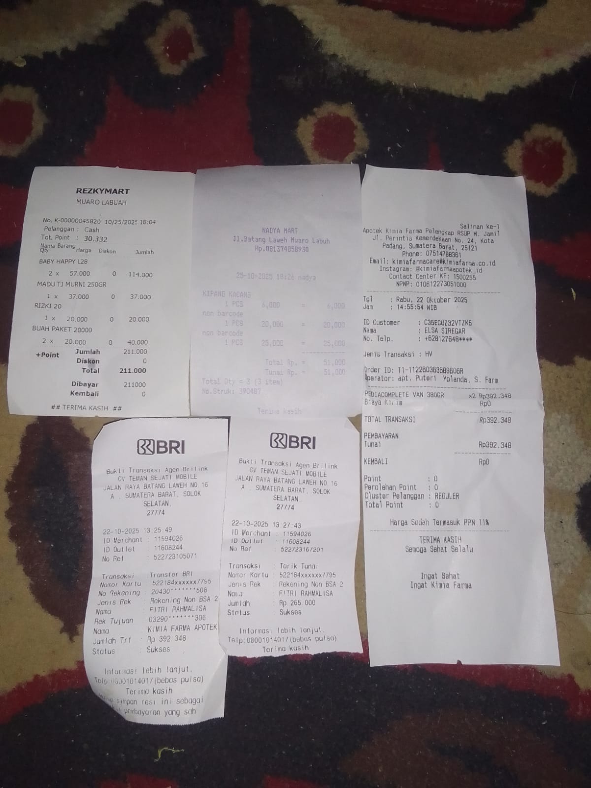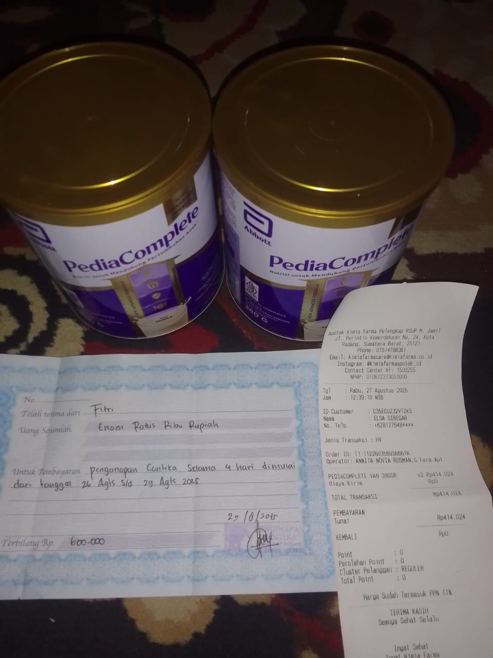 Dana digunakan untuk 1. Susu pediacomplete Rp206.000 x 2 kaleng = Rp412.000 2. Pampers Rp57.000 x 2 = Rp114.000 3. Madu Tj Rp33.000 4. Buah-buah Rp138,5002025-10-21 10:32:39