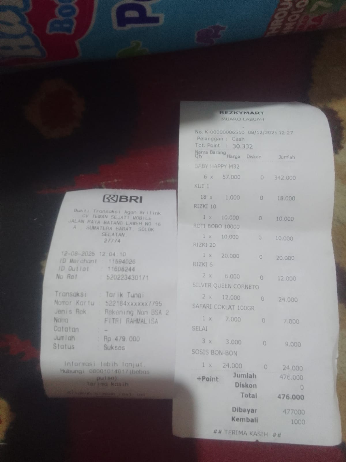 Dana digunakan untuk 1. Pampers Ro57.000 x 6ball =Rp342.000 2. Buah Rp155.5002025-08-12 10:08:53