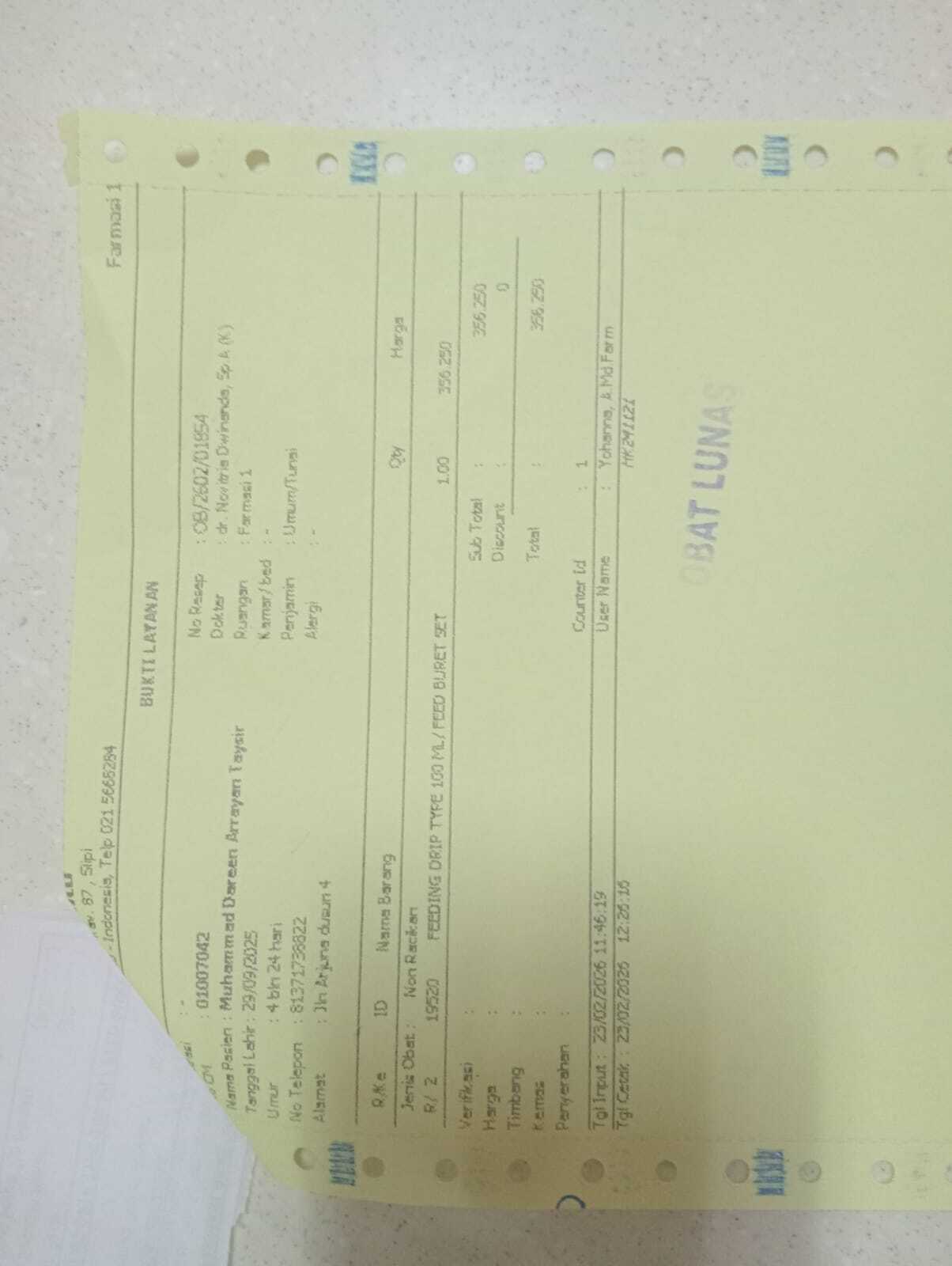 Dana digunakan untuk 1. Susu SGM gain 100 Rp106.000x11 = Rp1.166.000 2. Sped 3 ml Rp67.000 3. Reimburse kasa swab Rp17.000 4. Reimburse Hypafix Rp50.000 5. Reimburse sped 5 ml Rp71.000 6. Piding buret set Rp357.000 7. Biaya konsumsi kontrol Rp50,0002026-03-04 10:01:29