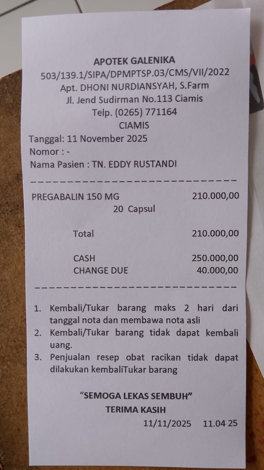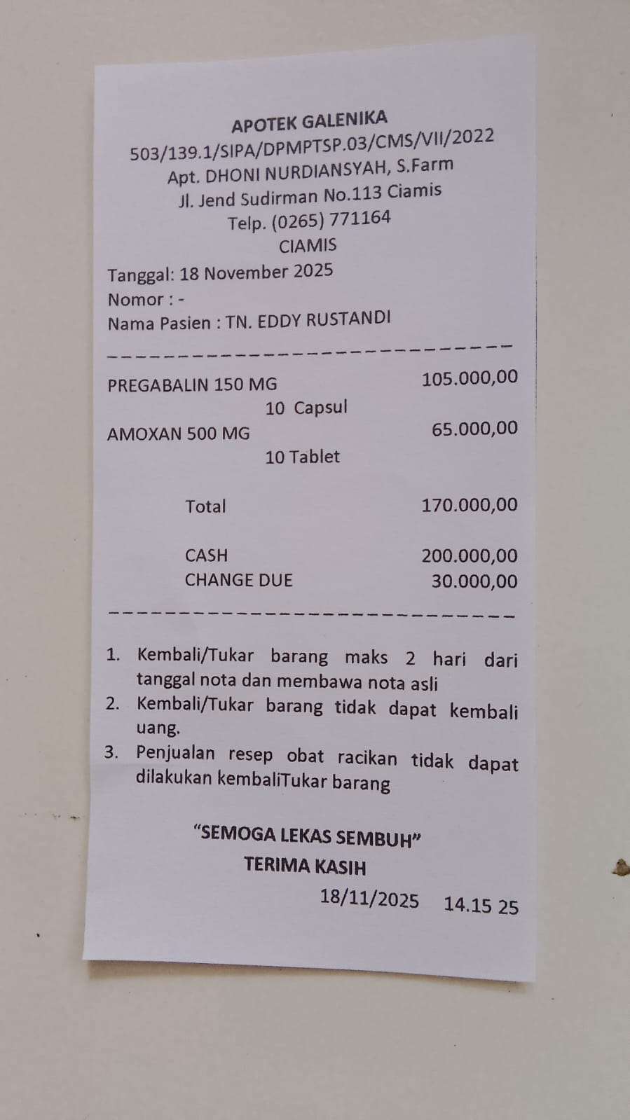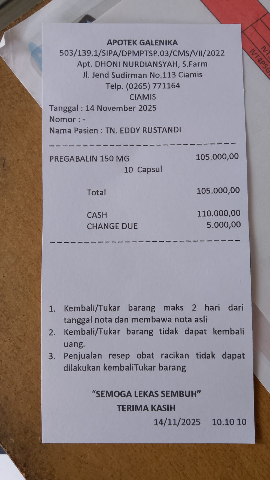 Syukurlah, kondisi saya saat ini ada sedikit peningkatan. Namun, dari tiga jenis obat yang seharusnya ditebus, saya hanya mampu membeli satu, yaitu obat penghilang rasa sakit (Pregabalin 150 mg).