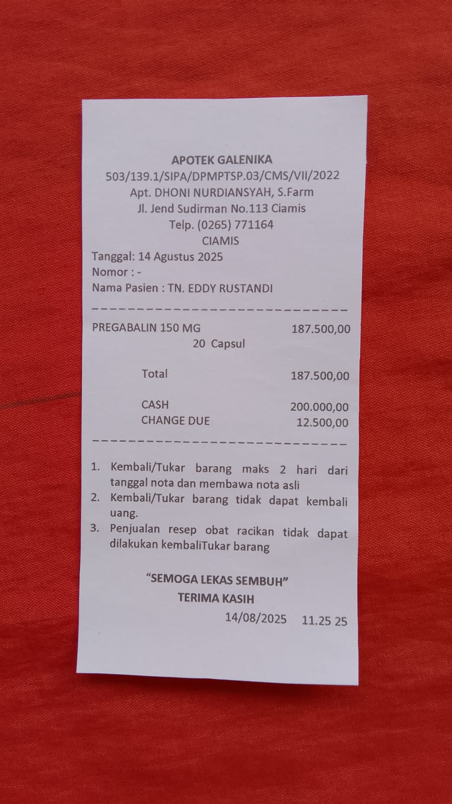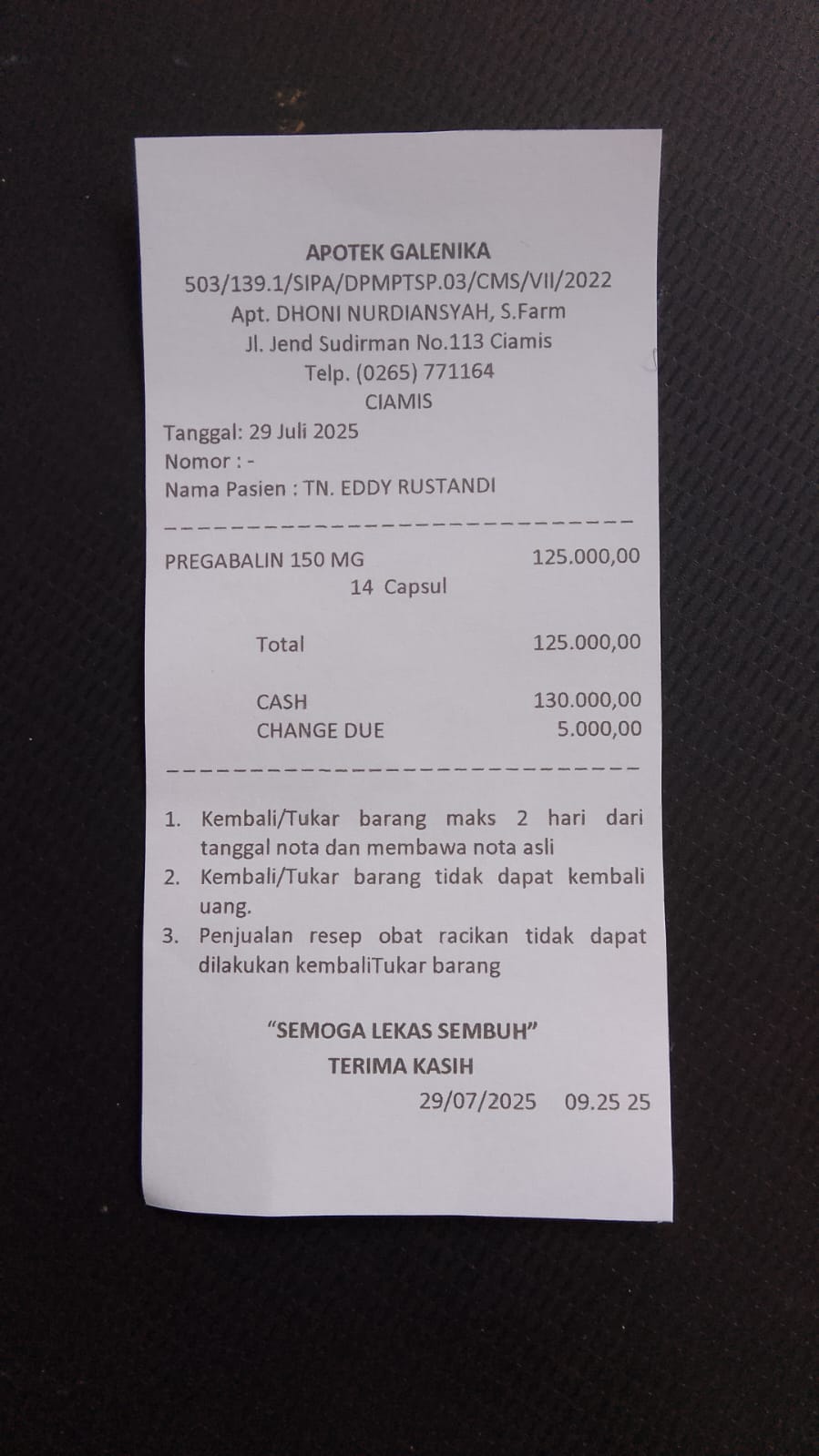 Dana digunakan untuk Pembelian obat pregablin 150mg 15 kapsul2025-05-15 11:20:45