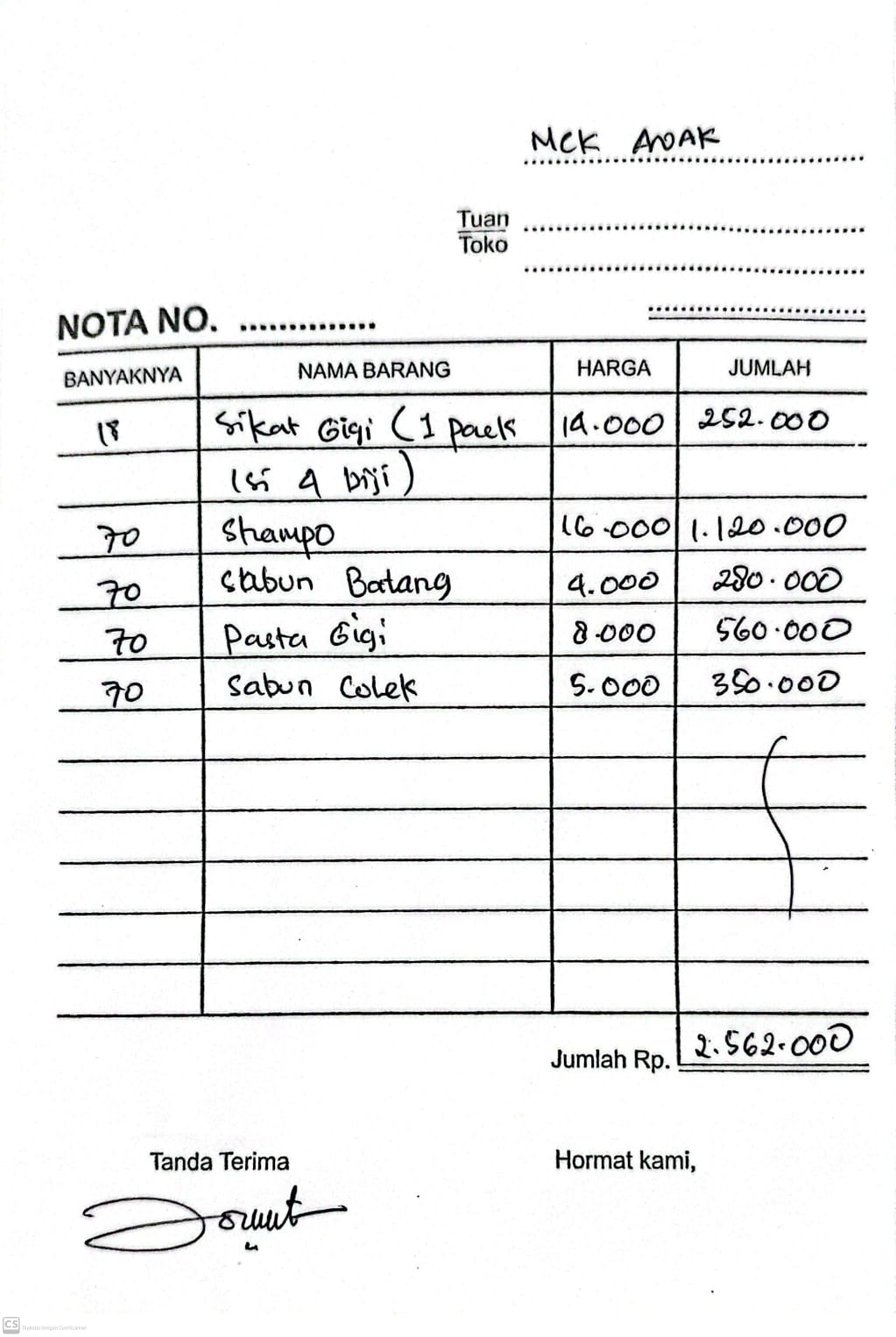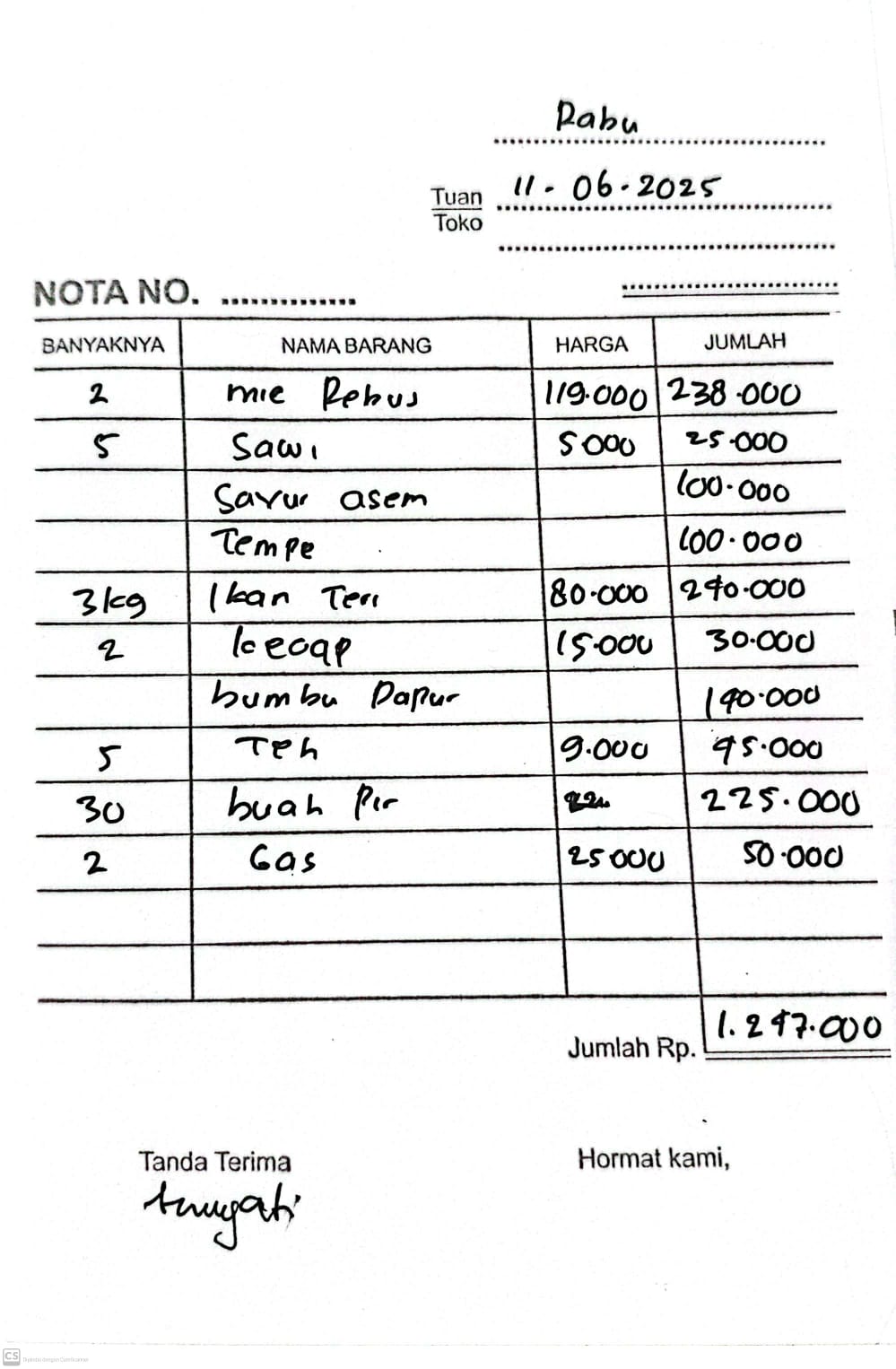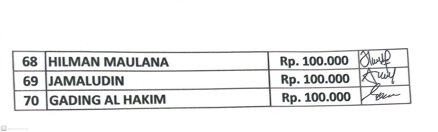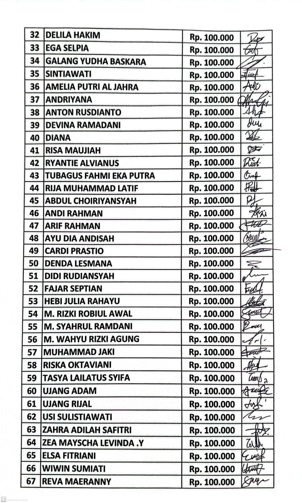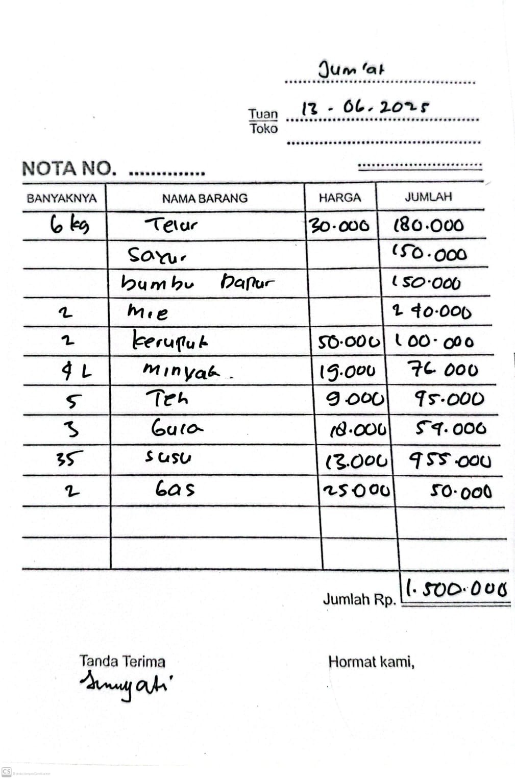 Dana digunakan untuk 1. Biaya Makan 24 hari, Rp480.000 x 70anak = Rp33.600.000 2. Laptop ideapad slim 3 intel i5 Rp10.665.000 3. Beras 50kg Rp745.000 x 10 karung = Rp7.450.000 4. Kasur ukuran 120, Rp985.000 x 10set = Rp9.850.000 5. Jajan anak sebulan Rp100.000 x 70 anak = Rp7.000.000 6. Biaya listrik Ro1.843.200 7. Peralatan mandi anak Rp35.000 x 70 anak= Rp2.450.0002025-05-30 15:50:42