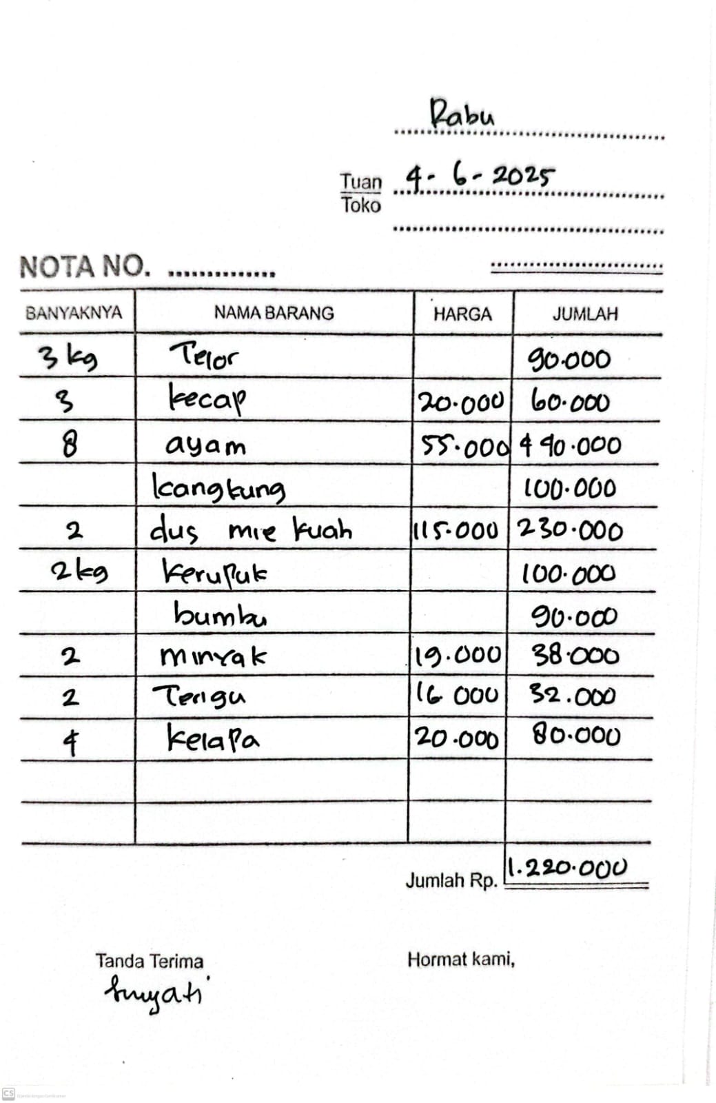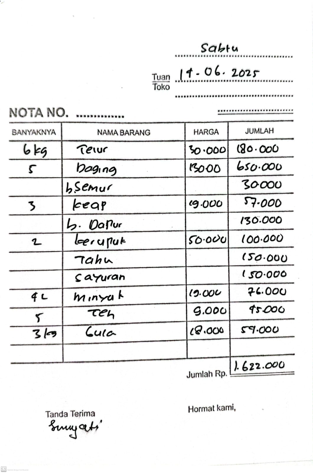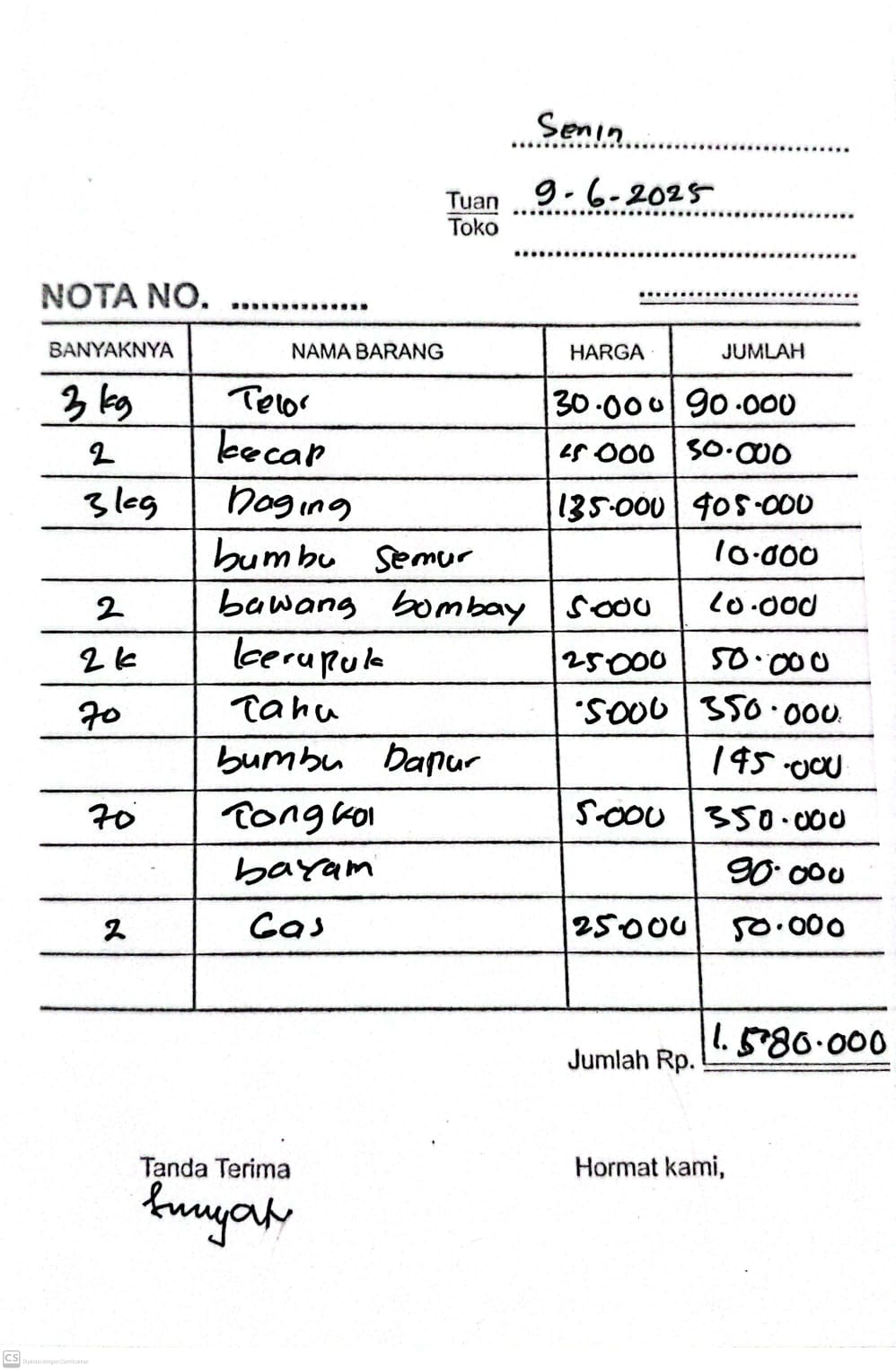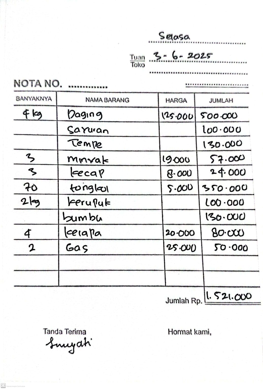 Dana digunakan untuk 1. Biaya Makan 24 hari, Rp480.000 x 70anak = Rp33.600.000 2. Laptop ideapad slim 3 intel i5 Rp10.665.000 3. Beras 50kg Rp745.000 x 10 karung = Rp7.450.000 4. Kasur ukuran 120, Rp985.000 x 10set = Rp9.850.000 5. Jajan anak sebulan Rp100.000 x 70 anak = Rp7.000.000 6. Biaya listrik Ro1.843.200 7. Peralatan mandi anak Rp35.000 x 70 anak= Rp2.450.0002025-05-30 15:50:42