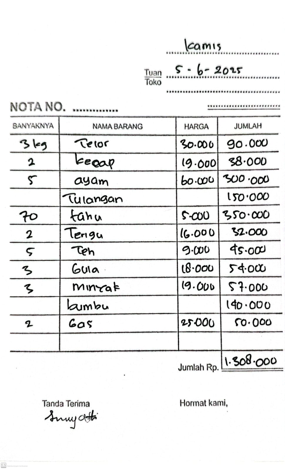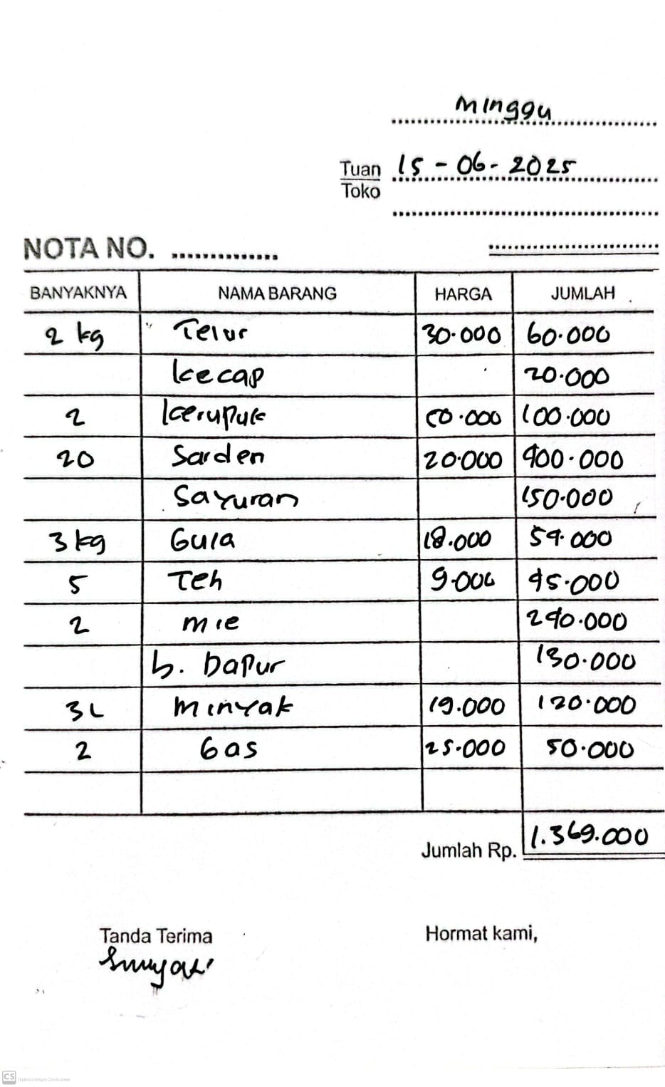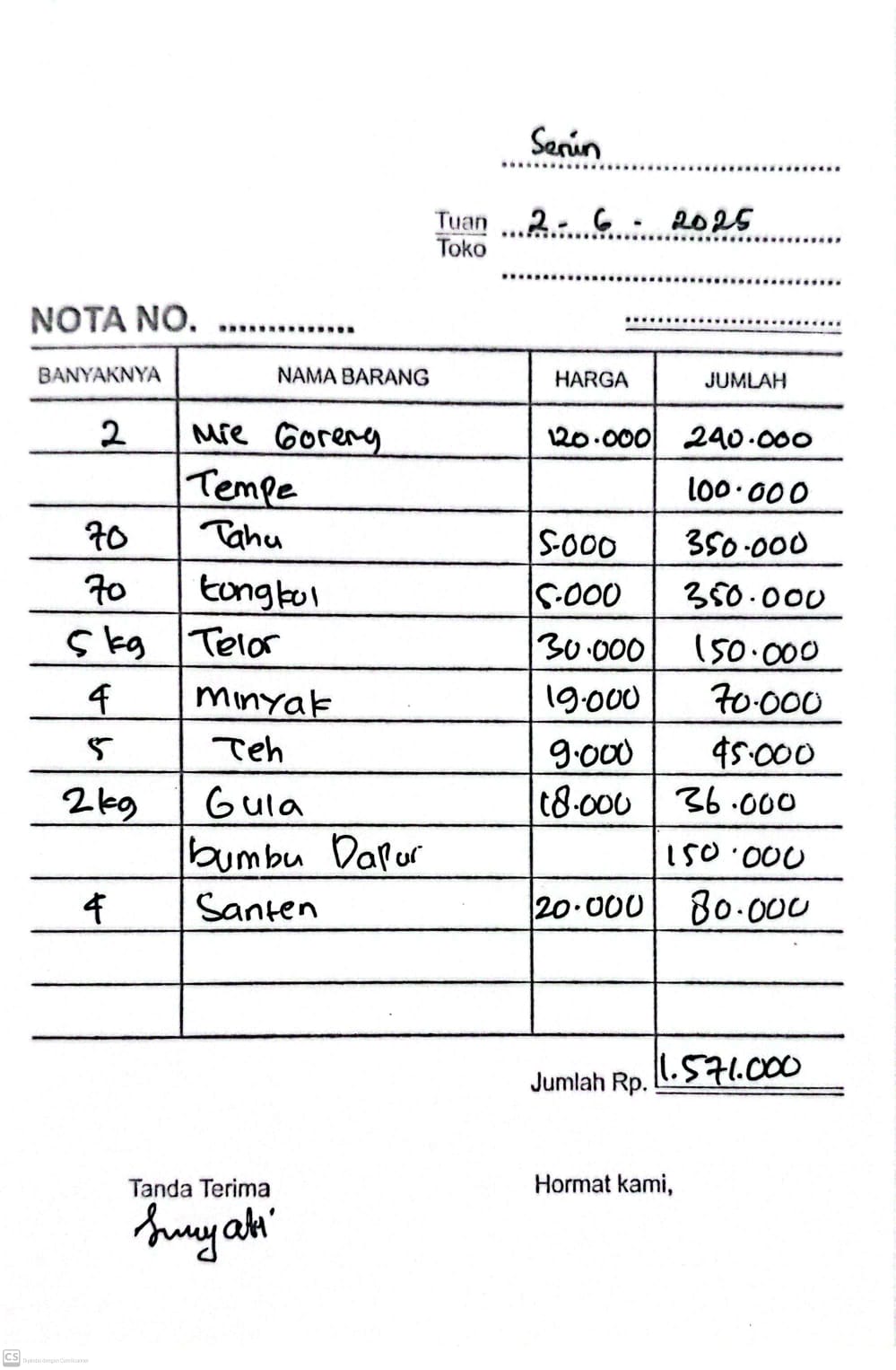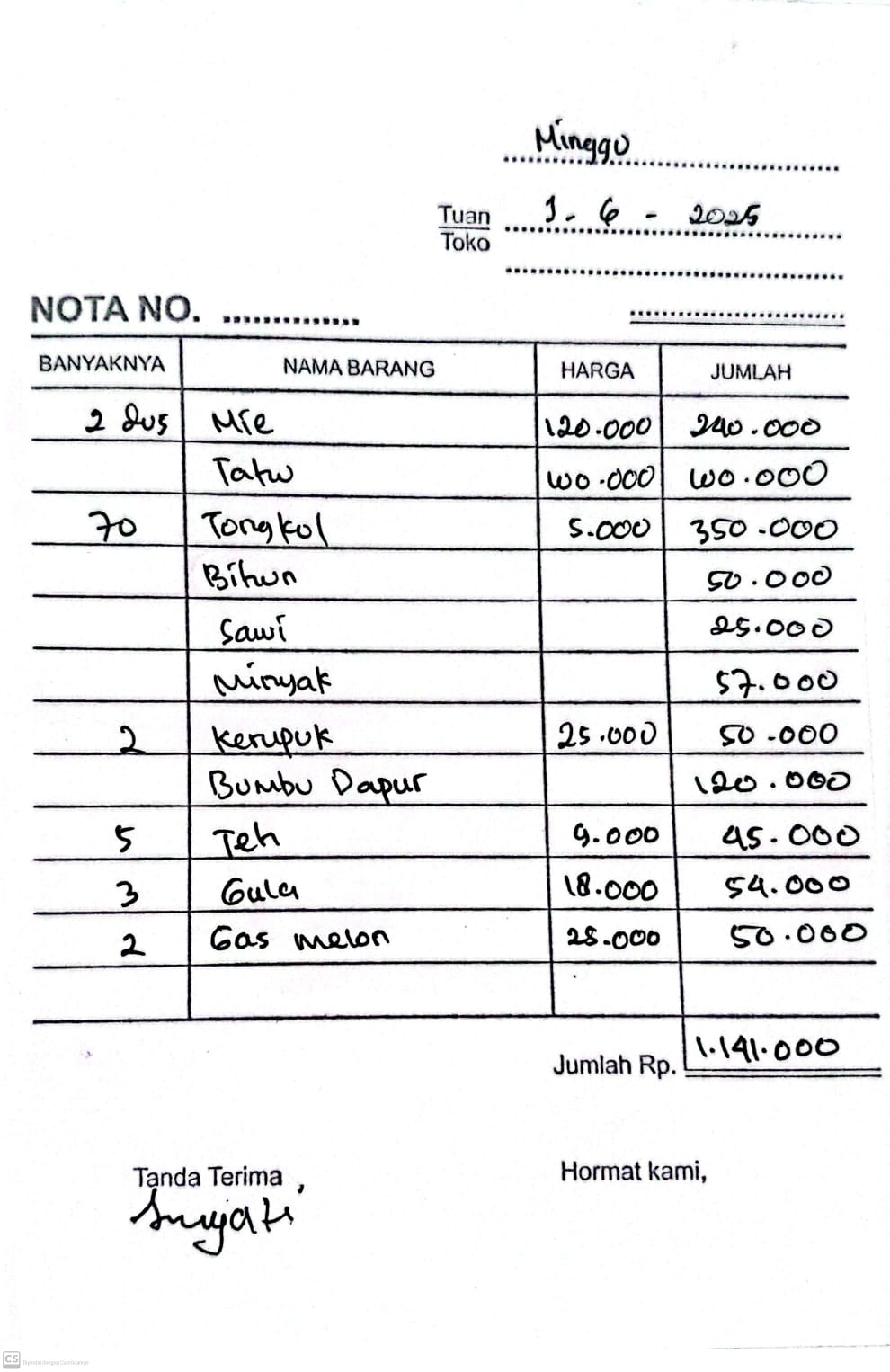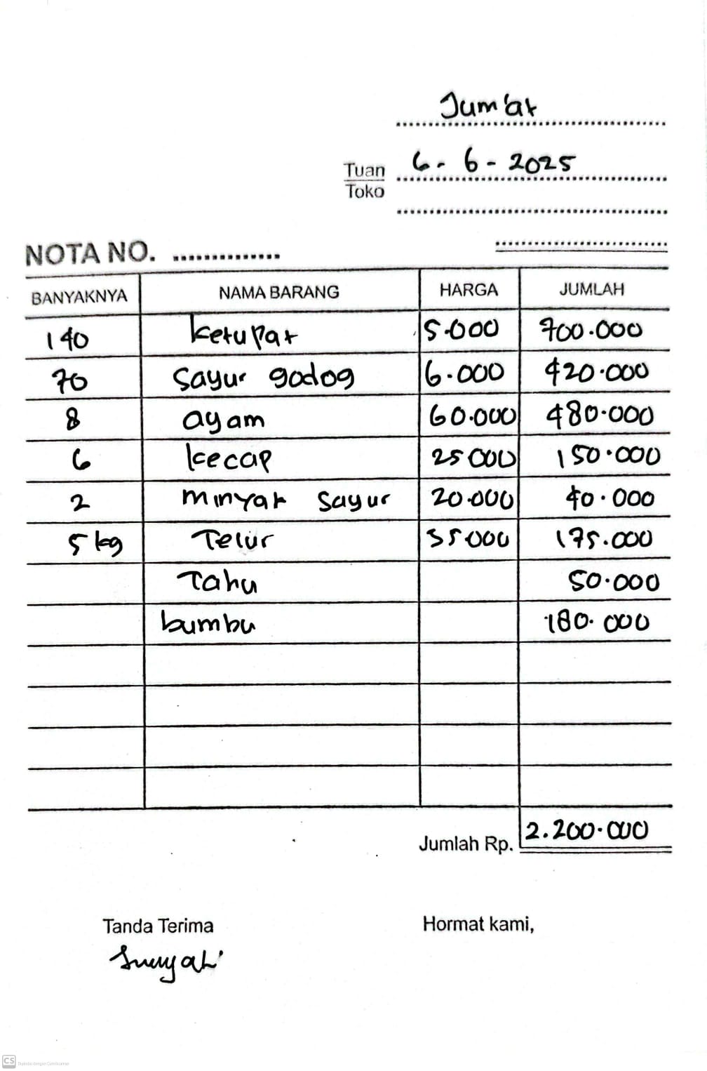 Dana digunakan untuk 1. Biaya Makan 24 hari, Rp480.000 x 70anak = Rp33.600.000 2. Laptop ideapad slim 3 intel i5 Rp10.665.000 3. Beras 50kg Rp745.000 x 10 karung = Rp7.450.000 4. Kasur ukuran 120, Rp985.000 x 10set = Rp9.850.000 5. Jajan anak sebulan Rp100.000 x 70 anak = Rp7.000.000 6. Biaya listrik Ro1.843.200 7. Peralatan mandi anak Rp35.000 x 70 anak= Rp2.450.0002025-05-30 15:50:42