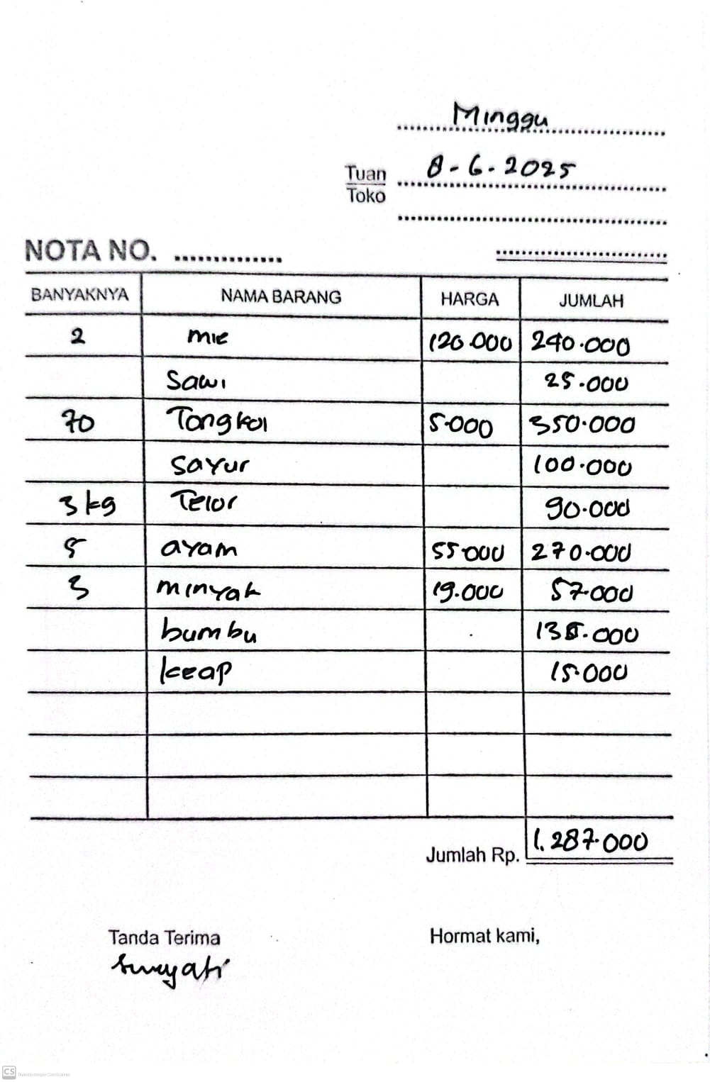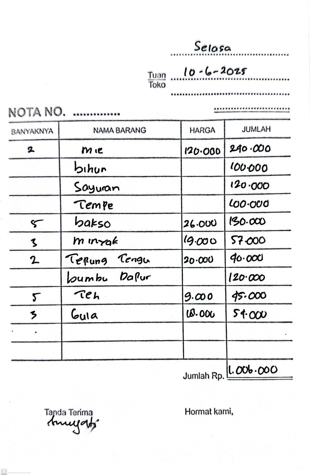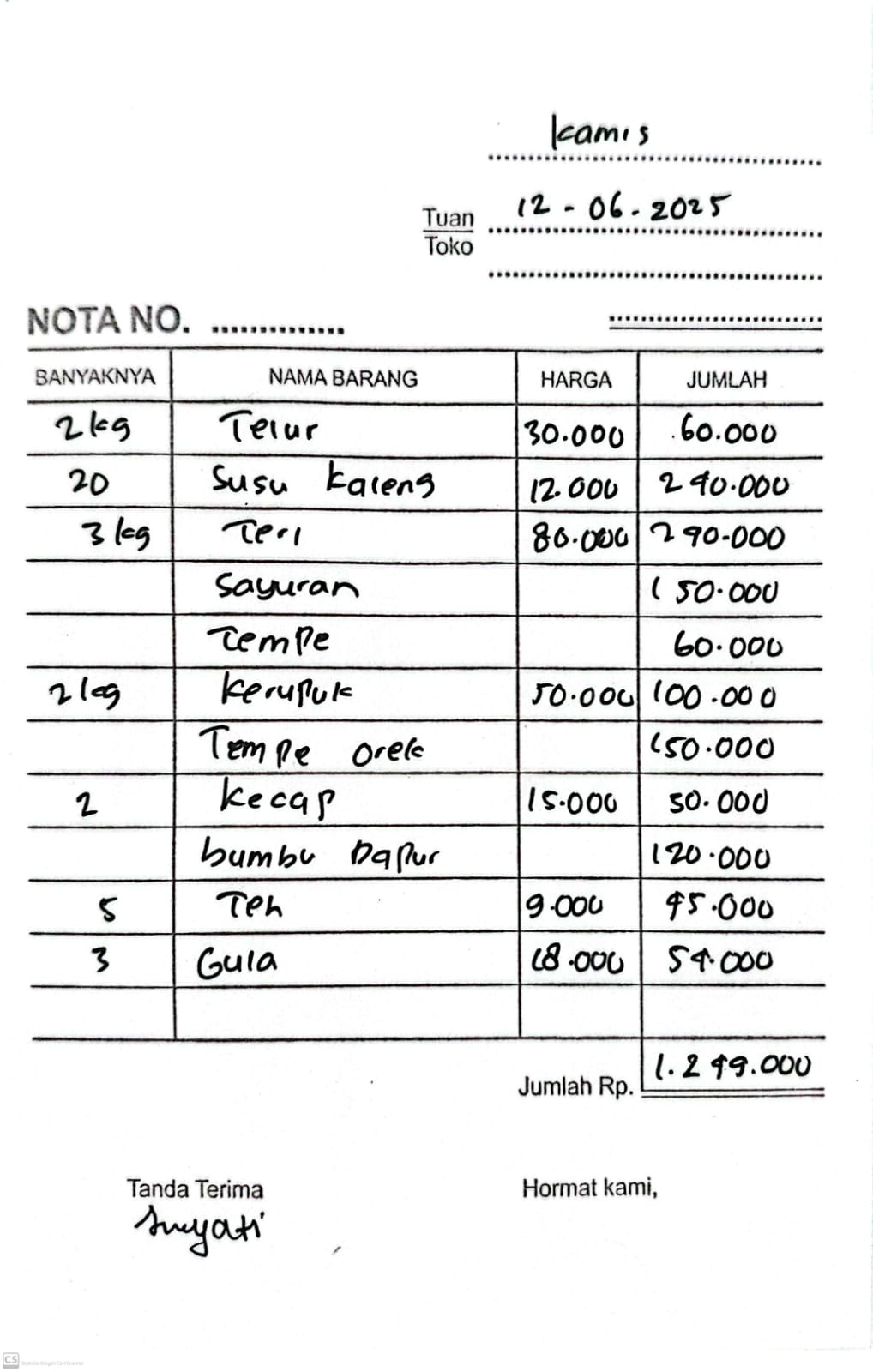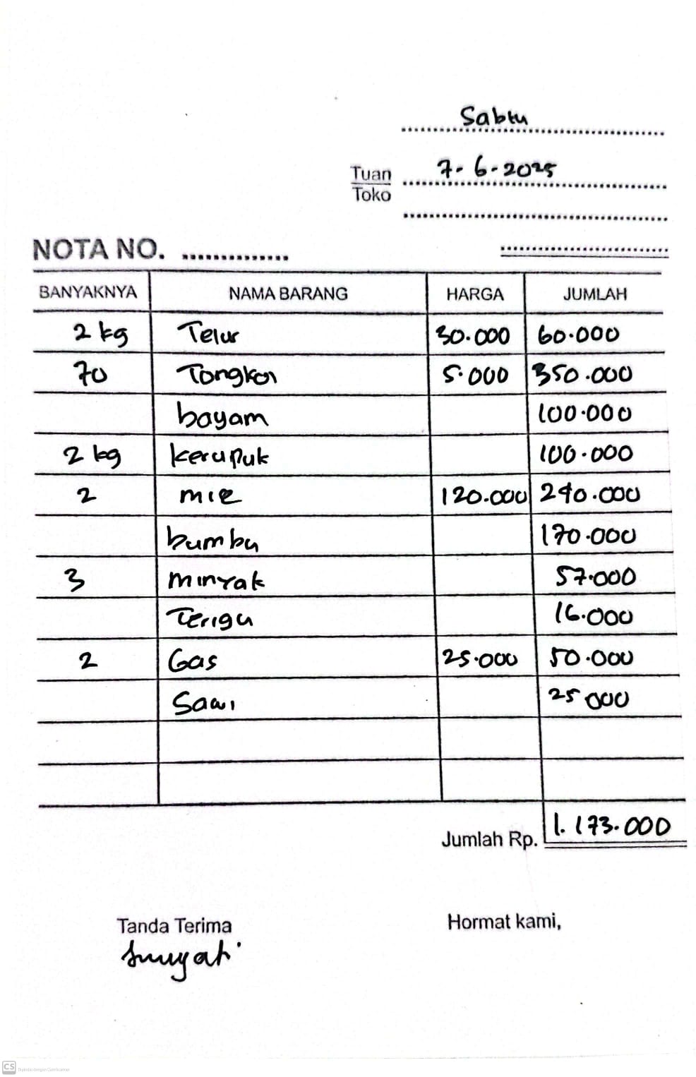 Dana digunakan untuk 1. Biaya Makan 24 hari, Rp480.000 x 70anak = Rp33.600.000 2. Laptop ideapad slim 3 intel i5 Rp10.665.000 3. Beras 50kg Rp745.000 x 10 karung = Rp7.450.000 4. Kasur ukuran 120, Rp985.000 x 10set = Rp9.850.000 5. Jajan anak sebulan Rp100.000 x 70 anak = Rp7.000.000 6. Biaya listrik Ro1.843.200 7. Peralatan mandi anak Rp35.000 x 70 anak= Rp2.450.0002025-05-30 15:50:42