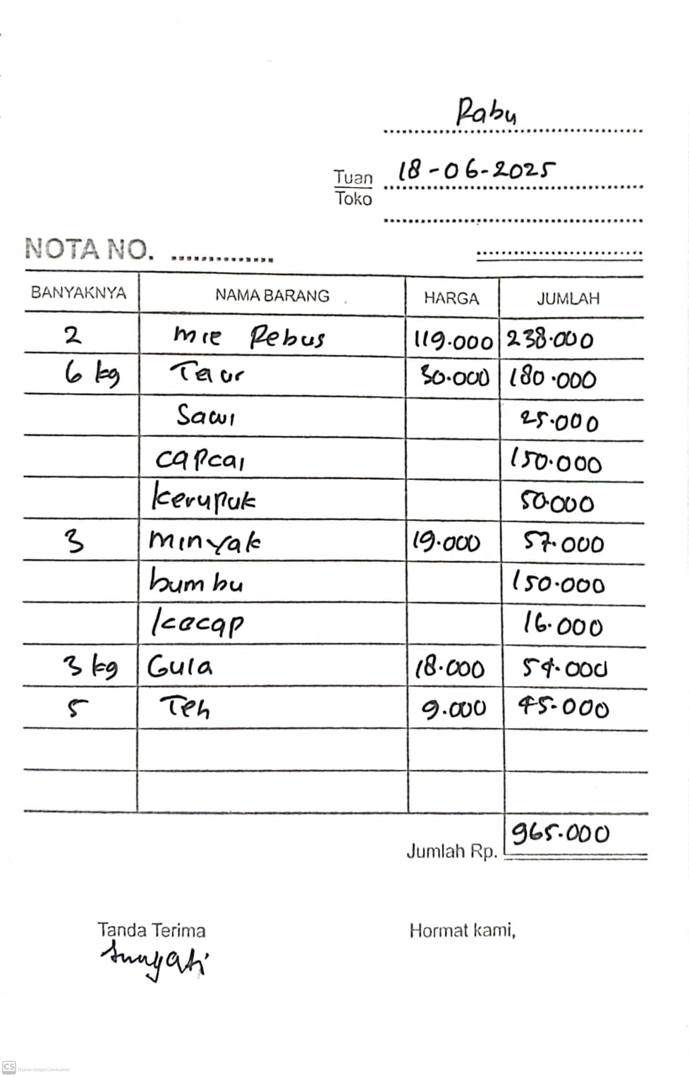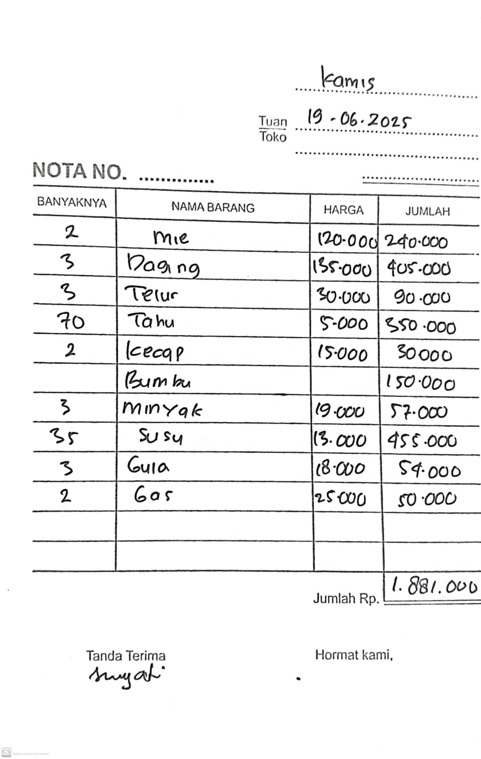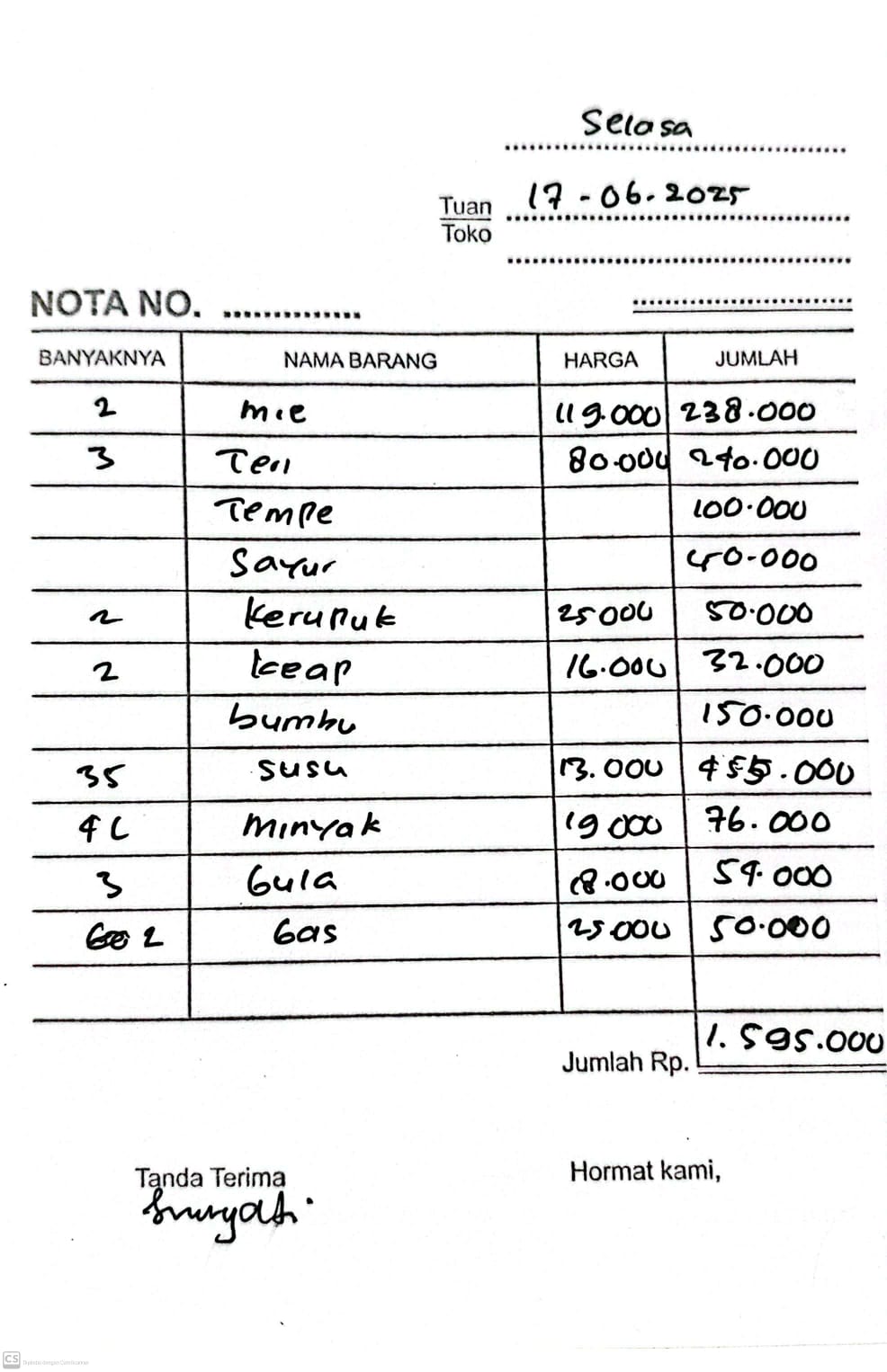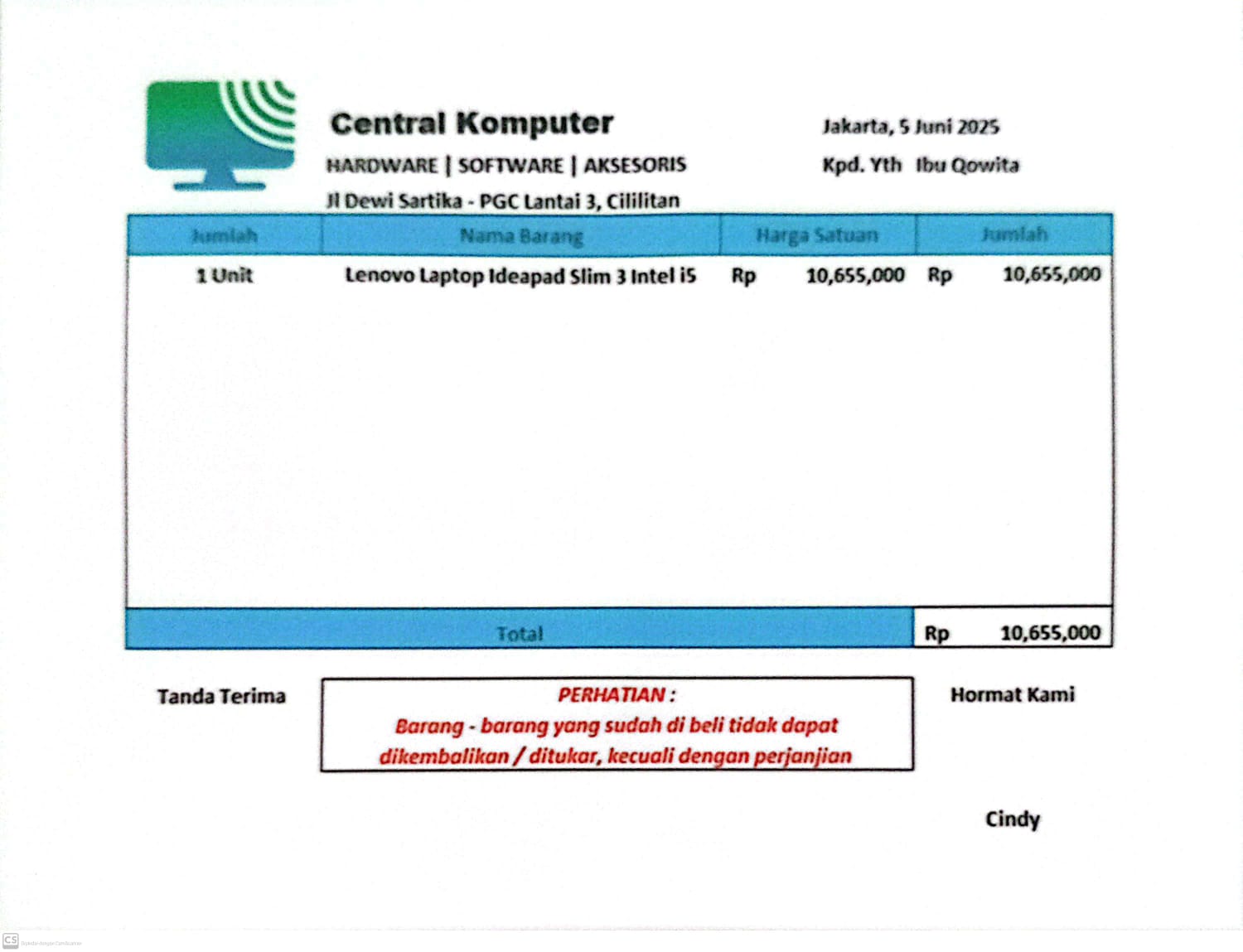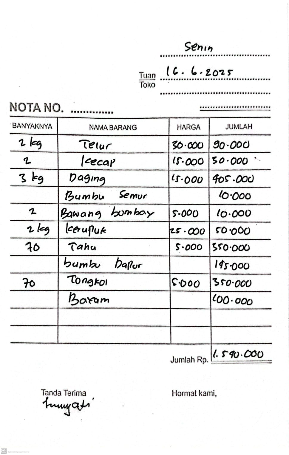 Dana digunakan untuk 1. Biaya Makan 24 hari, Rp480.000 x 70anak = Rp33.600.000 2. Laptop ideapad slim 3 intel i5 Rp10.665.000 3. Beras 50kg Rp745.000 x 10 karung = Rp7.450.000 4. Kasur ukuran 120, Rp985.000 x 10set = Rp9.850.000 5. Jajan anak sebulan Rp100.000 x 70 anak = Rp7.000.000 6. Biaya listrik Ro1.843.200 7. Peralatan mandi anak Rp35.000 x 70 anak= Rp2.450.0002025-05-30 15:50:42