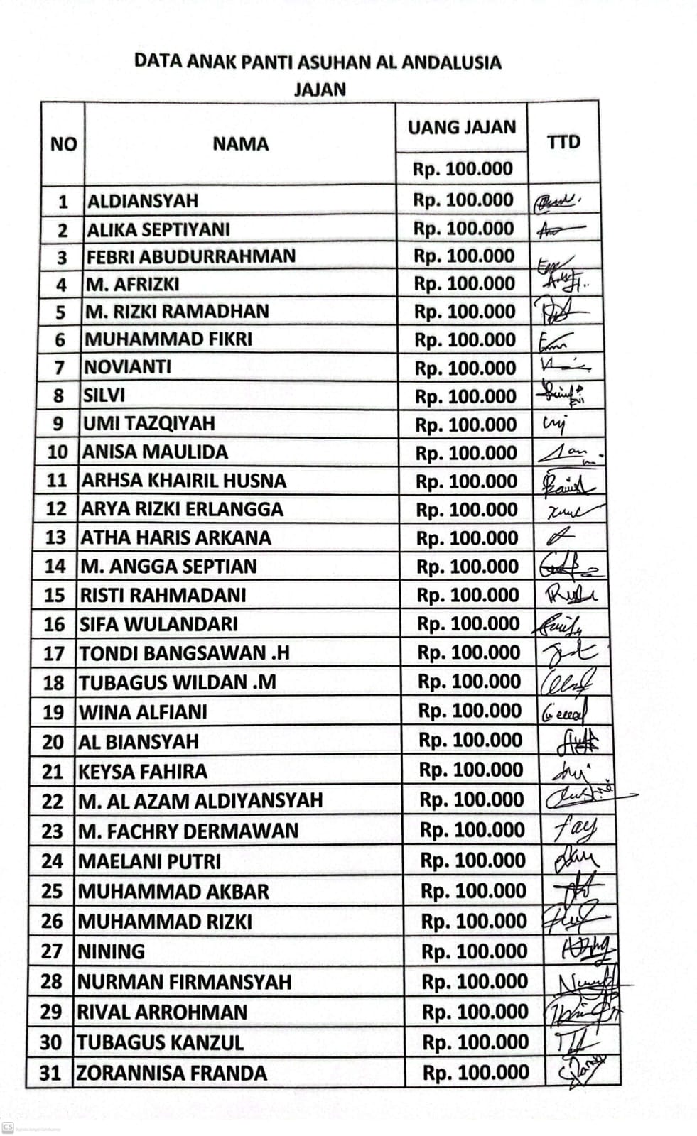 Dana bantuan dari #TemanBaik telah digunakan untuk kebutuhan operasional Panti Asuhan Andalusia. Mulai dari biaya makan anak-anak selama 24 hari, pembelian laptop untuk keperluan belajar dan administrasi, serta beras 50 Kg sebanyak 10 karung.