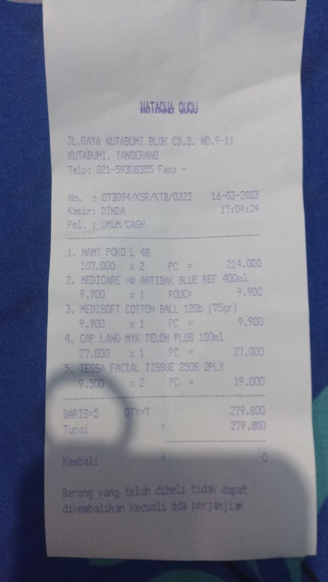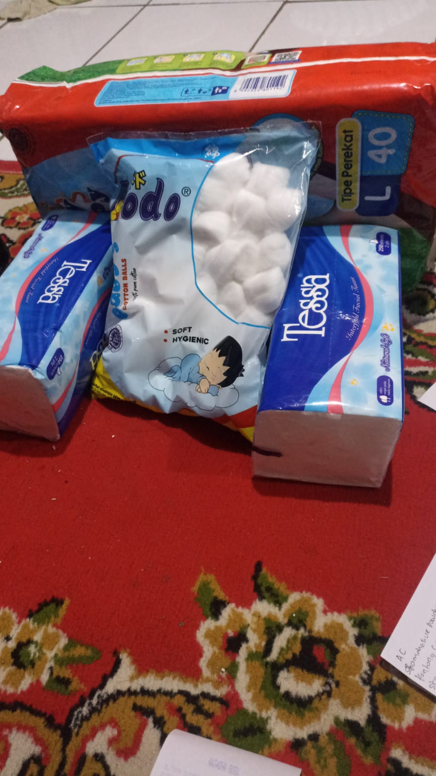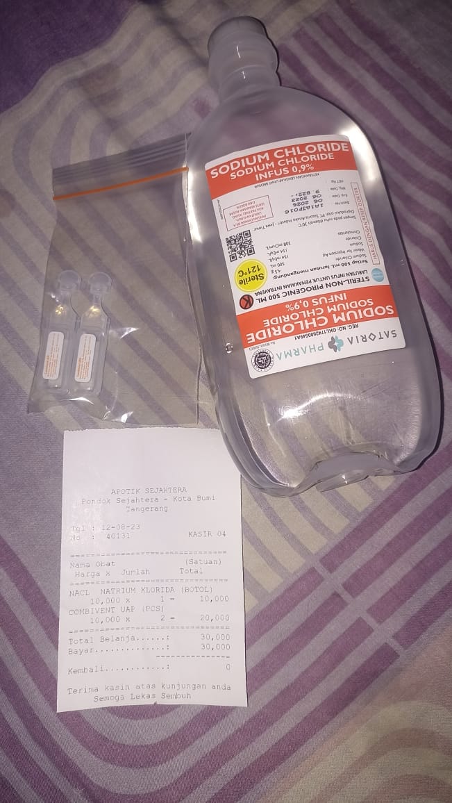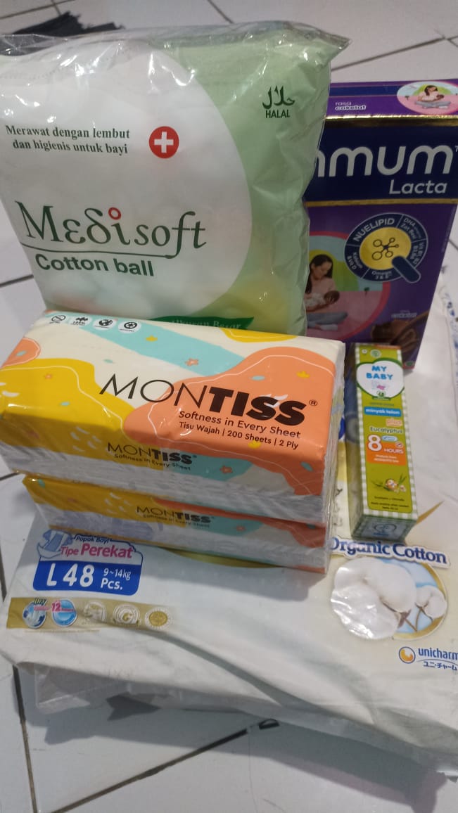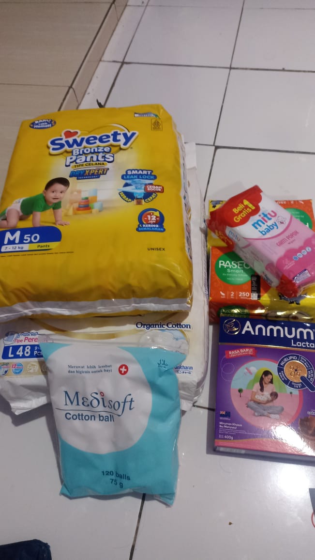 Dana digunakan untuk 1. Pampers Mamypoko perekat 107.000 x 5= Rp535.000 2. Pampers Mamypoko celana 89.000 x 6= Rp534.000 3. Bapathen 20 mg 68.000 x 8= Rp544.000 4. Susu almond untuk menyusui 6 kotak isi 15 sachet Rp200.000 5. Biaya obat-obatan yang tidak dicover BPJS Rp800.000 6. Biaya transportasi ke RS Rp300.000 7. Kapas Medisoft ball 14.500 x 15= Rp217.000 8. Tisu basah 15.000 x 4= Rp60.000 9. Tisu kering 9.000 x 4= Rp36.000 10. Tisu kering besar Rp40.0002023-05-02 16:14:11