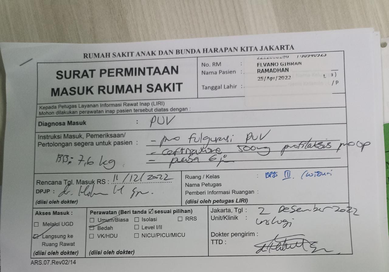 Hari ini Rabu tanggal 16 November 2022 Elvano kontrol ke poli bedah anak untuk melakukan tindakan busi. Dan nanti di hari Jumat tanggal 18 November 2022, Elvano kontrol lagi ke poli Urologi untuk periksa ISK ( Infeksi Saluran Kemih).